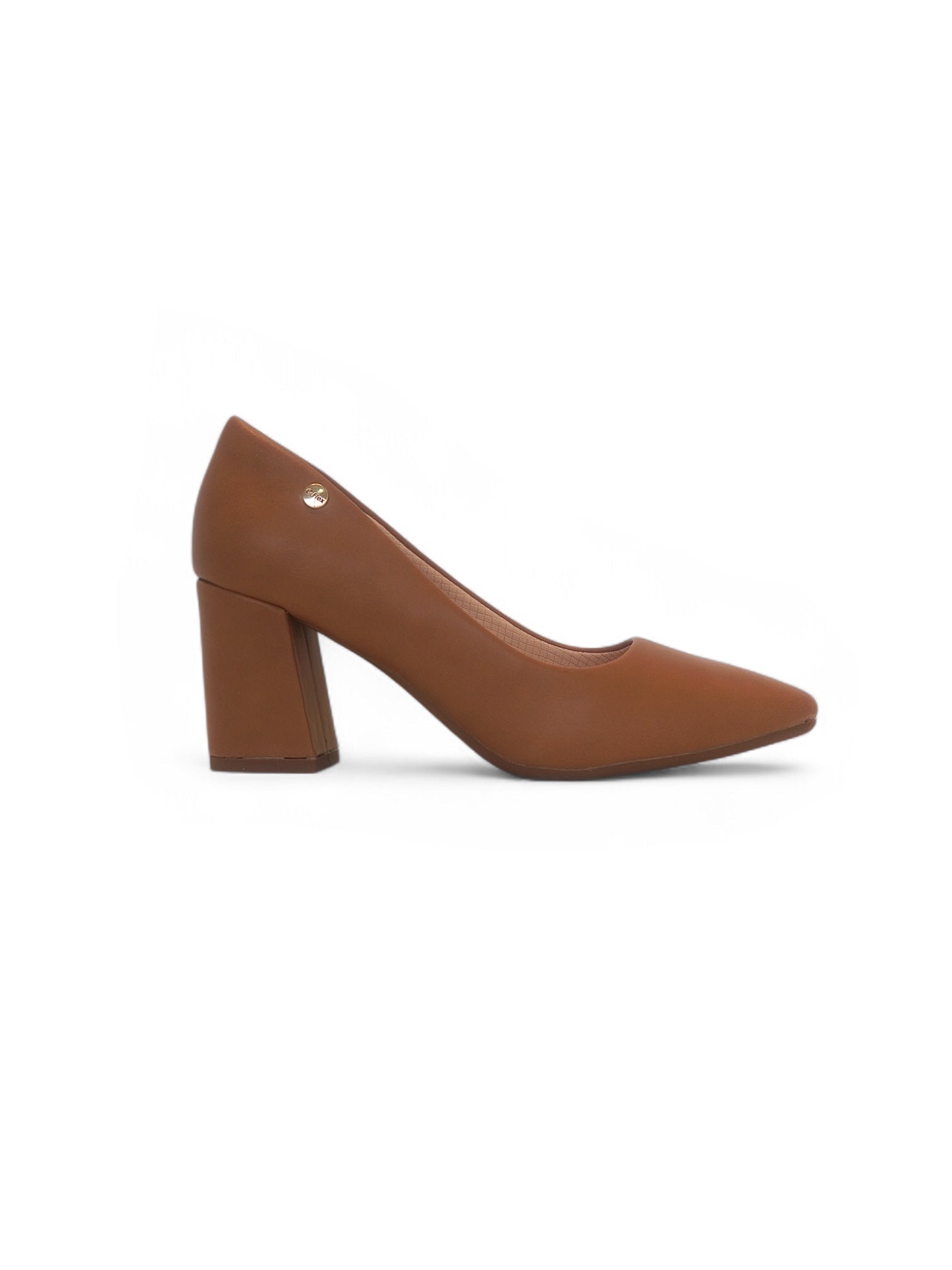 Este zapato de tacón grueso en color camel es la elección perfecta para mujeres que desean estilo, estabilidad y comodidad en un solo diseño. Su silueta clásica con punta semi afilada y tacón bloque alto lo convierte en un básico versátil para el día a día o para ocasiones especiales. El detalle metálico discreto en el costado añade un toque femenino y sofisticado.