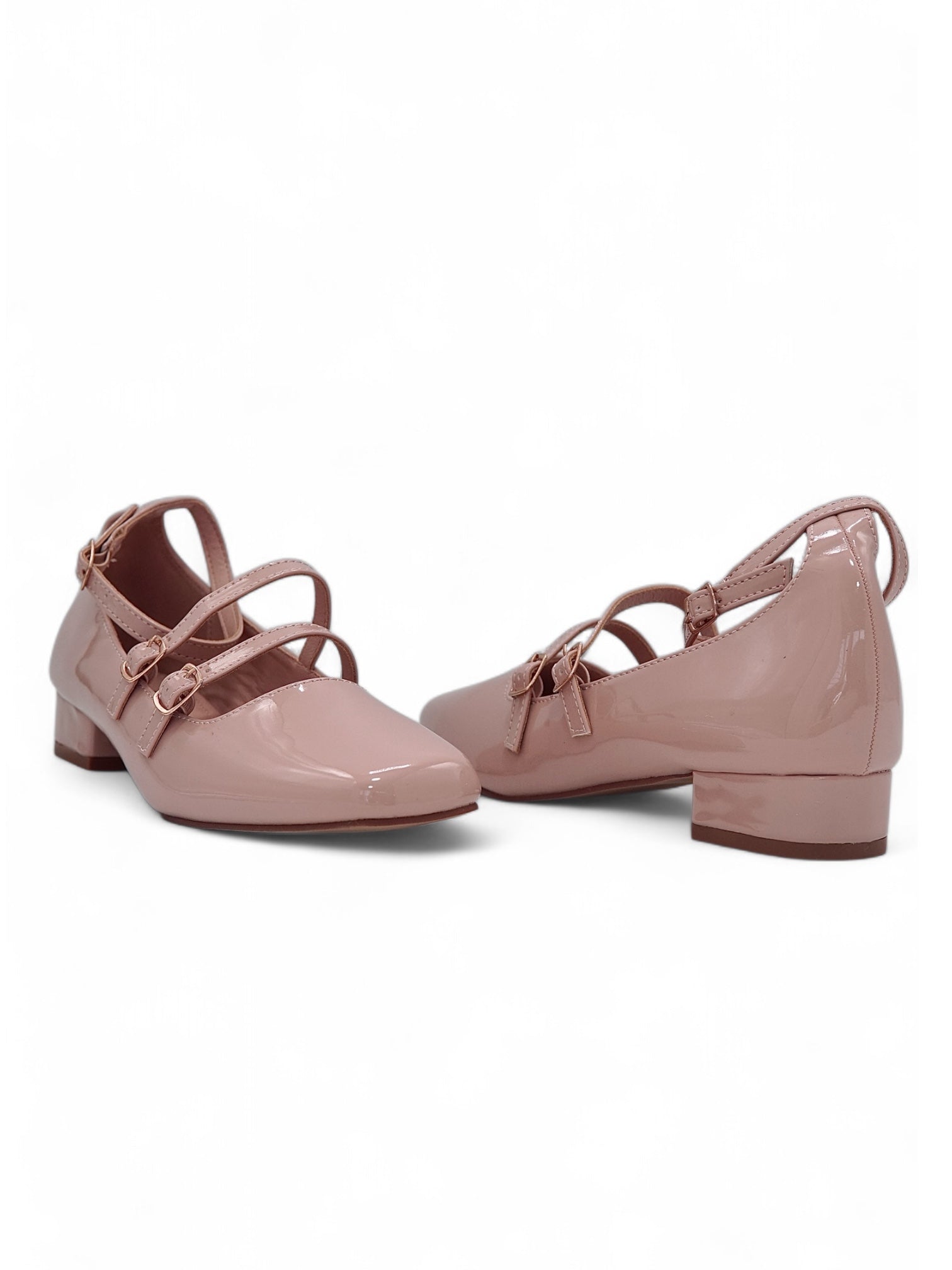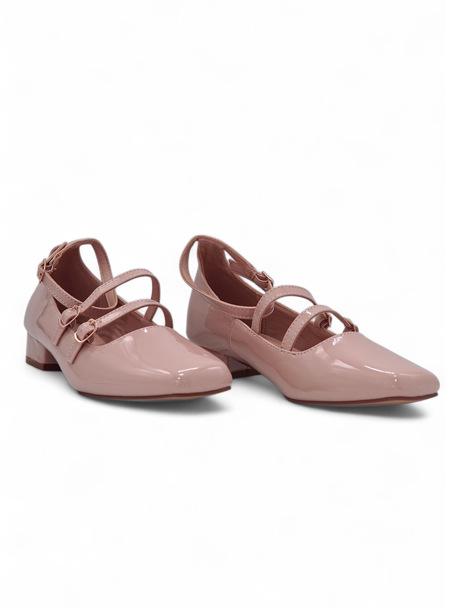 Inspirados en la moda parisina, estos Mary Jane nude rosado con triple correa son el equilibrio perfecto entre comodidad y elegancia. Su acabado brillante tipo charol aporta un toque delicado y femenino, mientras que el tacón bajo brinda estabilidad para usarlos todo el día. Perfectos para combinar con vestidos, faldas o jeans, aportando un aire vintage y sofisticado a cualquier look.