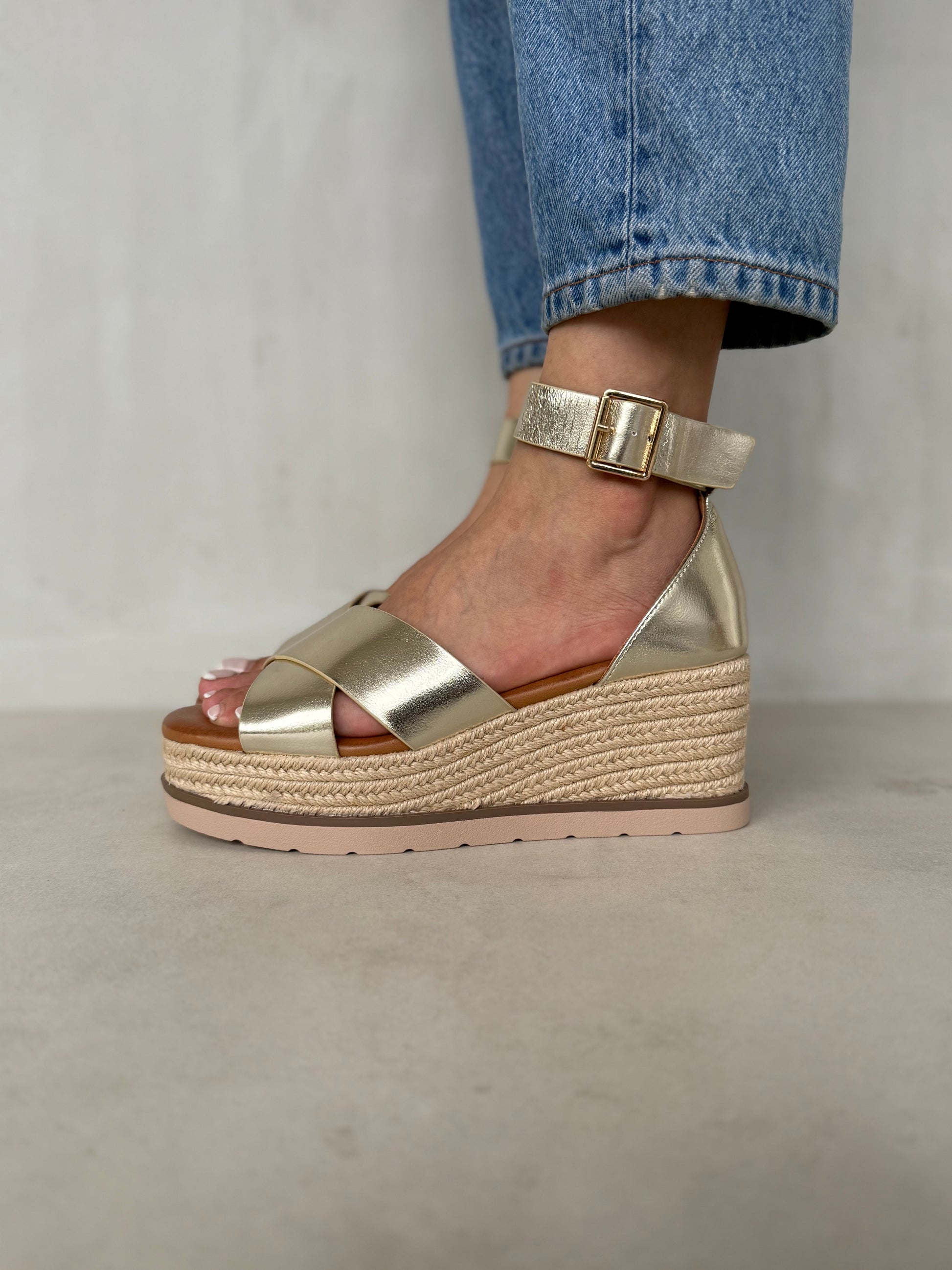 Elegí brillar con sutileza y confort con estas sandalias dorado champagne con cuña de yute. Su diseño con tiras anchas cruzadas y hebilla ajustable combina elegancia y practicidad, mientras que la plataforma con textura natural aporta ese toque veraniego que nunca pasa de moda. Perfectas para combinar con vestidos, faldas o looks casuales con un aire sofisticado.