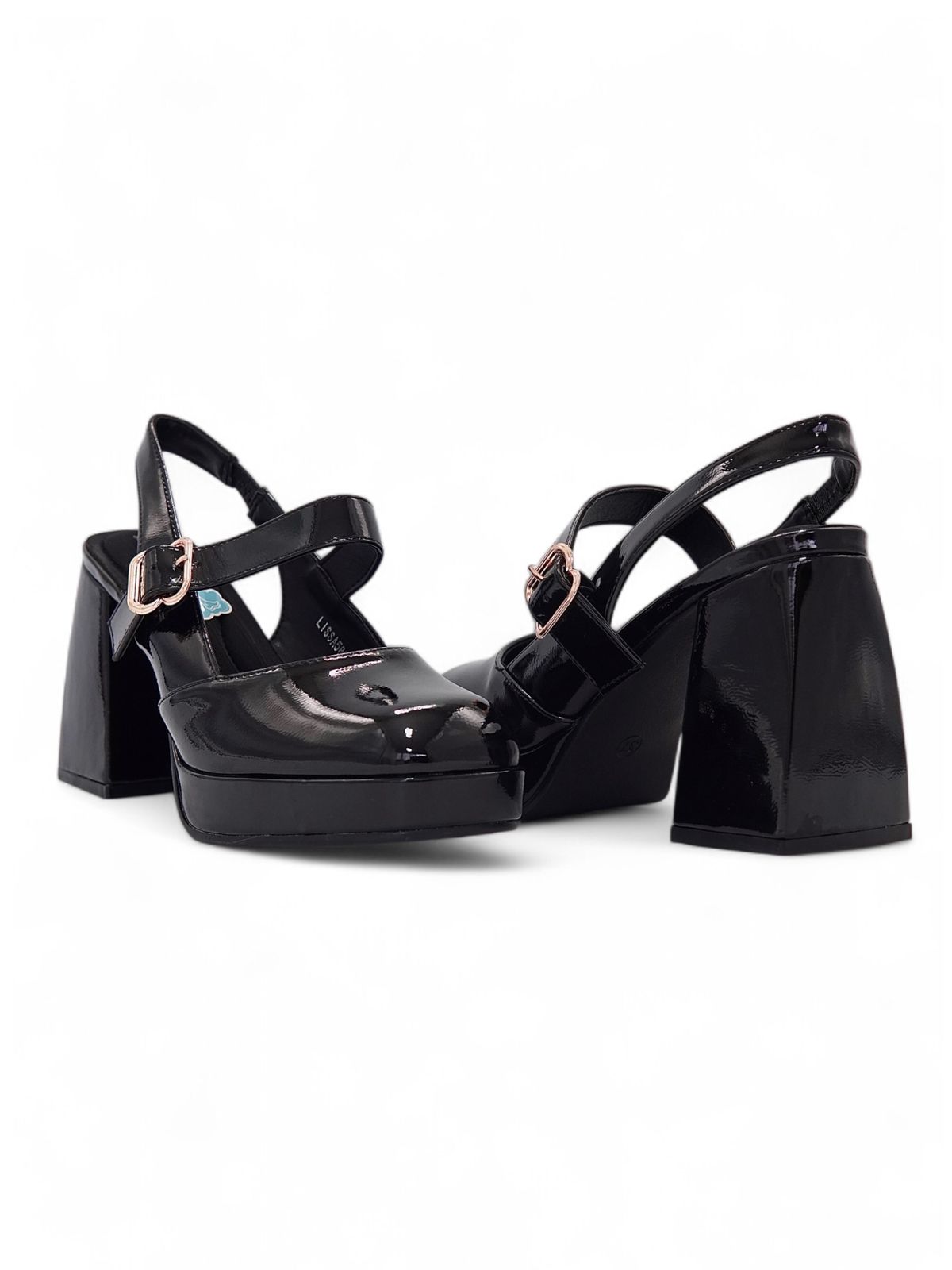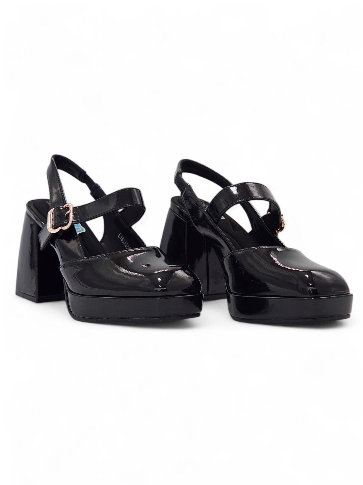 Estos zapatos negros con plataforma y tacón ancho estilo retro son el statement perfecto para elevar cualquier outfit. Con acabado en charol y detalles de hebilla metálica, combinan presencia, altura y actitud en un solo diseño.