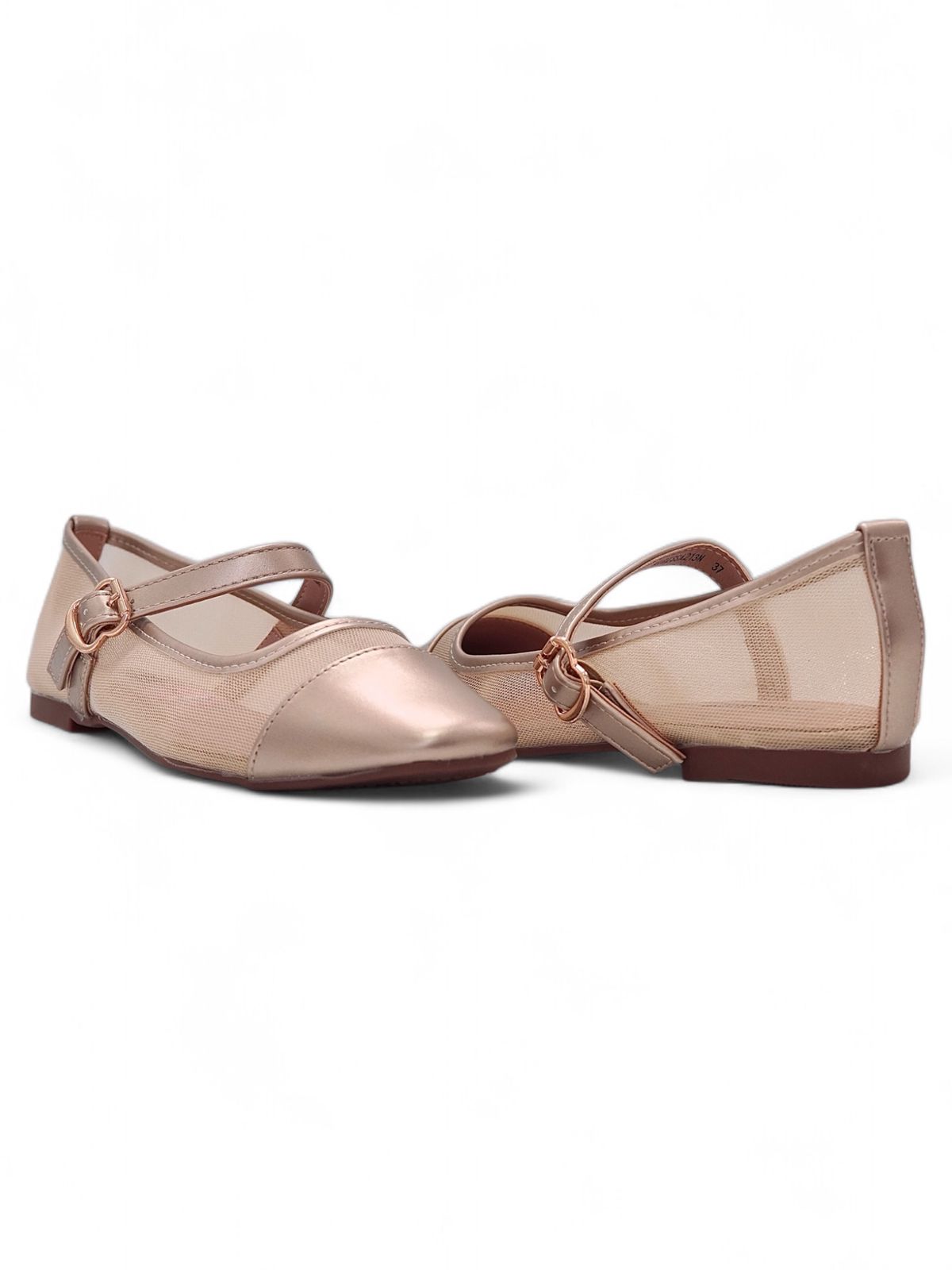 Estas bailarinas en tono nude con acabado satinado y cuerpo en malla ligera son la definición de delicadeza y comodidad. Su diseño con correa ajustable y punta cerrada estiliza el pie y aporta firmeza al caminar. Perfectas para complementar outfits elegantes o casuales en climas cálidos, ofreciendo una sensación fresca y ligera durante todo el día.