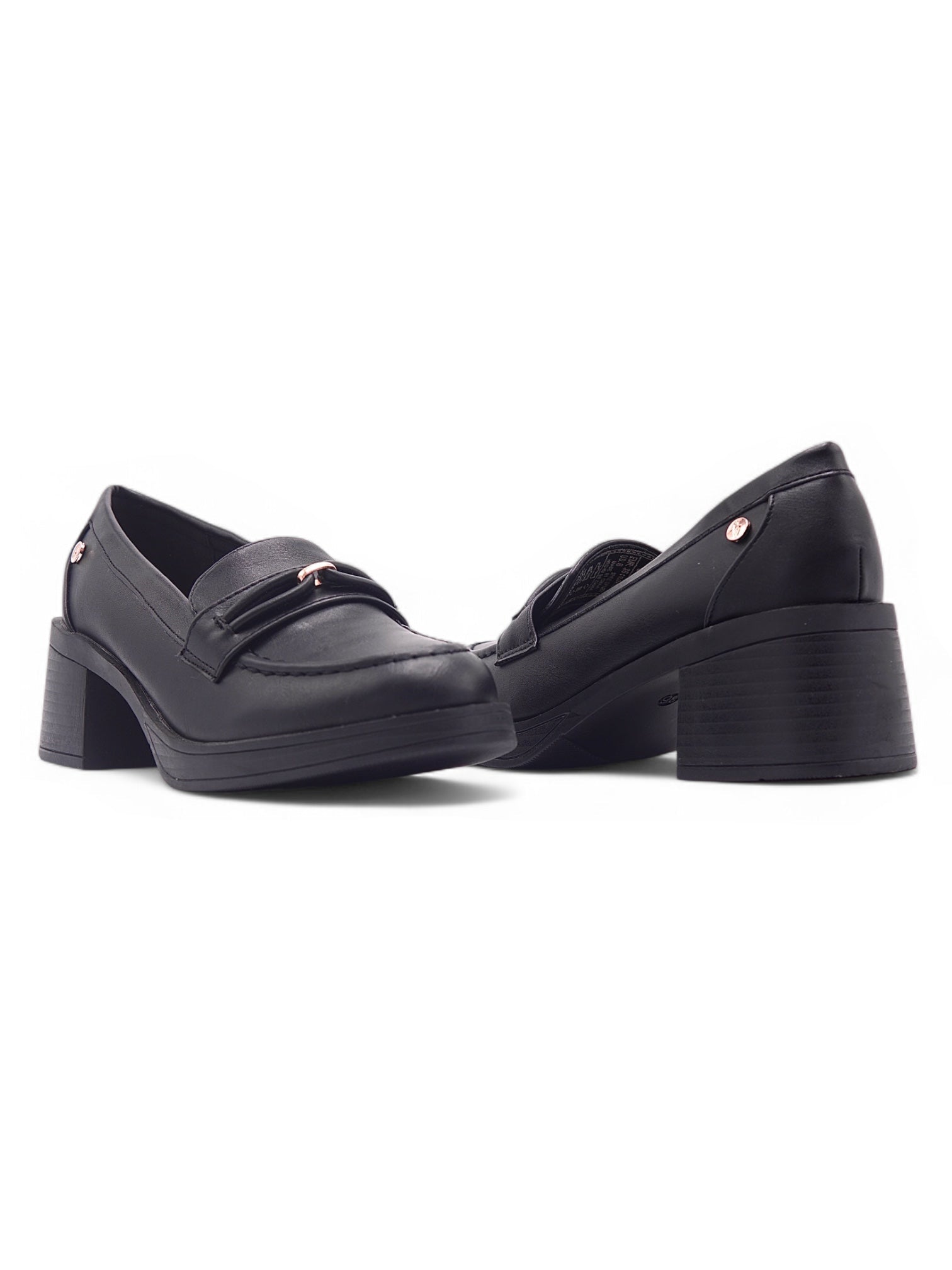 Estos mocasines negros para mujer fusionan un estilo clásico con toques modernos, ideales para un look profesional o casual elegante. El diseño cerrado con antifaz en el empeine aporta un aire sofisticado, mientras que el tacón bloque de altura media brinda equilibrio perfecto entre altura y confort. Fabricados con materiales sintéticos tipo piel, su acabado mate y su suela con textura los convierten en un básico imprescindible en tu guardarropa.