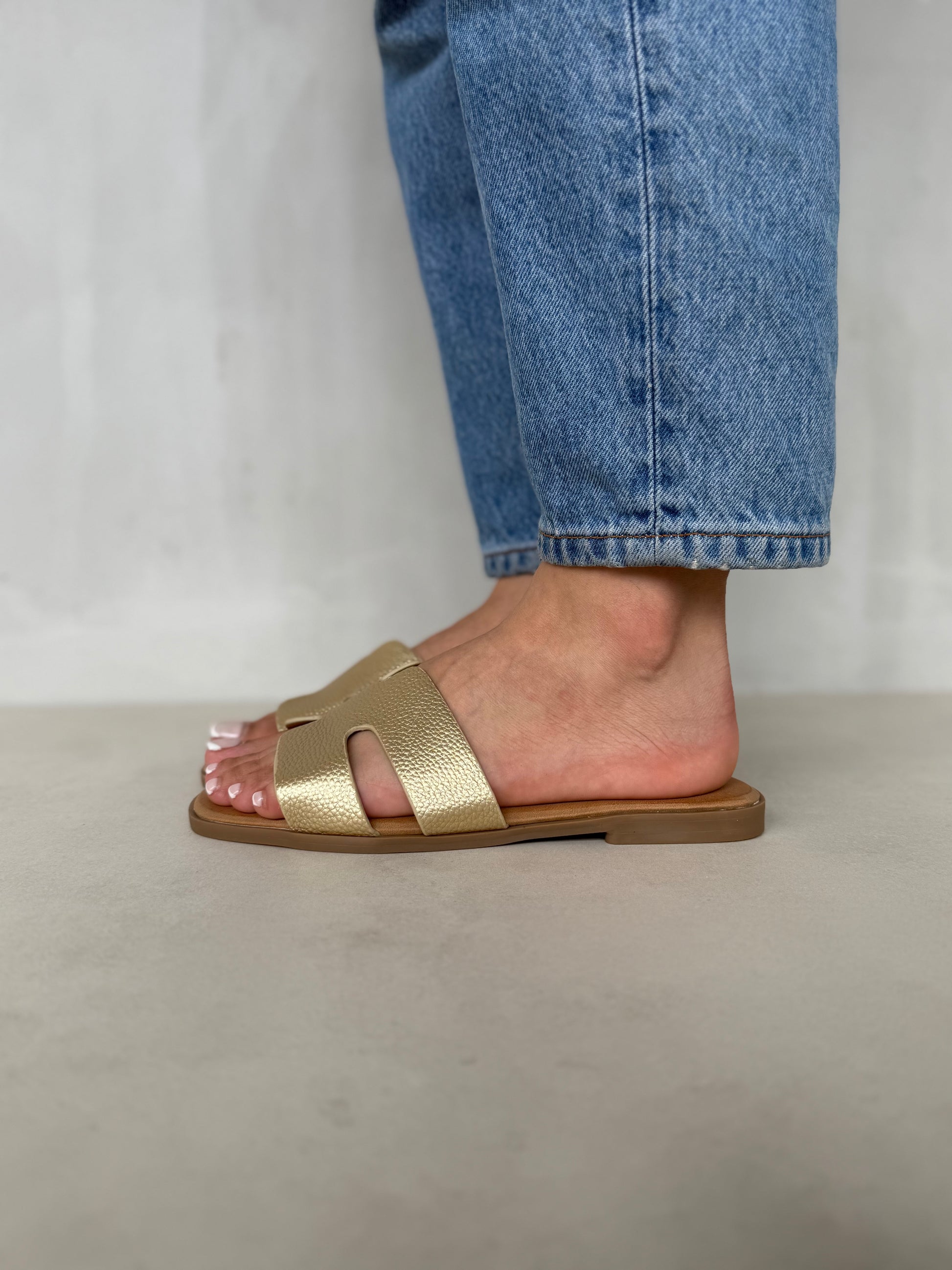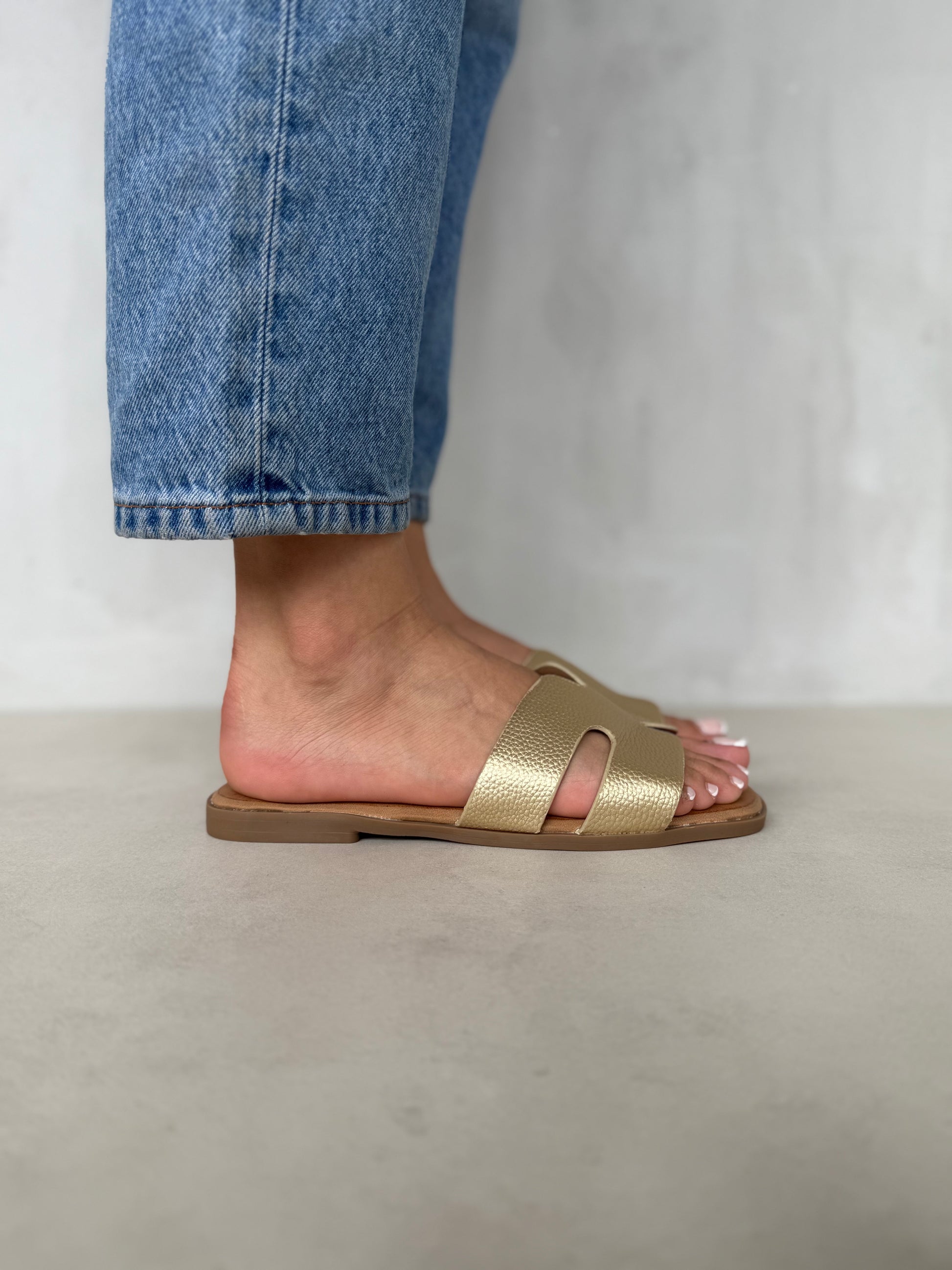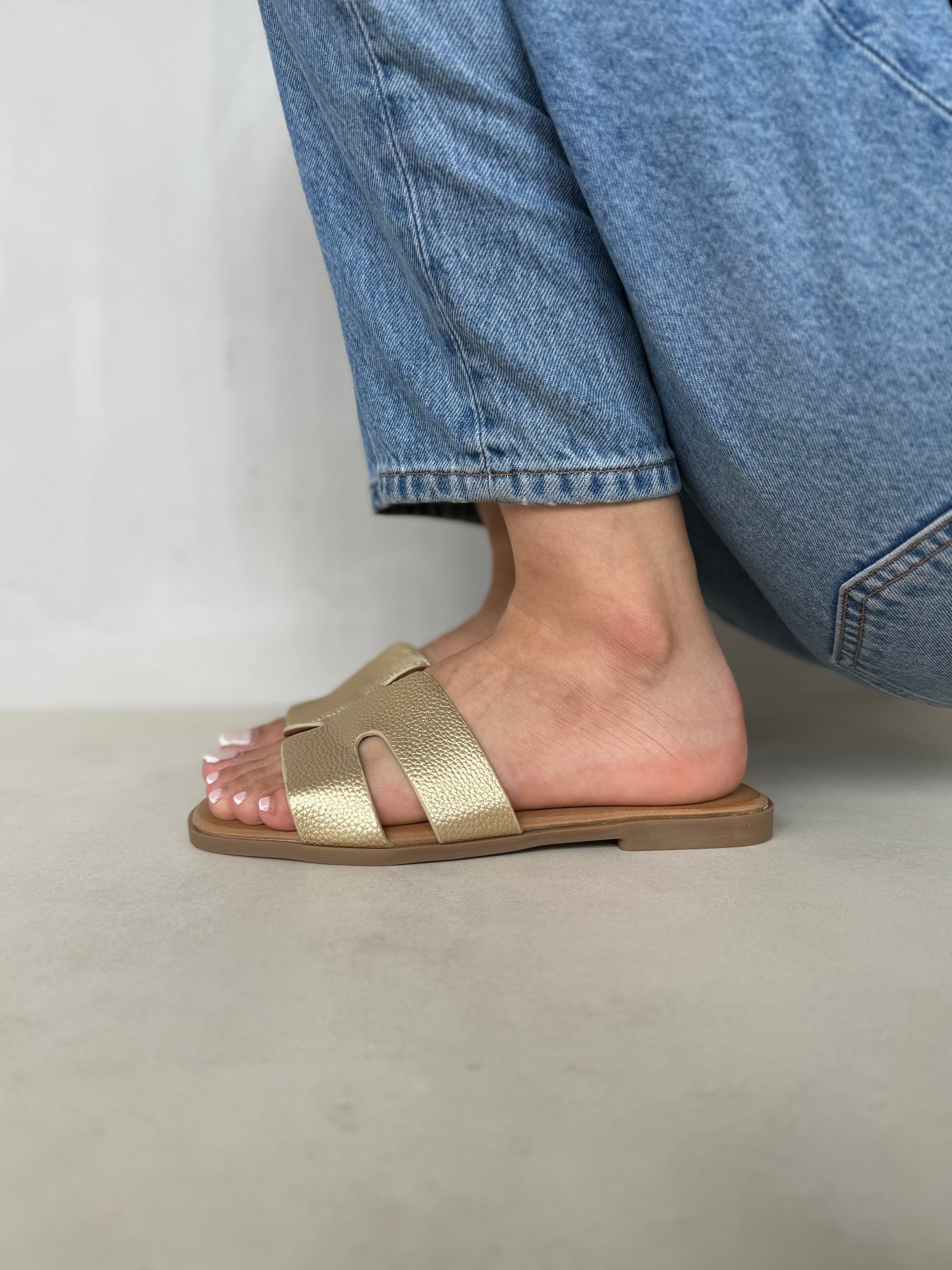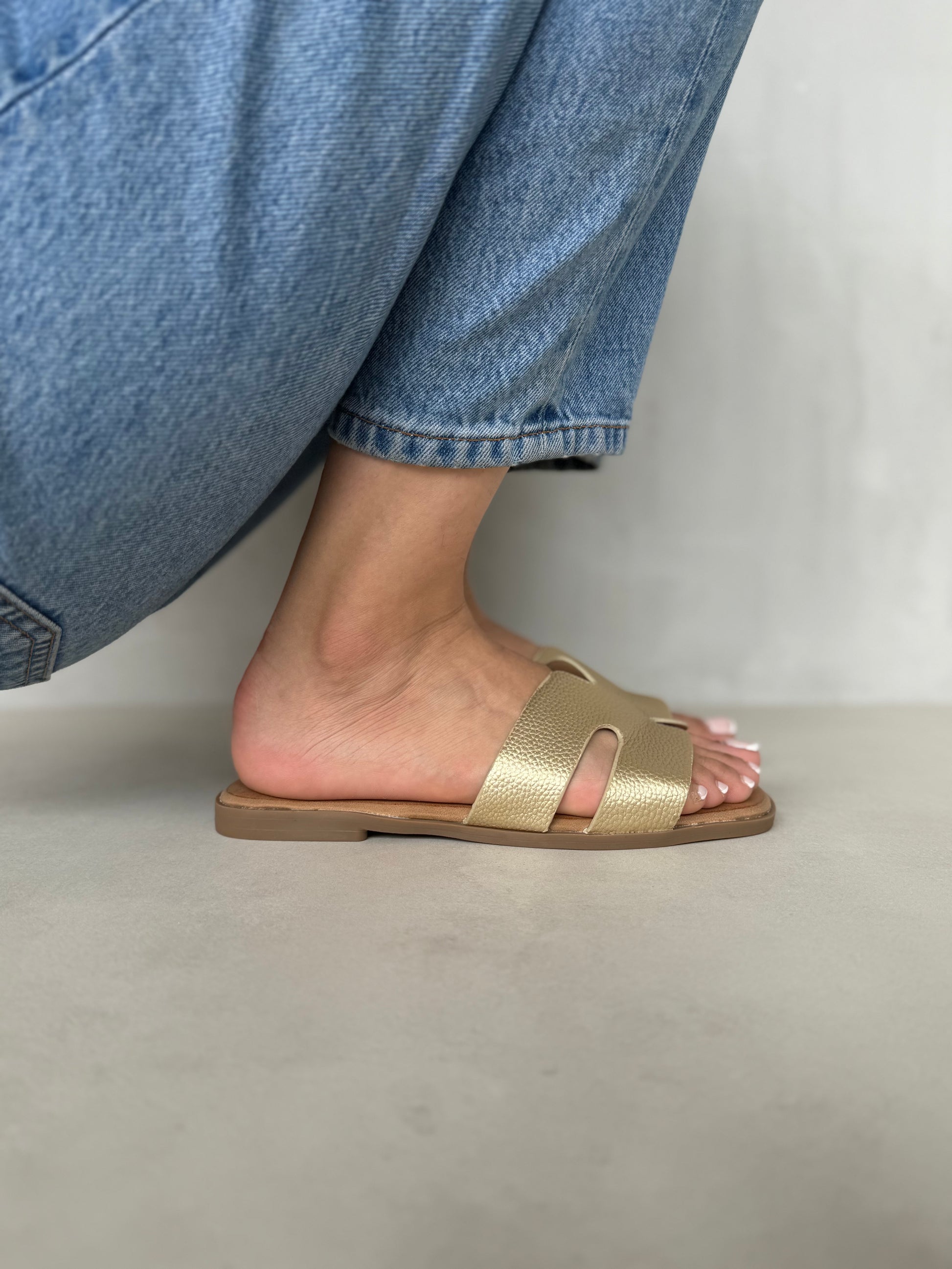 Luce fresca, cómoda y con mucho estilo gracias a estas sandalias planas tipo slide para mujer. Su diseño minimalista y sofisticado en acabado metálico las convierte en el complemento ideal para tus outfits de verano. Fáciles de combinar y aún más fáciles de calzar, son perfectas para el día a día, vacaciones o salidas informales.