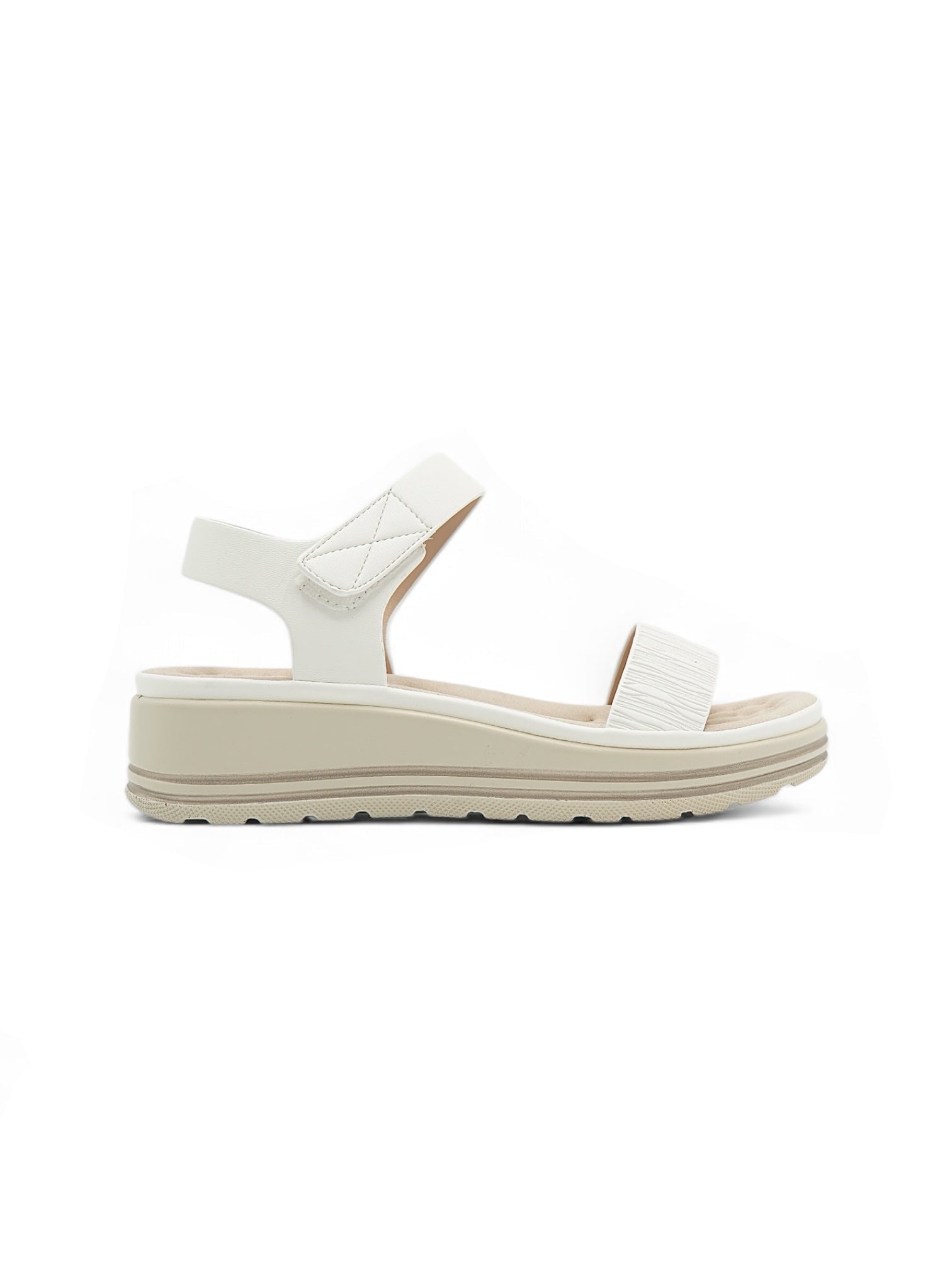 Estas sandalias blancas para mujer combinan elegancia sutil y funcionalidad moderna. Su diseño monocromático en tono crema/blanco hueso se adapta fácilmente a cualquier look, mientras que la plataforma brinda altura sin sacrificar la comodidad. La tira frontal elástica asegura un ajuste suave al pie, y la correa trasera con velcro proporciona firmeza al caminar. Ideales para quienes buscan un calzado versátil, cómodo y chic para el día a día.