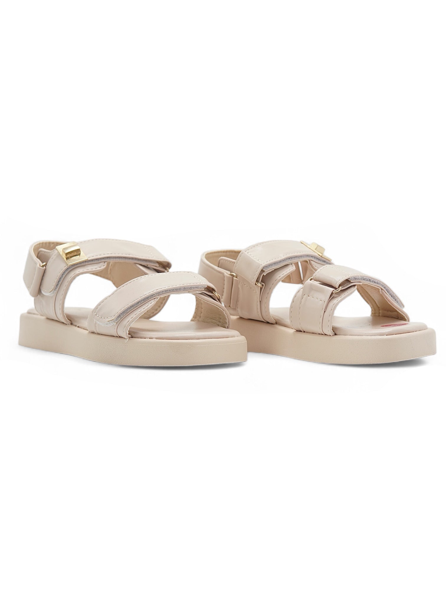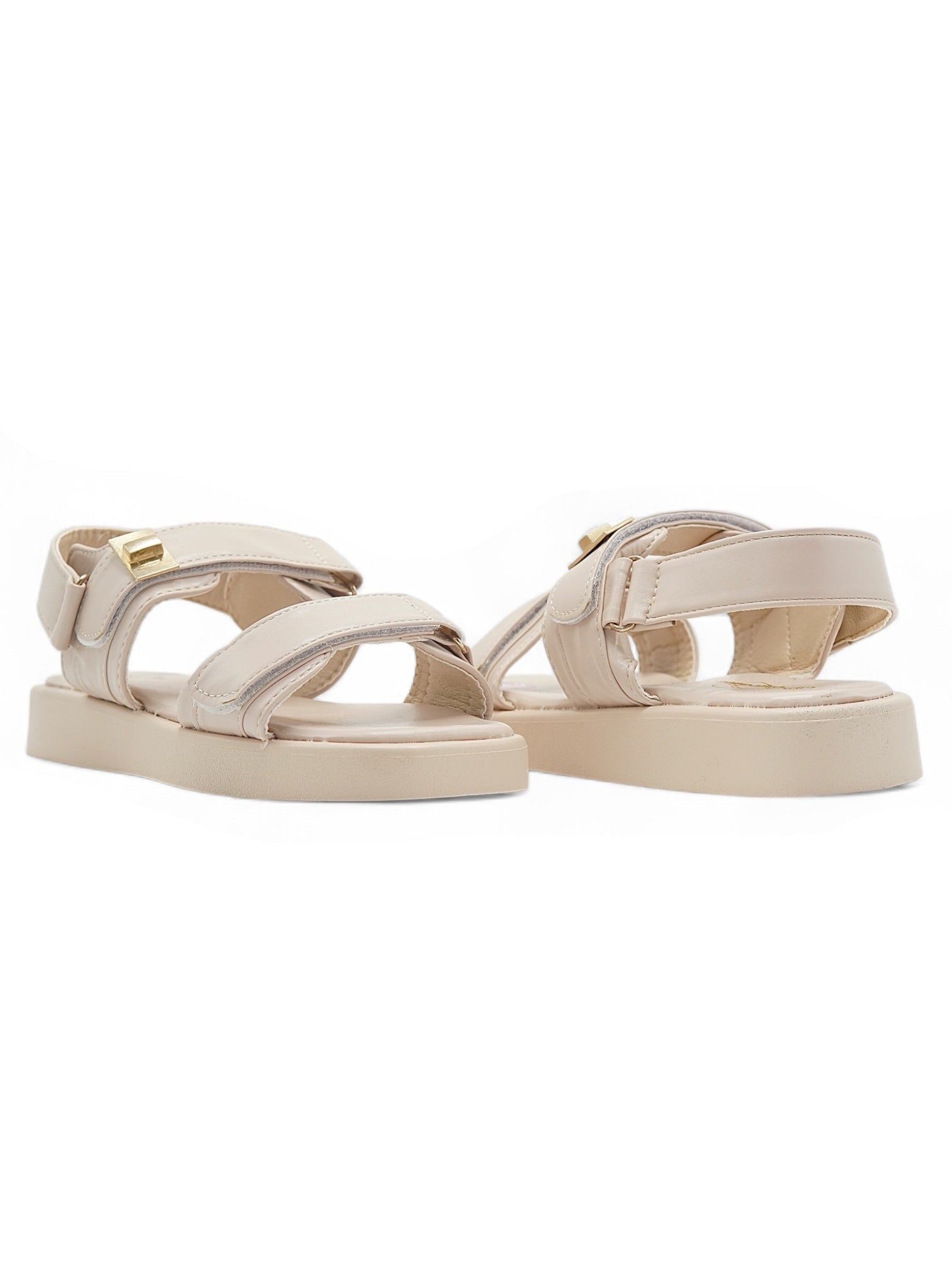 Estas sandalias planas en tono beige ofrecen una combinación perfecta de funcionalidad y estilo. Con un diseño de tiras gruesas y sistema de velcro en el tobillo y el empeine, permiten un ajuste personalizado y seguro. Su suela plana y acolchada garantiza comodidad para el uso prolongado, mientras que su estilo neutro las convierte en una opción versátil para cualquier outfit casual.