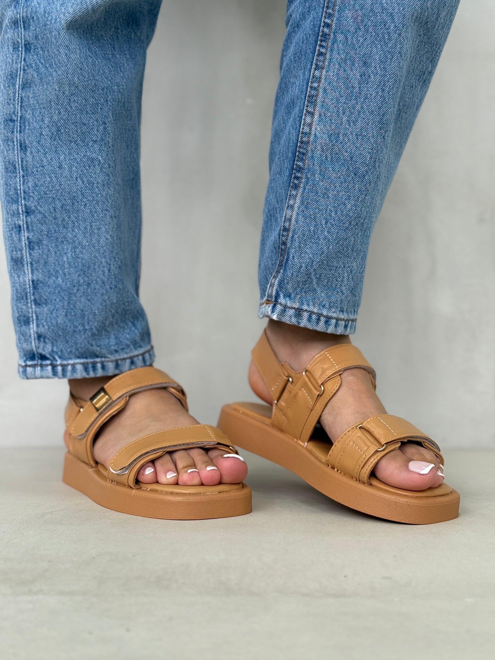 Estas sandalias planas en tono beige ofrecen una combinación perfecta de funcionalidad y estilo. Con un diseño de tiras gruesas y sistema de velcro en el tobillo y el empeine, permiten un ajuste personalizado y seguro. Su suela plana y acolchada garantiza comodidad para el uso prolongado, mientras que su estilo neutro las convierte en una opción versátil para cualquier outfit casual.