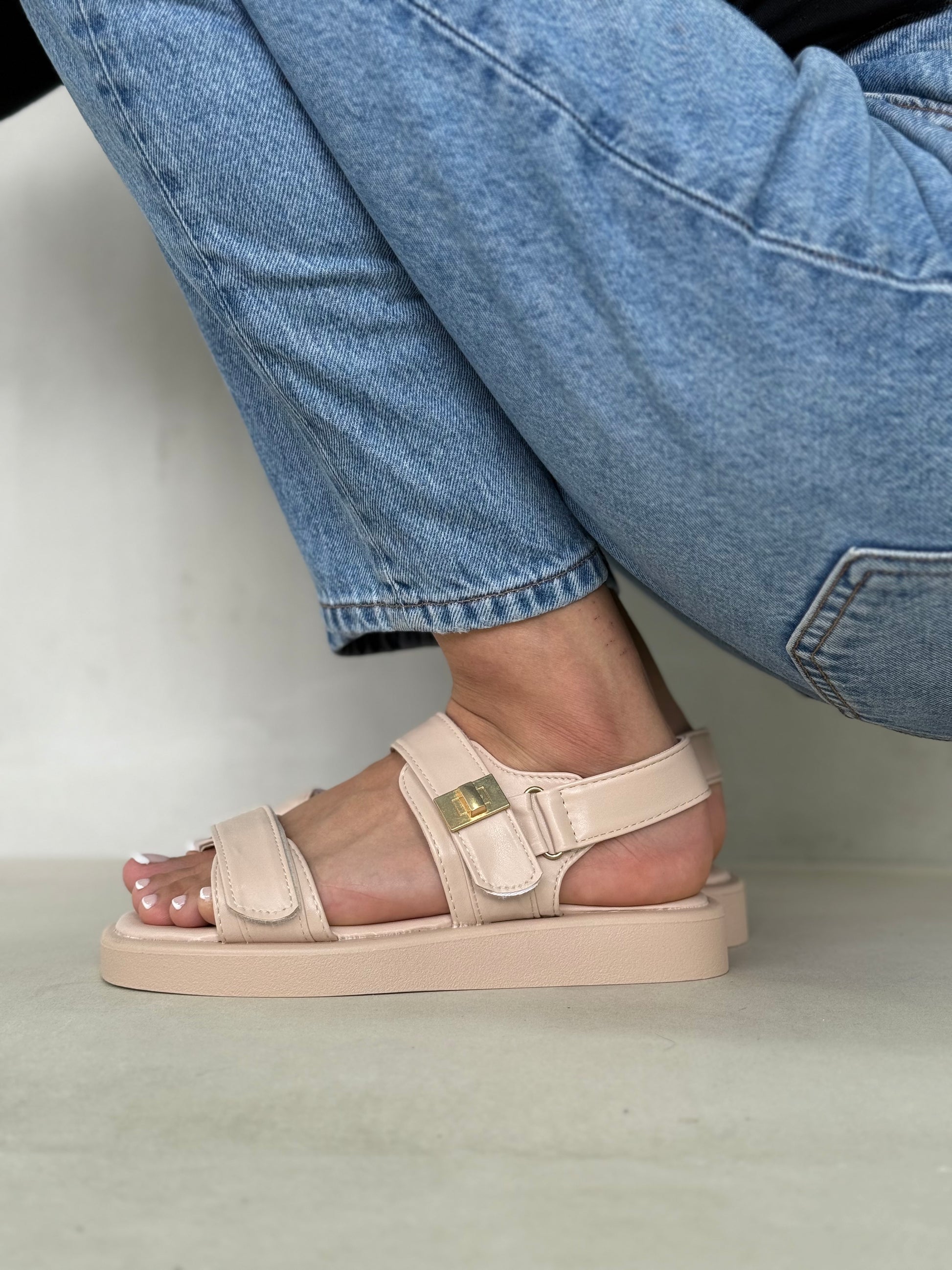 Estas sandalias planas en tono beige ofrecen una combinación perfecta de funcionalidad y estilo. Con un diseño de tiras gruesas y sistema de velcro en el tobillo y el empeine, permiten un ajuste personalizado y seguro. Su suela plana y acolchada garantiza comodidad para el uso prolongado, mientras que su estilo neutro las convierte en una opción versátil para cualquier outfit casual.