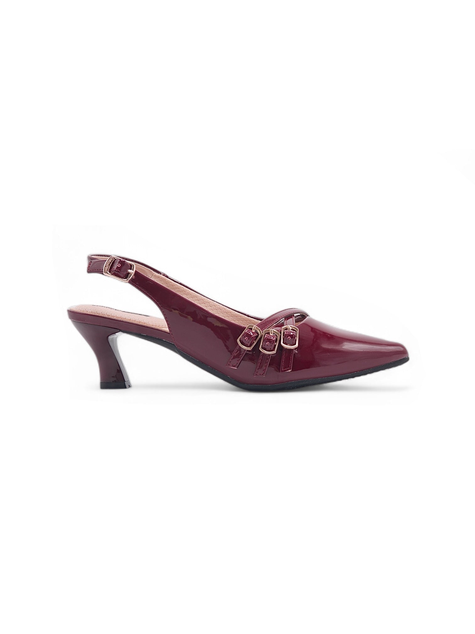 Este diseño sofisticado en charol color vino tinto con tacón delgado es ideal para mujeres que buscan elegancia con un toque moderno. Las múltiples hebillas frontales aportan carácter y detalle sin perder sutileza.