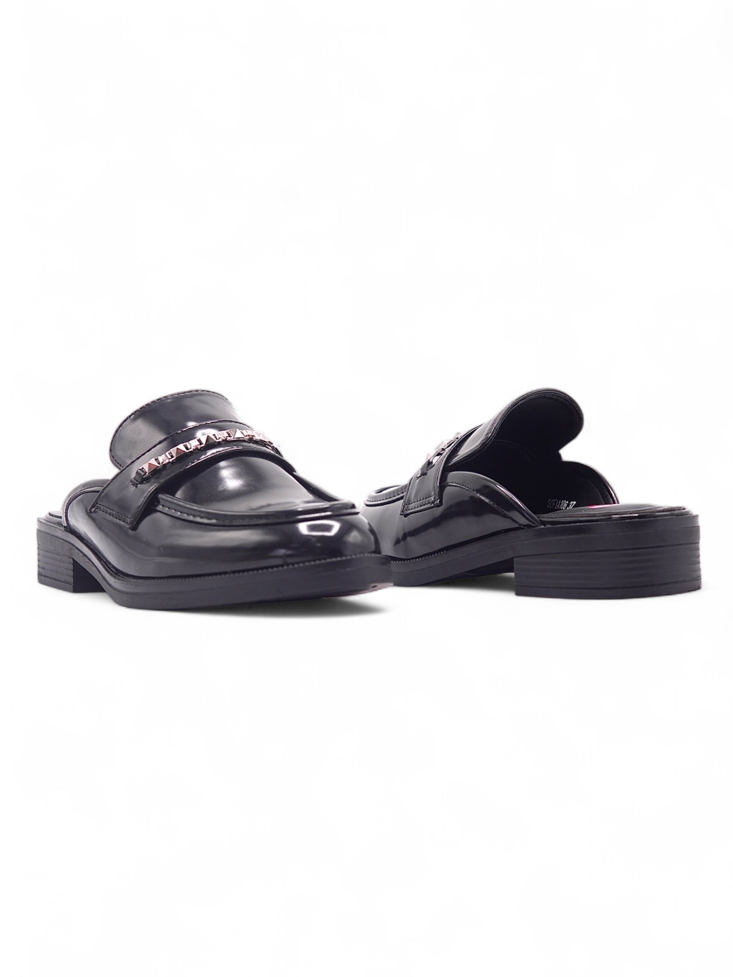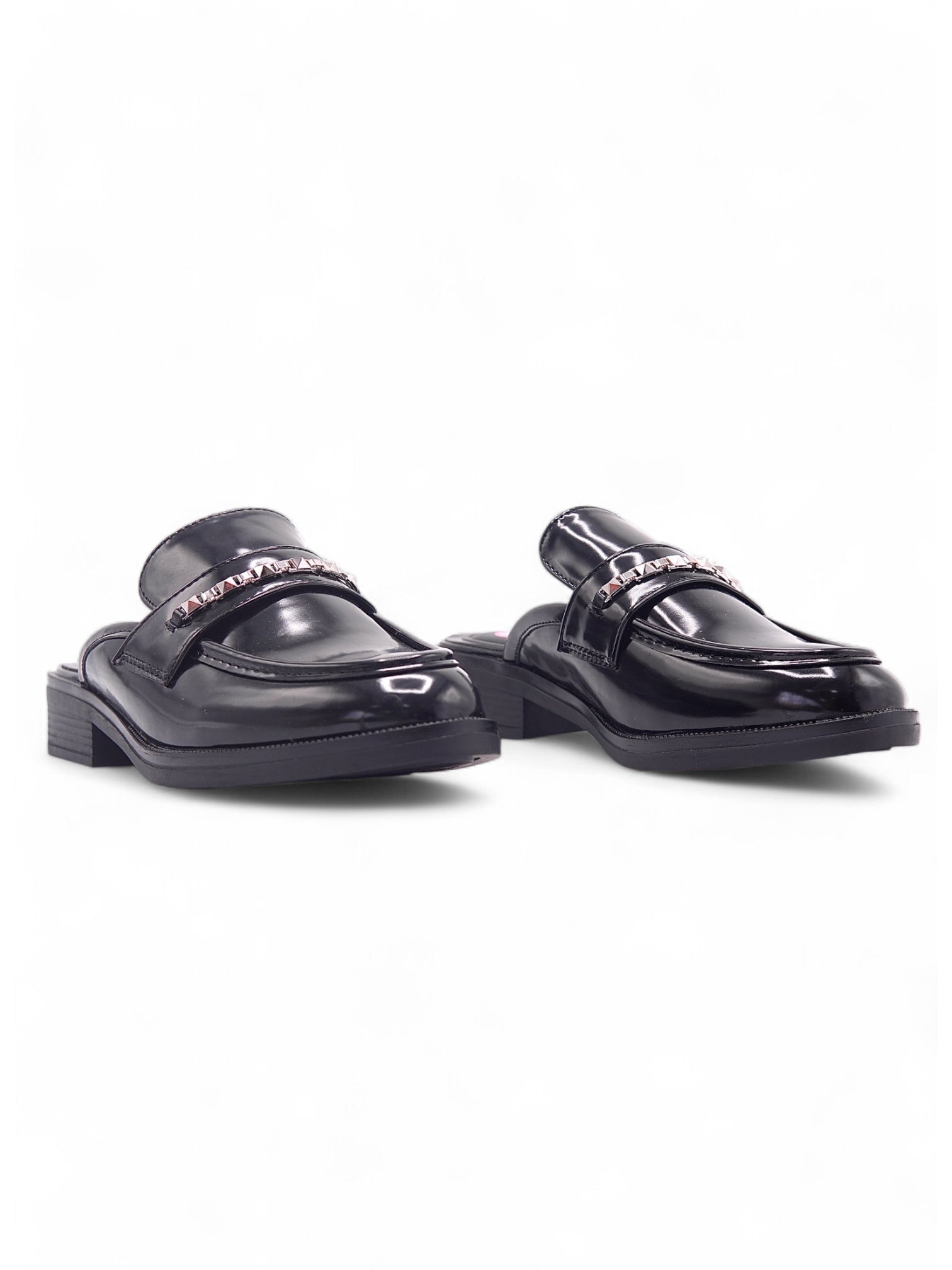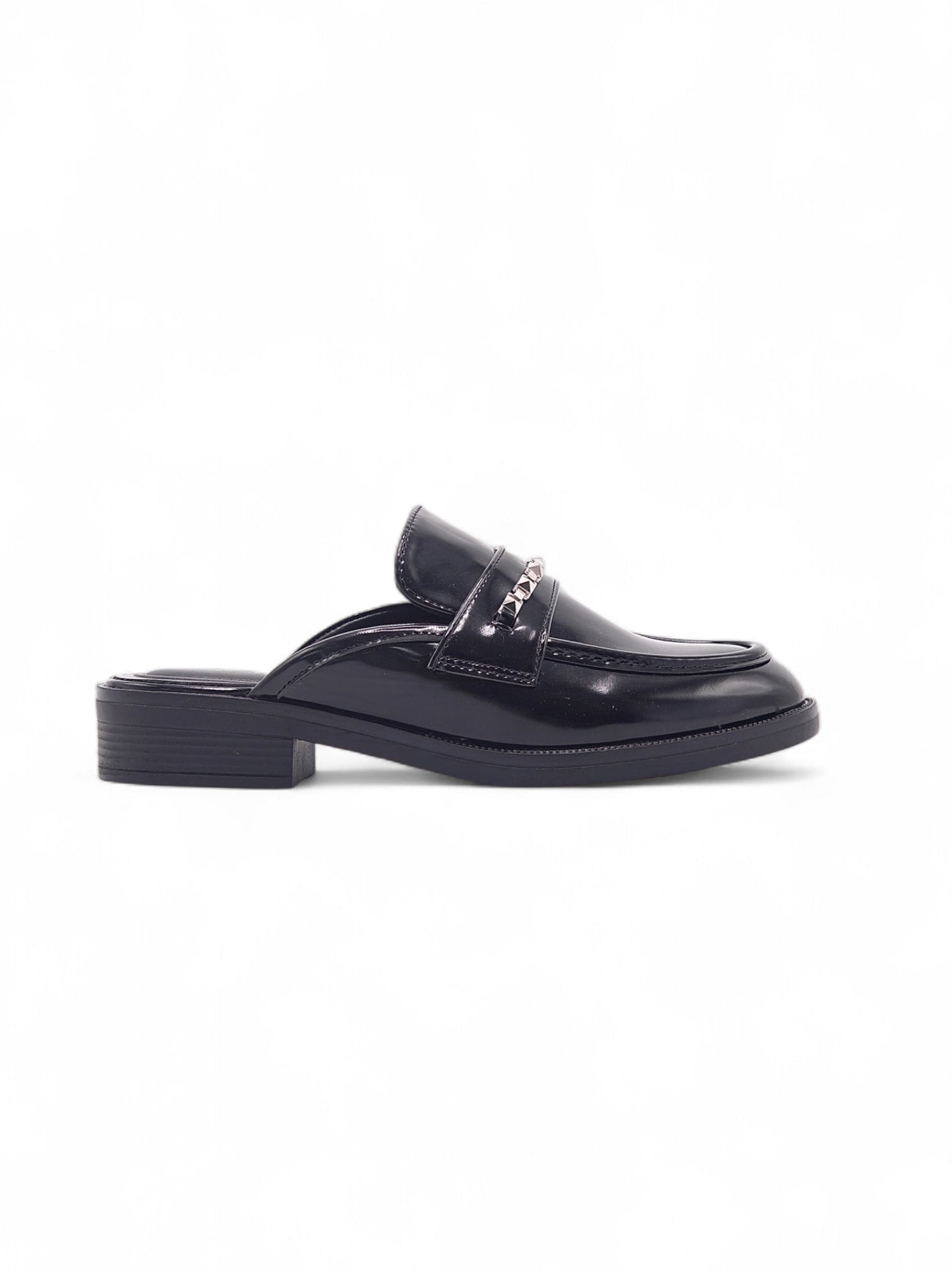 Estos mules tipo mocasín para mujer ofrecen una fusión perfecta entre elegancia clásica y practicidad contemporánea. Su diseño destalonado facilita el calce, mientras que el acabado tipo charol y la cadena decorativa añaden un toque sofisticado. Ideales para looks casuales con estilo o para elevar tus outfits de oficina con comodidad.