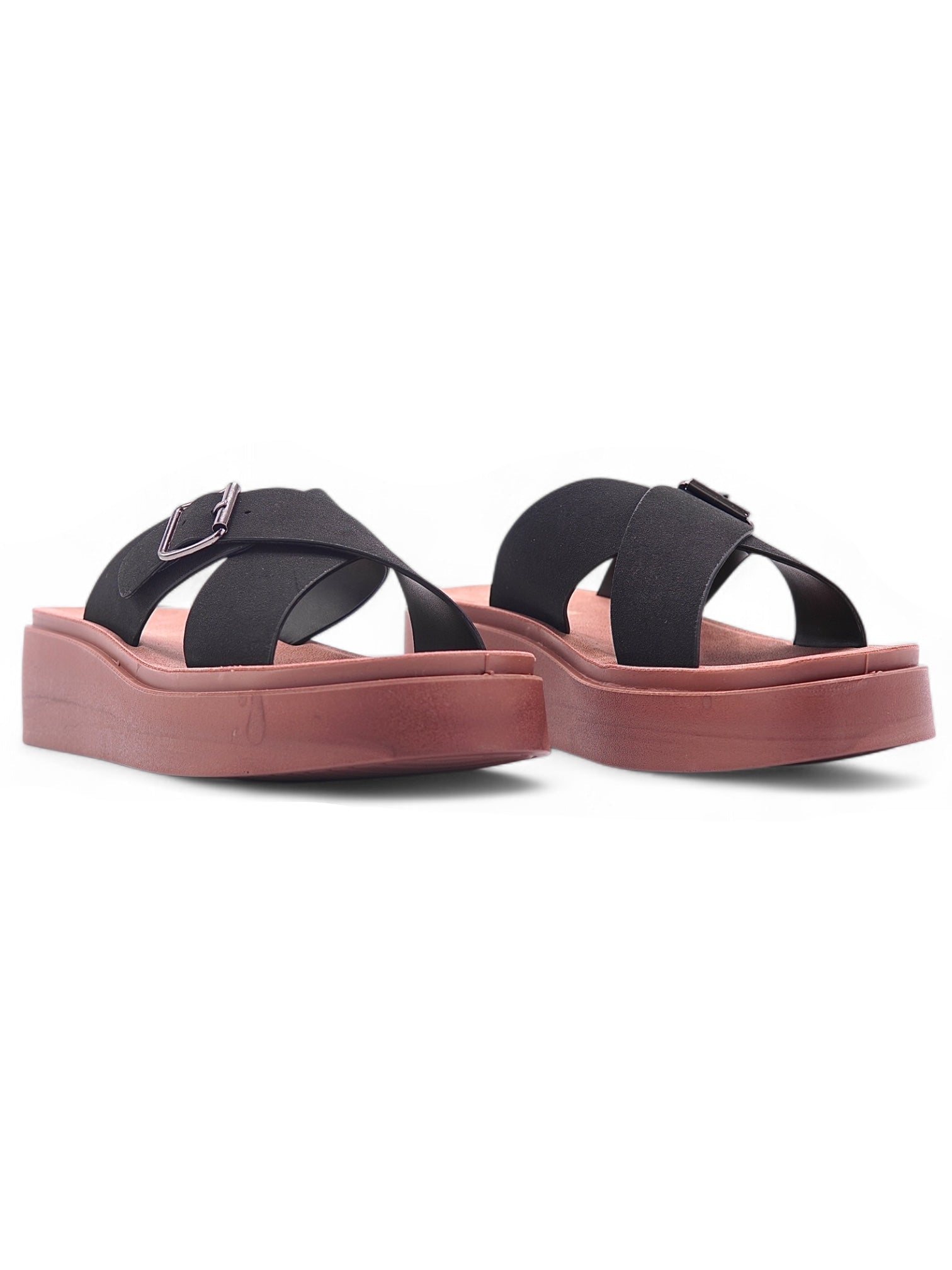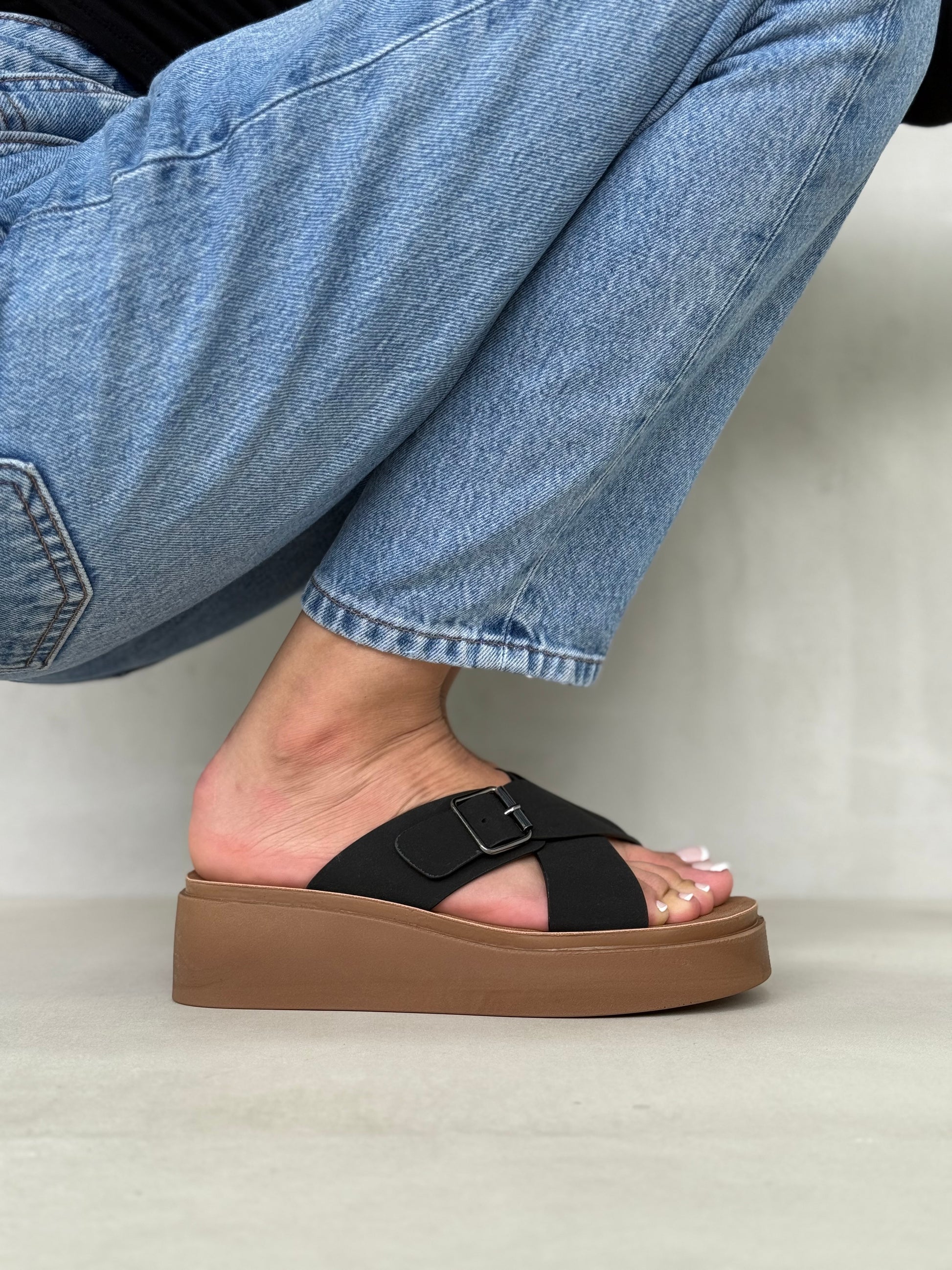 Estas sandalias tipo plataforma para mujer combinan un diseño contemporáneo con funcionalidad. Sus tiras anchas cruzadas en color negro aportan firmeza al andar, mientras que la hebilla metálica añade un toque moderno y ajustable. La suela de plataforma en tono terracota proporciona altura con estabilidad, ideal para uso prolongado sin sacrificar el confort. Perfectas para looks casuales, urbanos o de descanso con estilo.