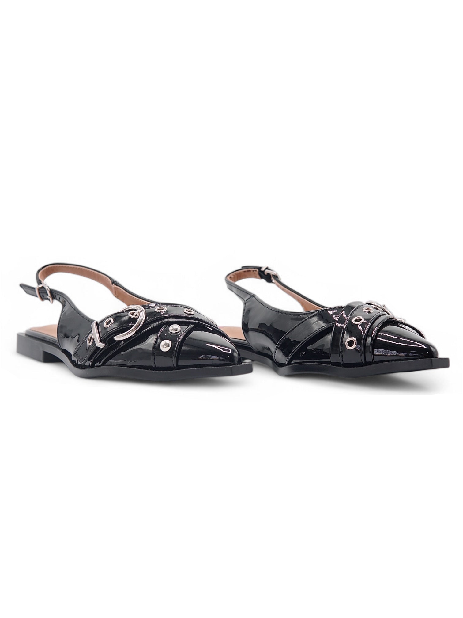 Este slingback plano en charol negro es una pieza que transmite poder, estilo y actitud. Con diseño de doble hebilla metálica decorativa y detalles tipo tachuela, ofrece un look moderno y refinado. La punta fina y el acabado brillante lo convierten en una excelente opción para complementar outfits monocromáticos, ejecutivos o de inspiración urbana con un toque audaz.