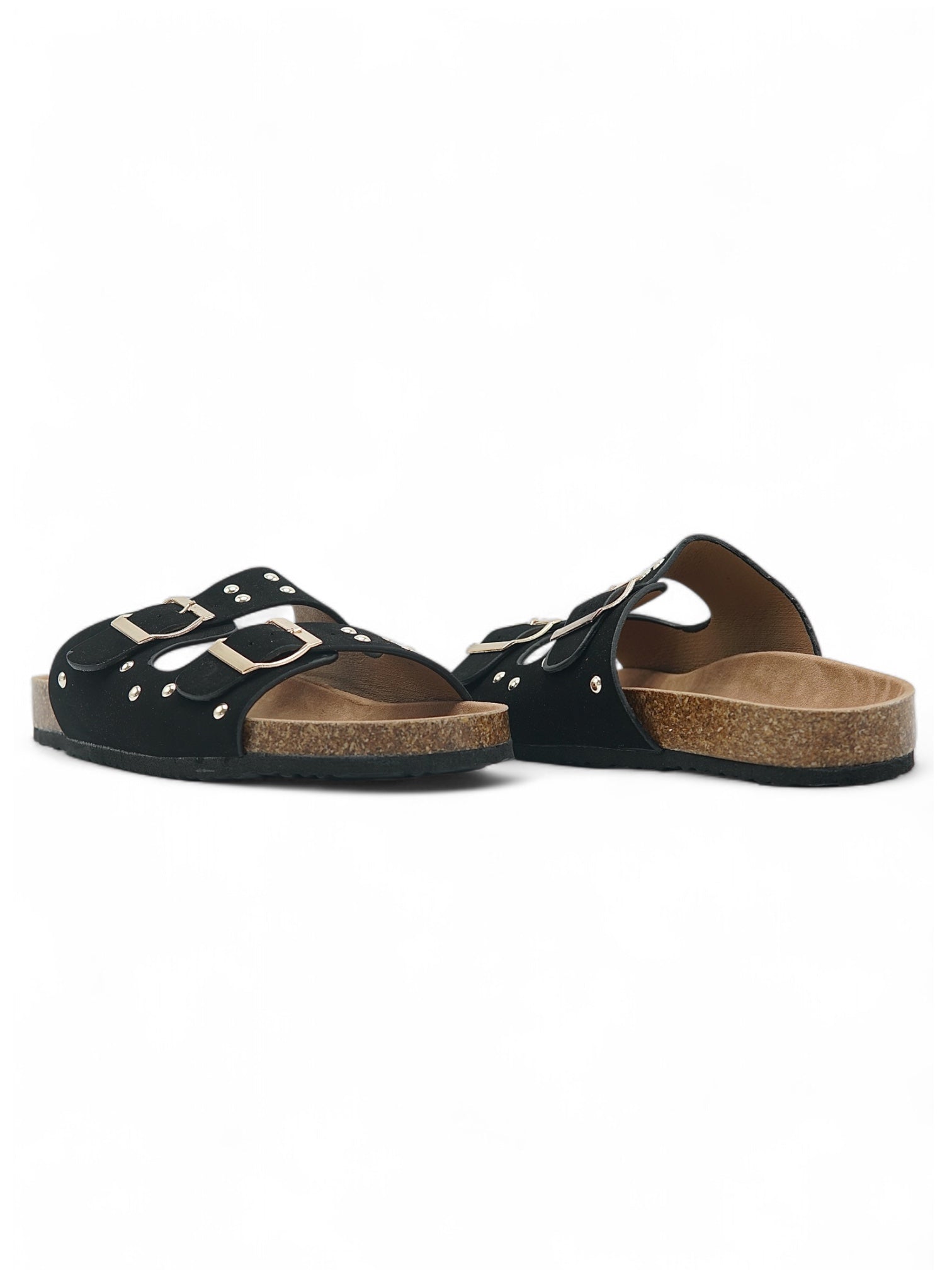 Estas sandalias negras tipo bio son el básico ideal para tu día a día. Su diseño ergonómico con doble hebilla metálica y plantilla acolchada te brinda comodidad durante todo el día, sin perder el estilo natural y moderno que buscás.