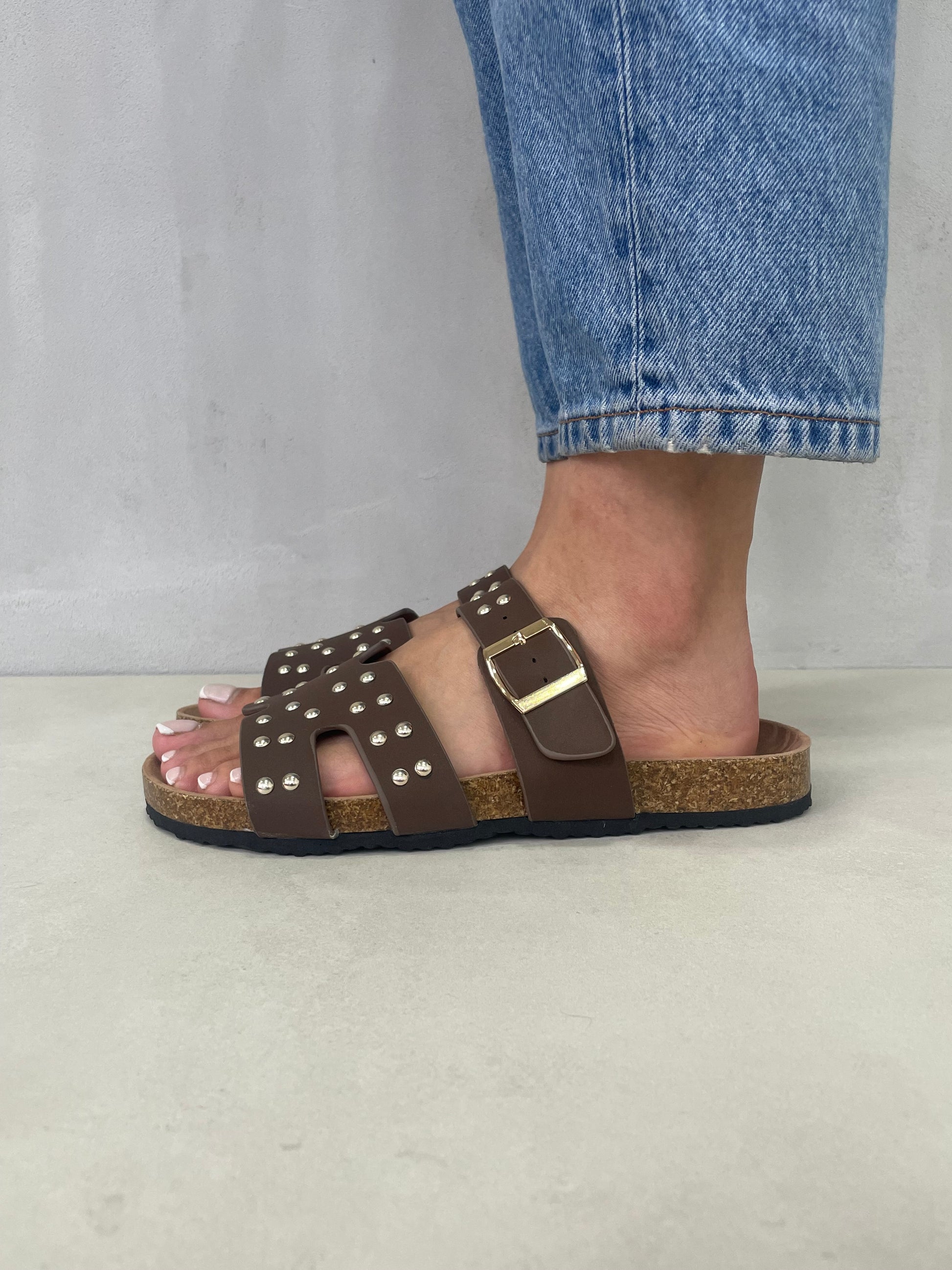 Correas cruzadas con apliques metálicos, que aportan un diseño moderno y llamativo.