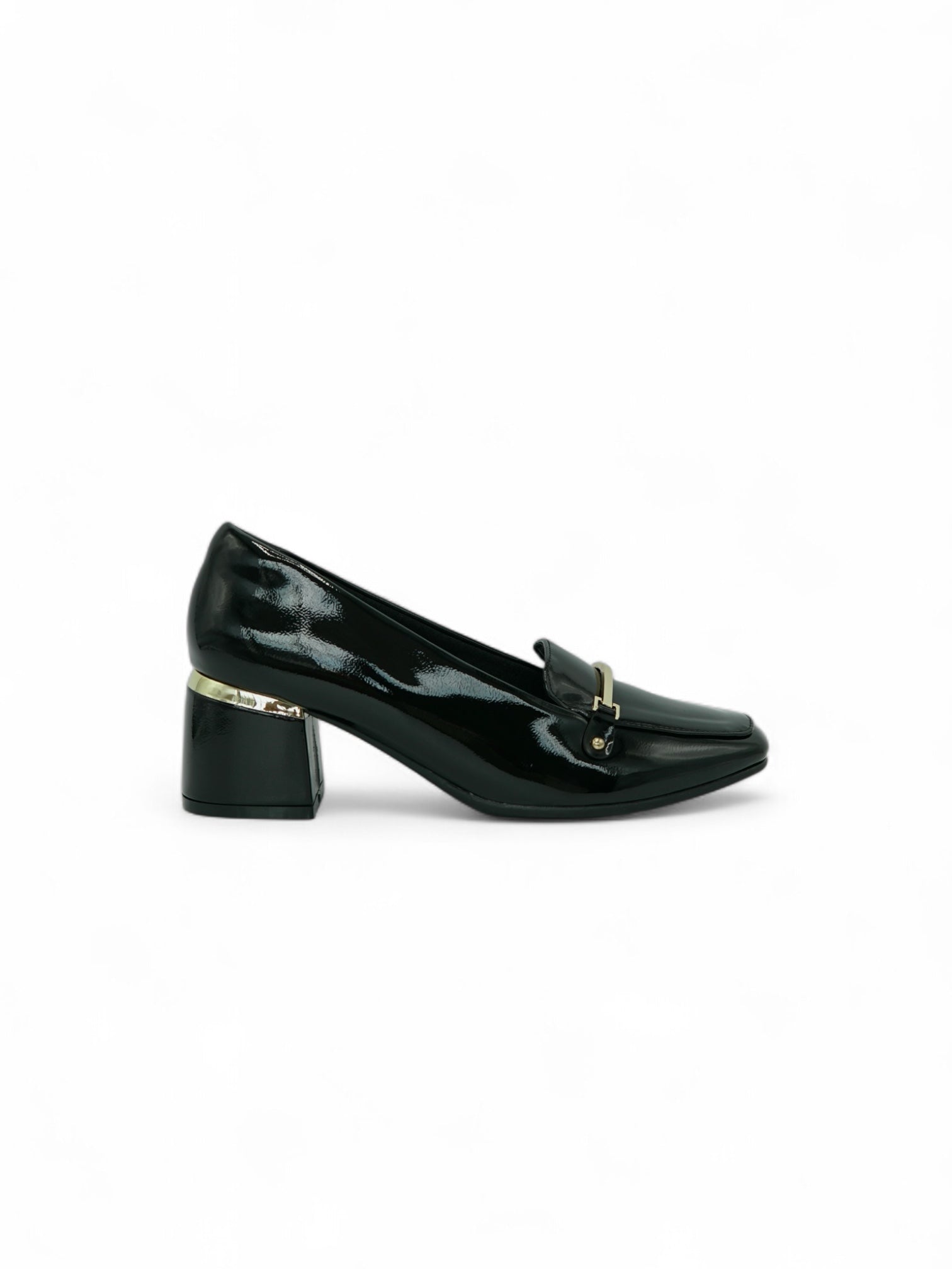 Estos zapatos negros de charol combinan elegancia y confort en un diseño versátil ideal para el día o la noche. El detalle metálico dorado en el tacón aporta un toque distintivo y moderno, mientras el tacón ancho garantiza una pisada firme y estable. Perfectos para complementar looks ejecutivos, formales o casual chic.