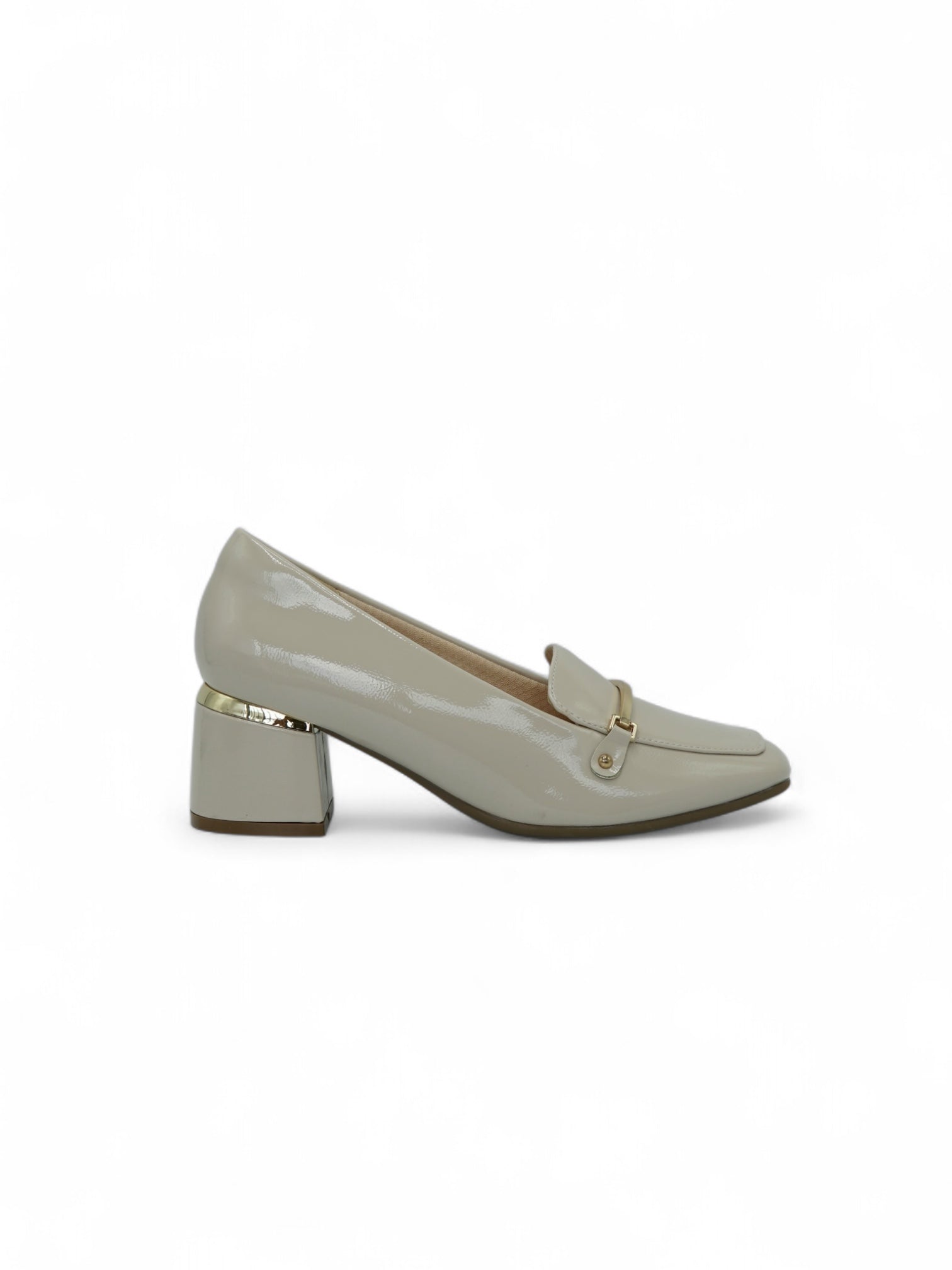 Estos zapatos color off white son una elección refinada para quienes buscan estilo y comodidad en cada paso. Su acabado brillante tipo charol y el detalle metálico dorado en el tacón aportan un toque sofisticado, ideal para combinar con atuendos formales o casuales elegantes. Su tacón ancho brinda estabilidad y comodidad durante todo el día.