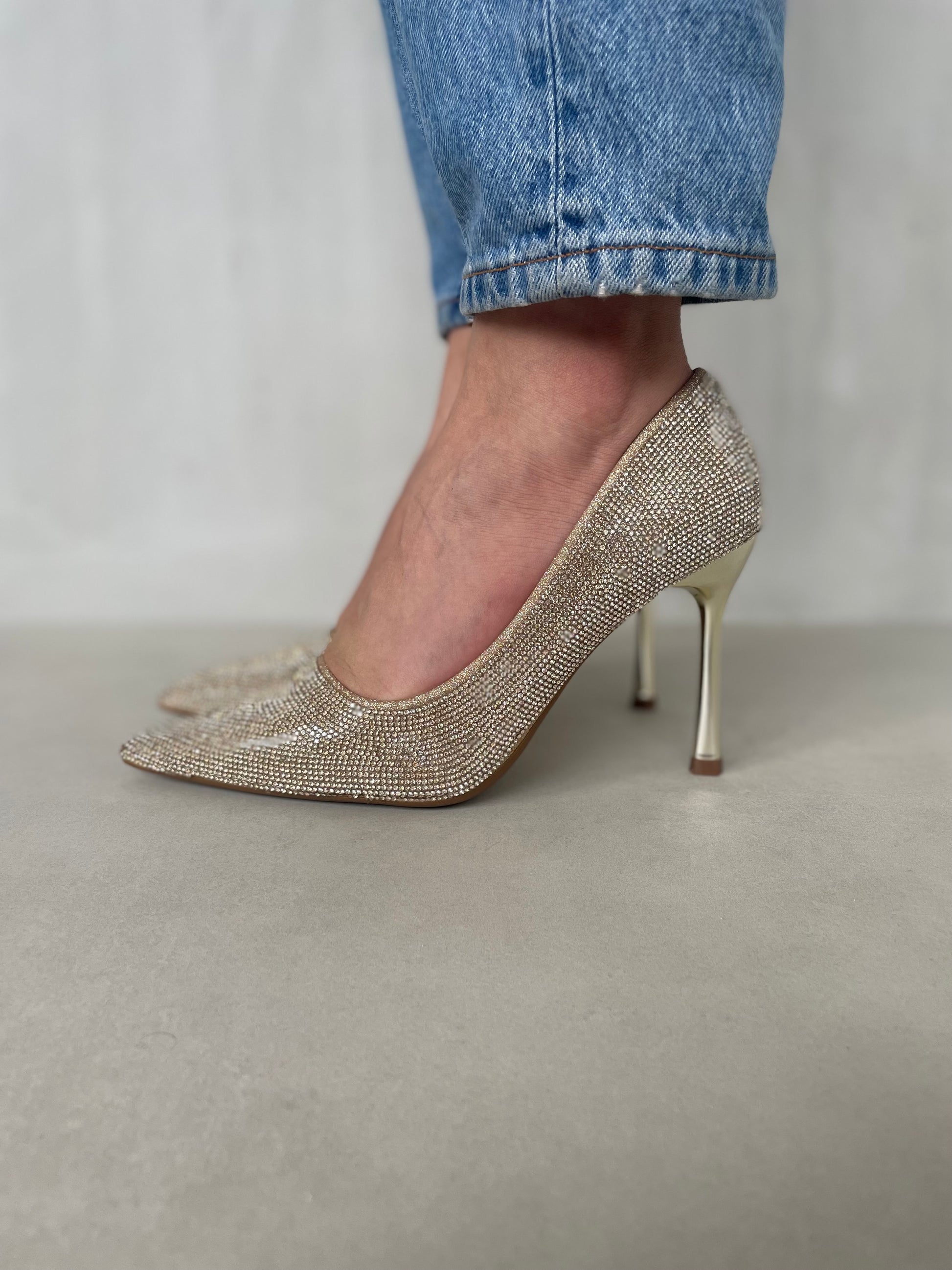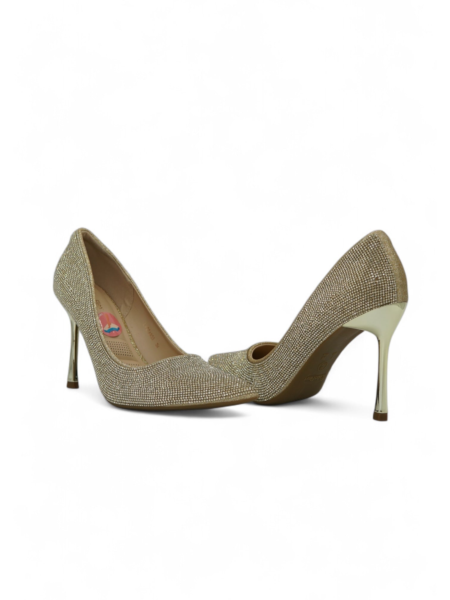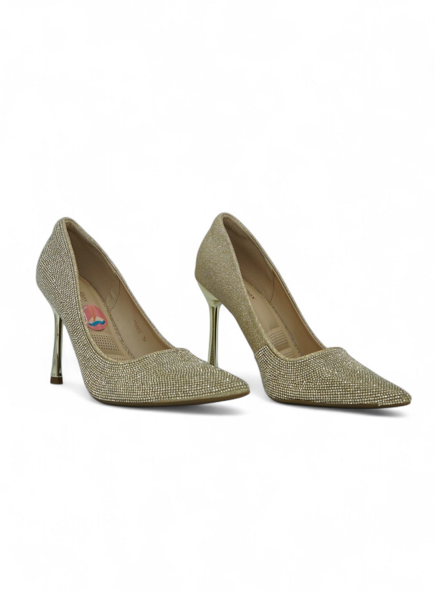 Estos zapatos de tacón dorados destacan por su acabado brillante y su silueta refinada. Diseñados para realzar cualquier look con elegancia, combinan una punta fina con un tacón alto metálico que aporta una presencia moderna y femenina. Ideales para eventos formales, cenas o celebraciones especiales.