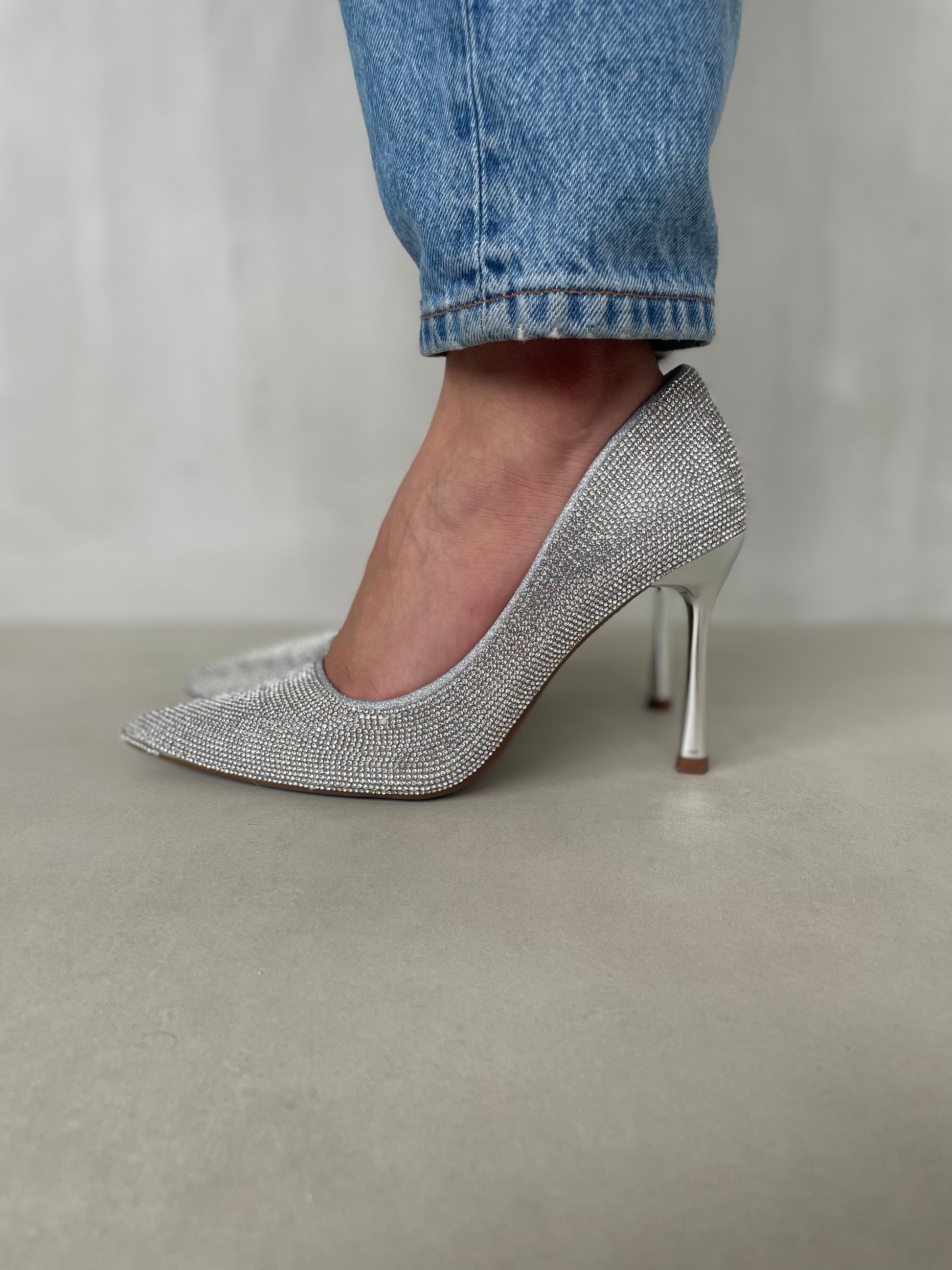 Estos tacones plateados con acabado brillante son la definición de elegancia y sofisticación. Su superficie cubierta de pequeños brillos refleja la luz con sutileza, aportando un toque de lujo ideal para eventos, cenas o celebraciones. El tacón alto y delgado estiliza la figura mientras la punta cerrada realza la silueta del pie con un diseño clásico y refinado que nunca pasa de moda.