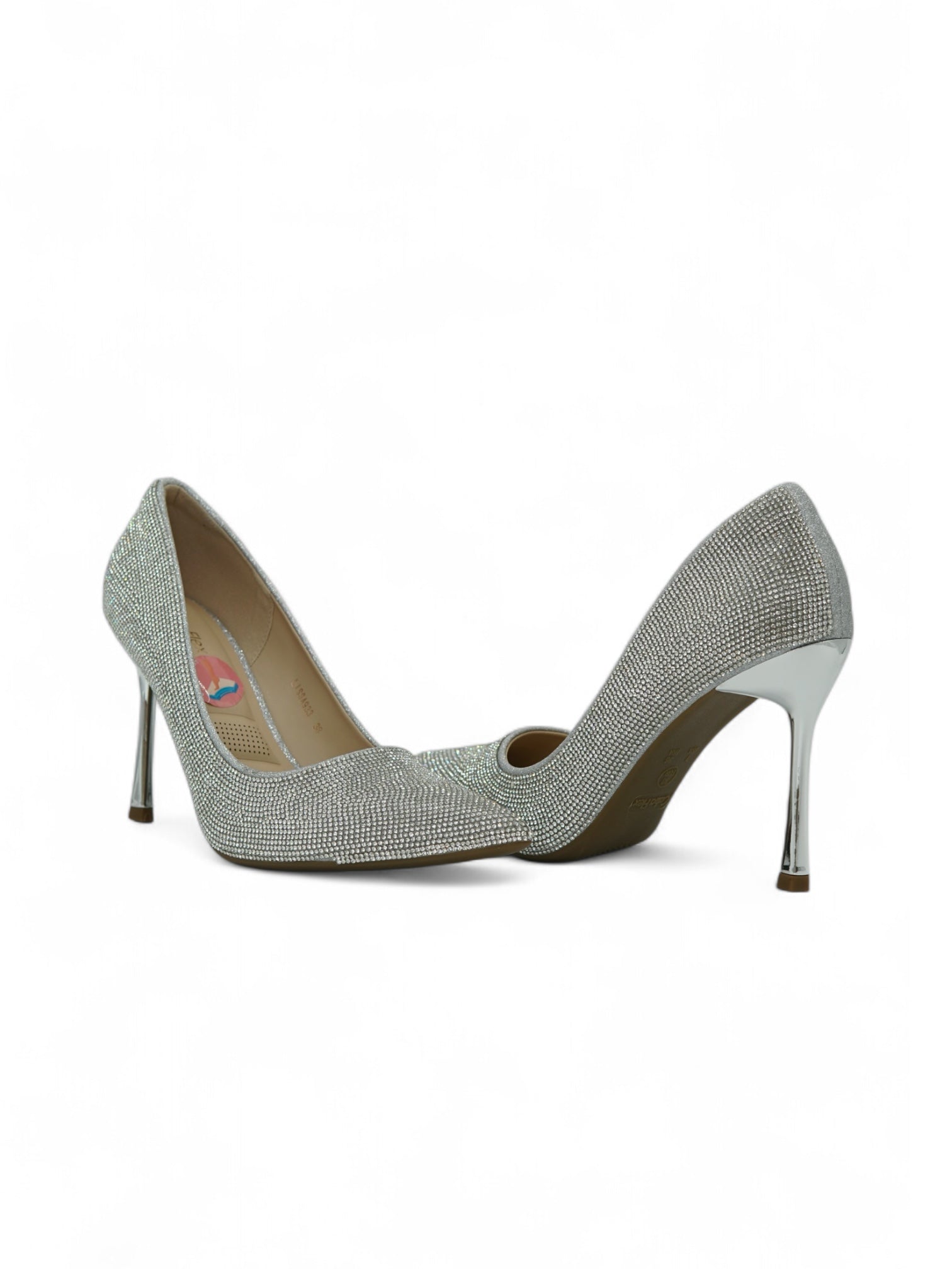 14260 – Tacones Plateados con Brillos Finos y Punta Cerrada