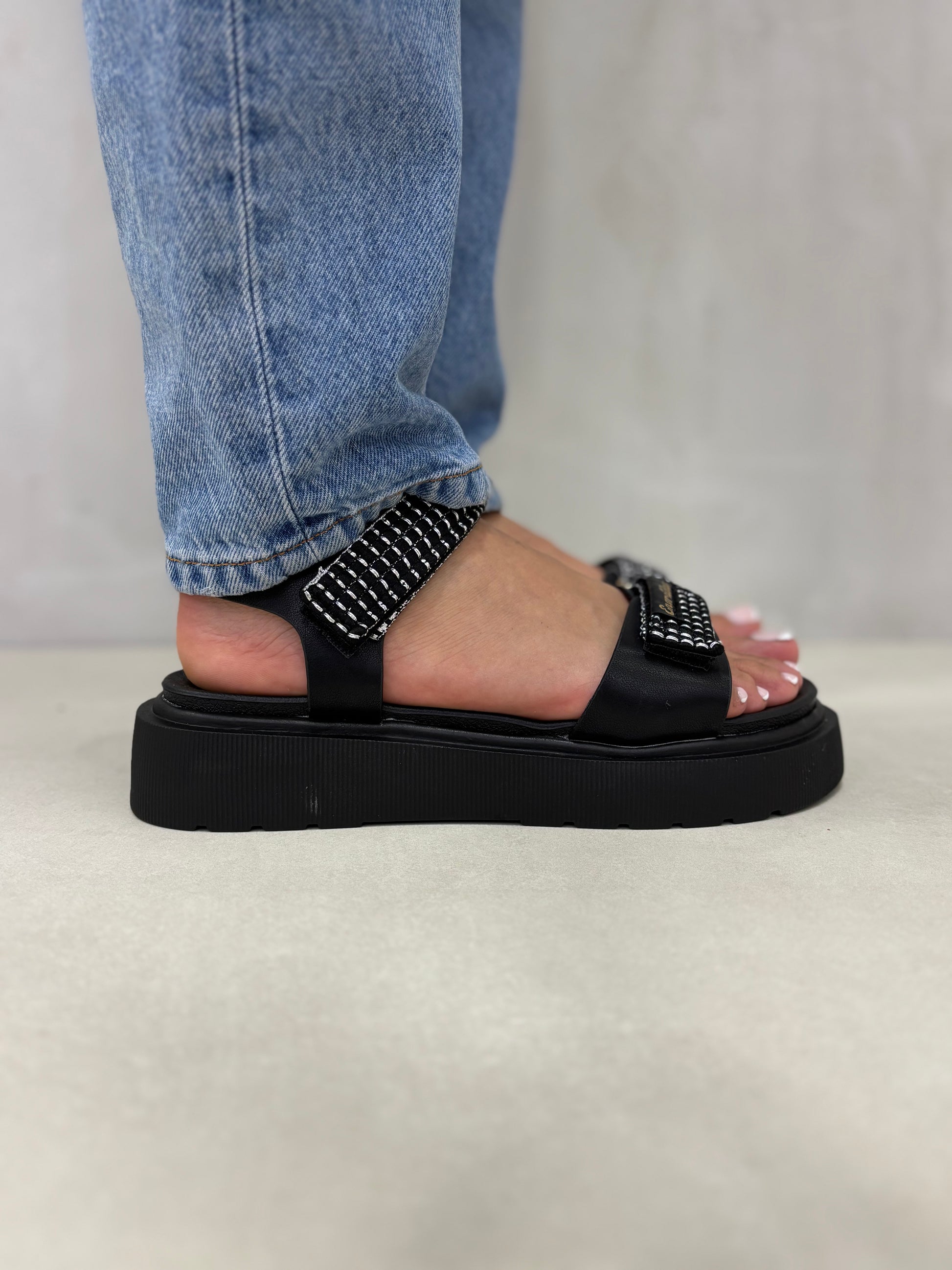 Estas sandalias negras con plataforma destacan por su elegancia moderna y su toque de brillo. Perfectas para elevar cualquier look casual o de noche, combinan comodidad y estilo con una suela ergonómica y tiras adornadas con aplicaciones brillantes. Su diseño versátil las convierte en un must-have para toda ocasión.