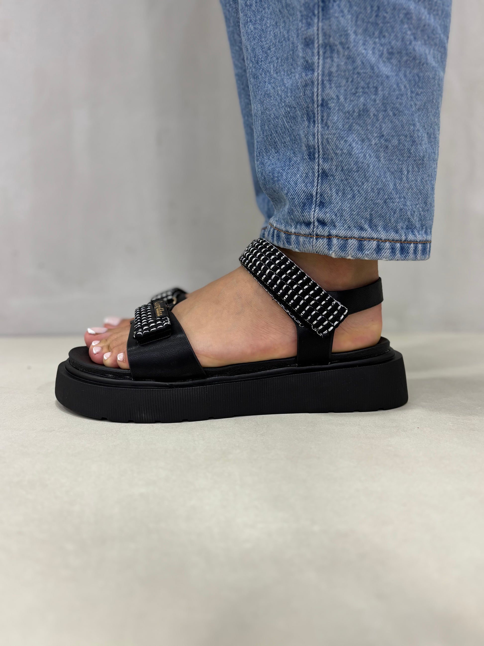 Tiras ajustables con brillos decorativos. Plataforma liviana y ergonómica. Color negro clásico que combina con todo. Estilo moderno con inspiración urbana y elegante.