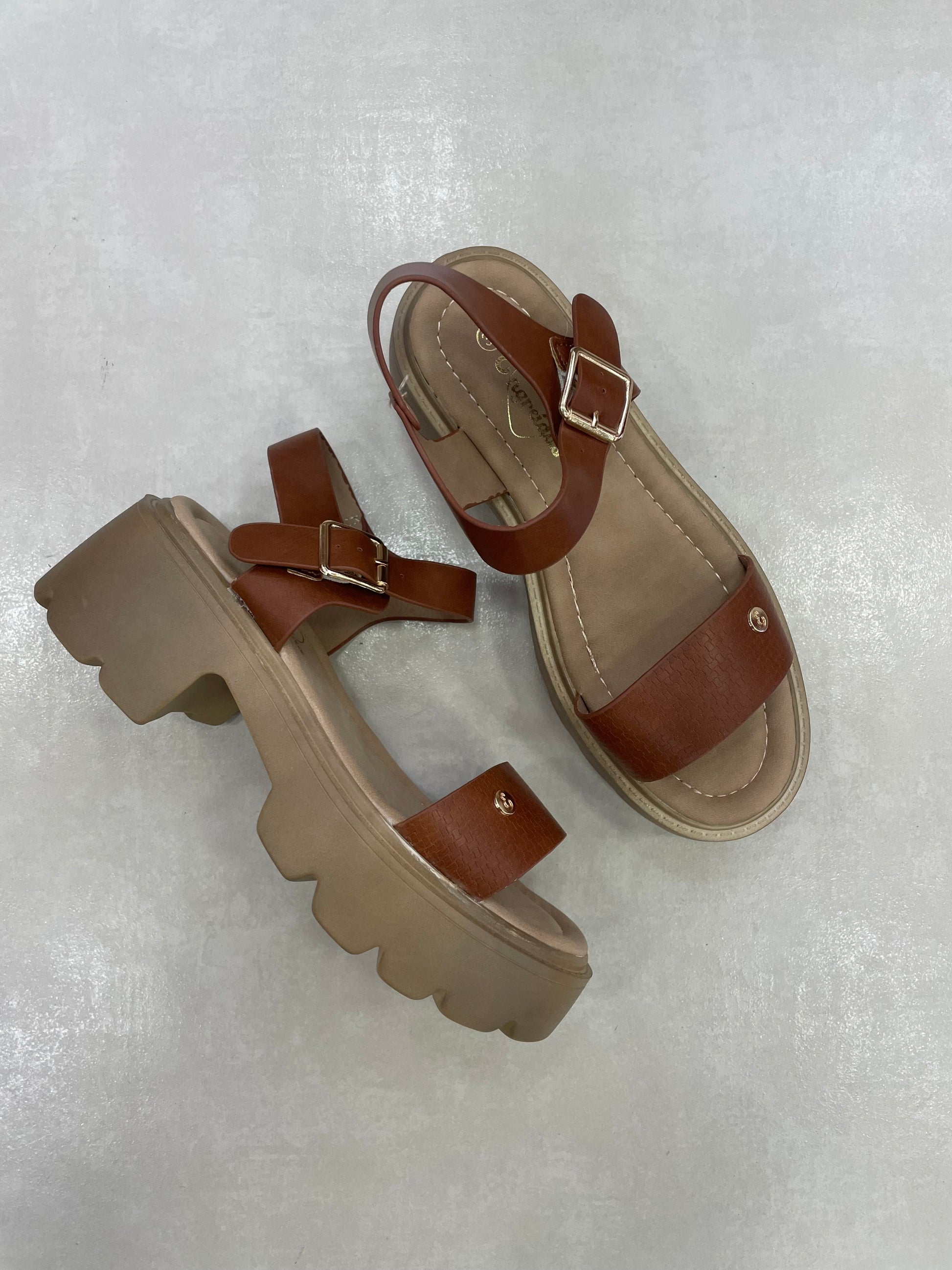 Diseño moderno con doble correa y hebillas doradas. Plataforma ergonómica con suela dentada. Acabado marrón cálido que combina fácilmente. Comodidad y estilo para uso diario.