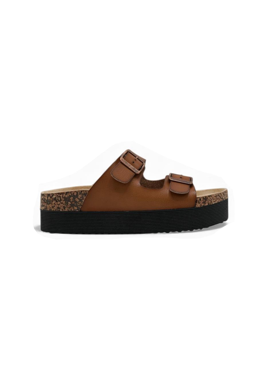 Estas sandalias color khaki son el balance ideal entre diseño moderno y confort. Su doble correa con hebillas metálicas permite un ajuste perfecto, mientras la plataforma de corcho ofrece ligereza y soporte ergonómico. La suela negra antideslizante aporta seguridad en cada paso, convirtiéndolas en una opción práctica y elegante para el uso diario o los días de descanso.
