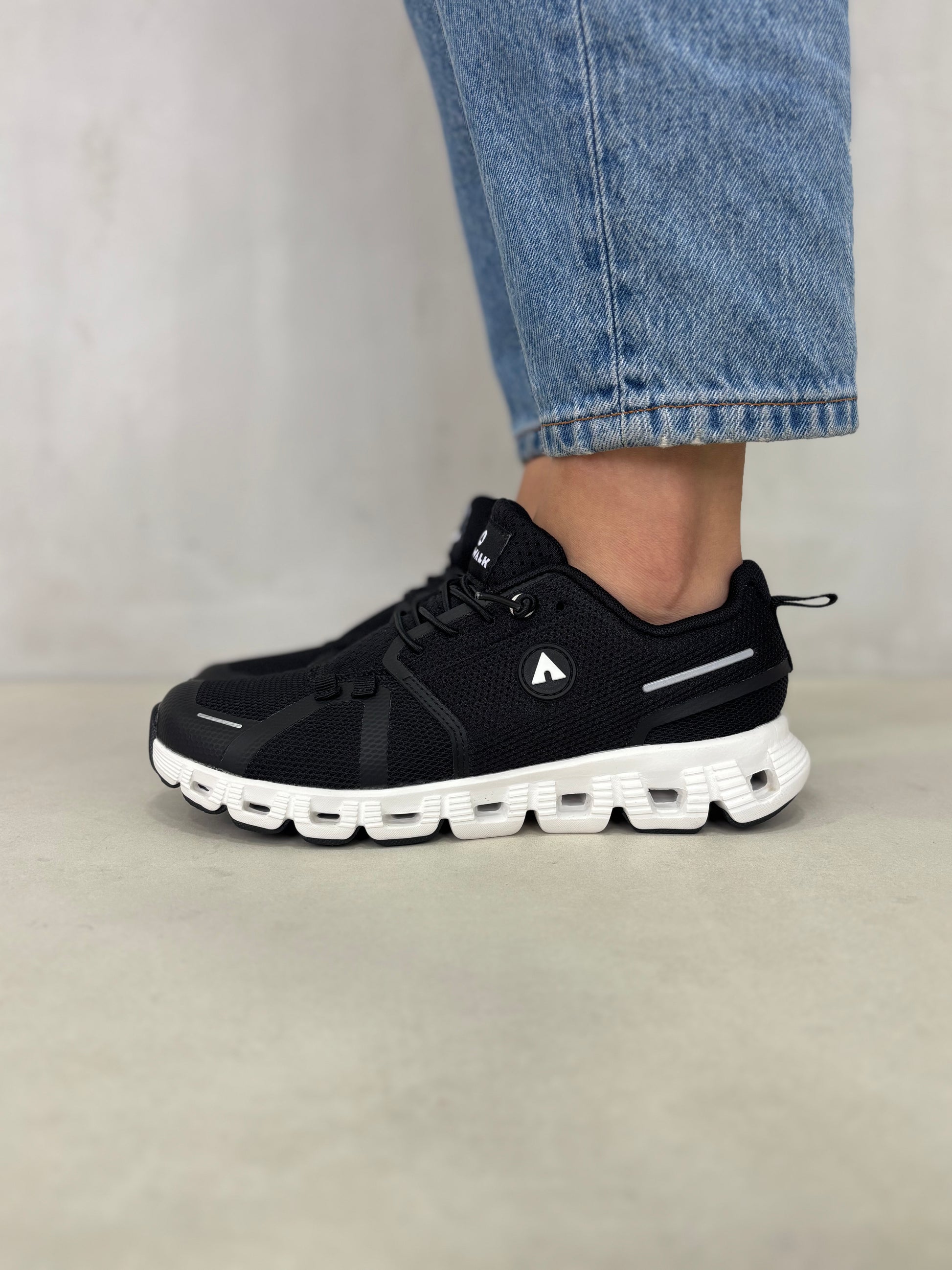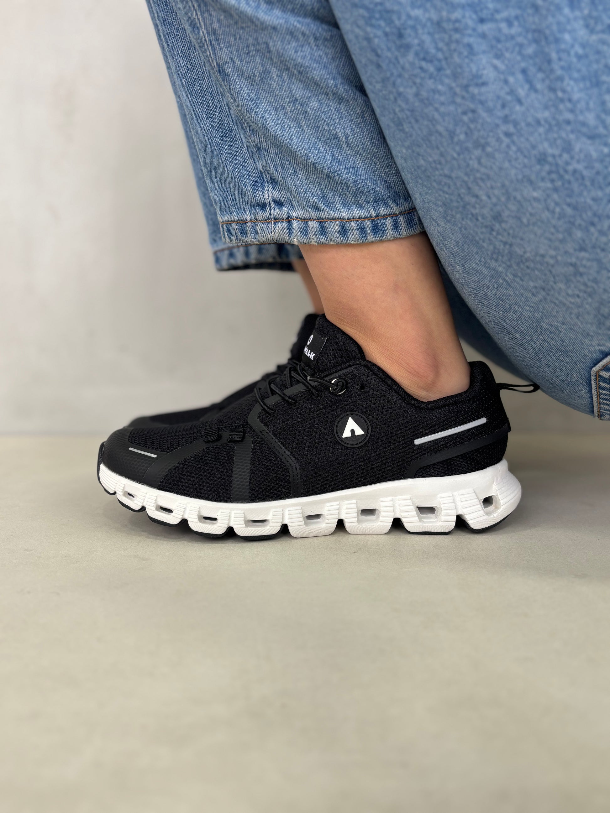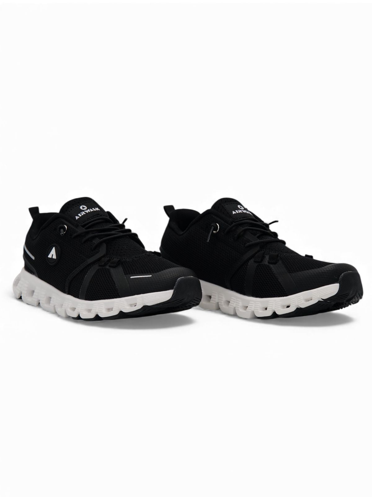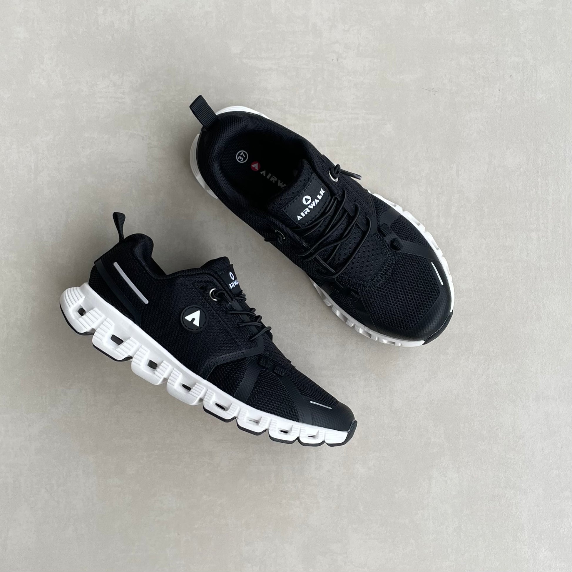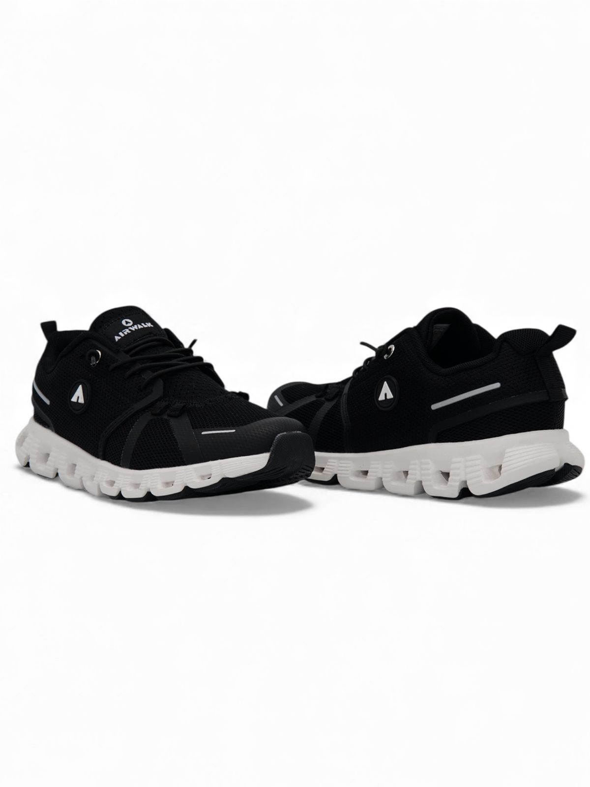 Diseño ergonómico con malla respirable. Suela de alto rendimiento con tecnología de absorción de impacto. Combinación elegante de negro y blanco. Perfectos para entrenar o complementar looks casuales.