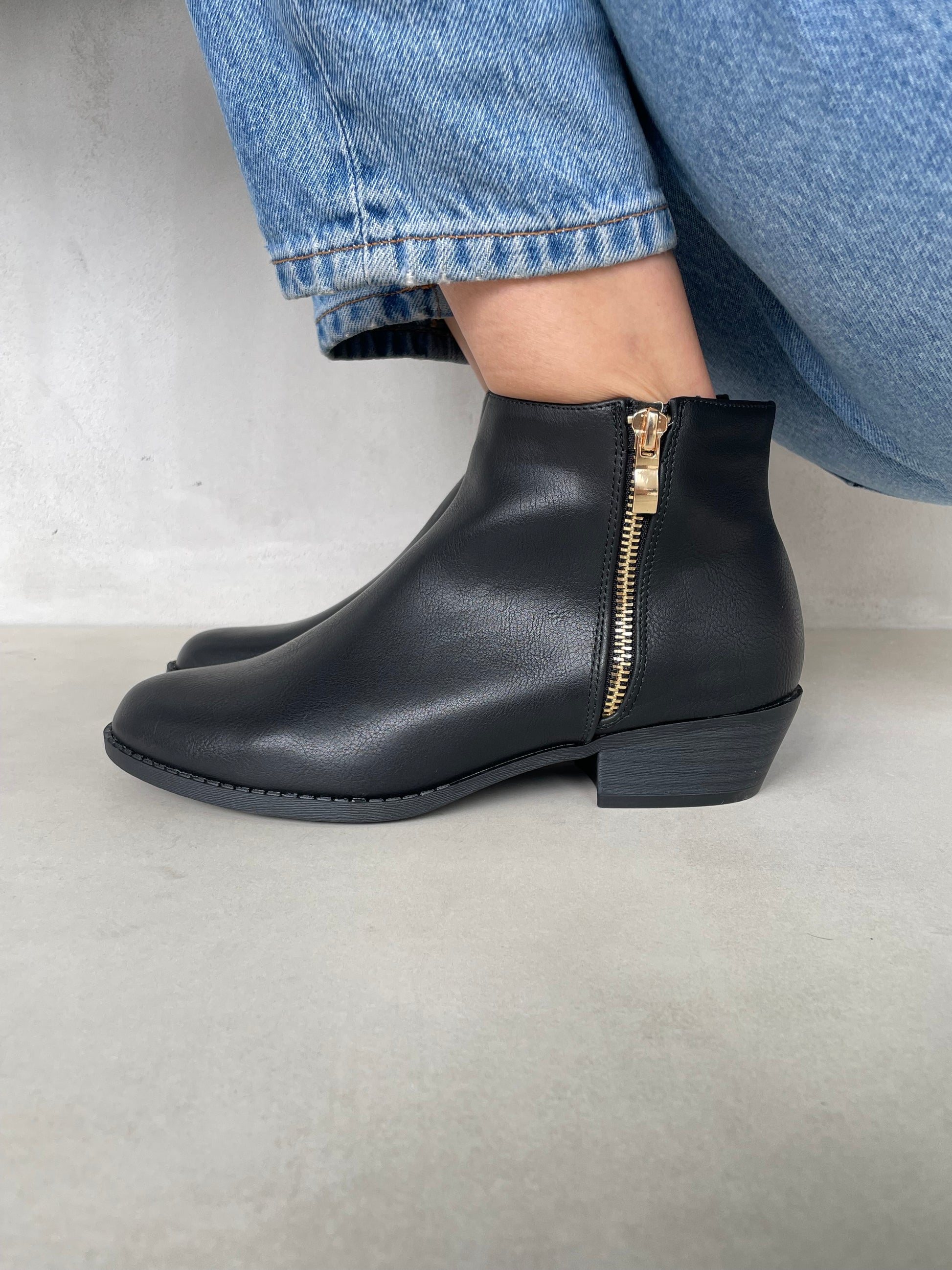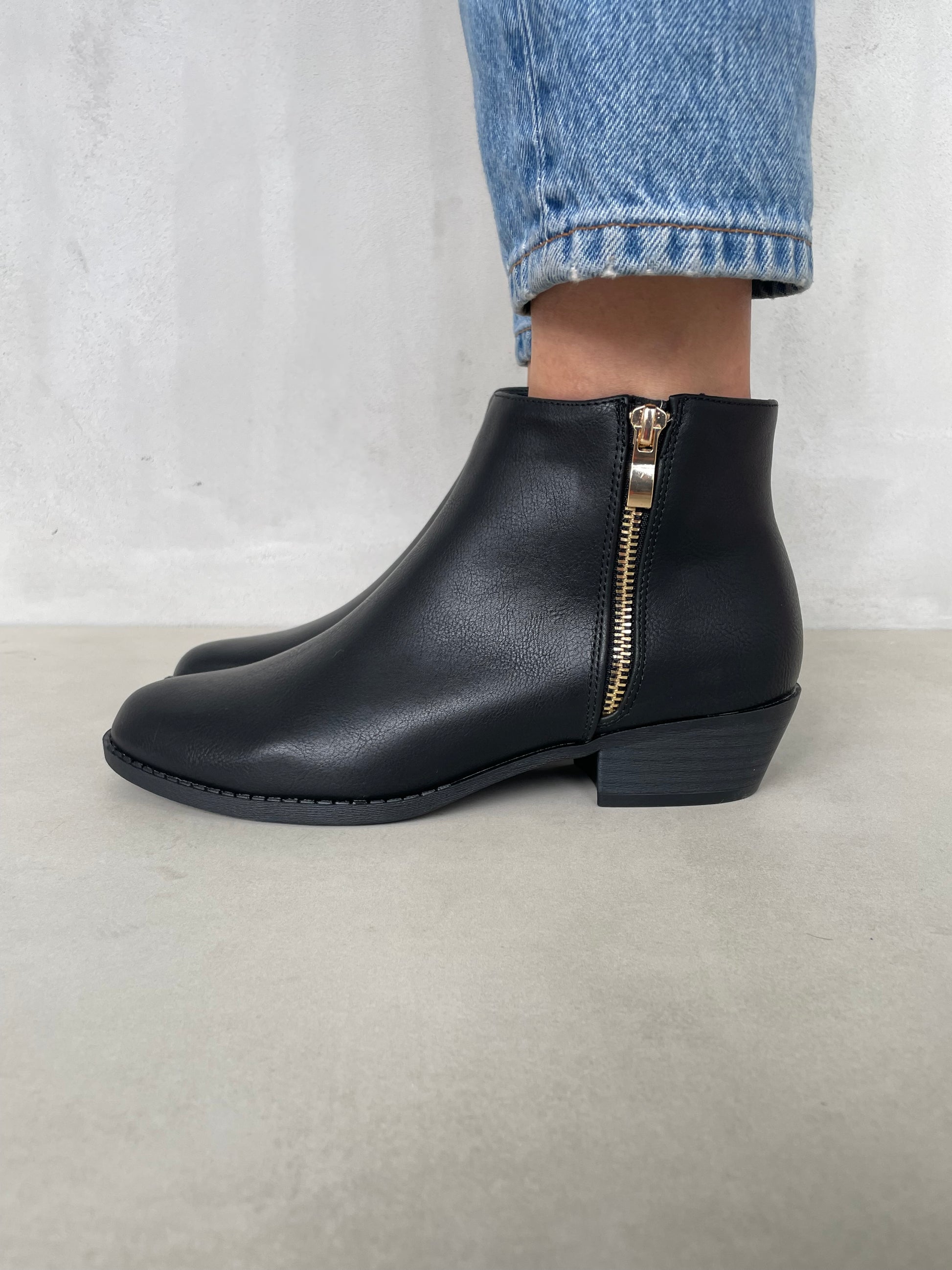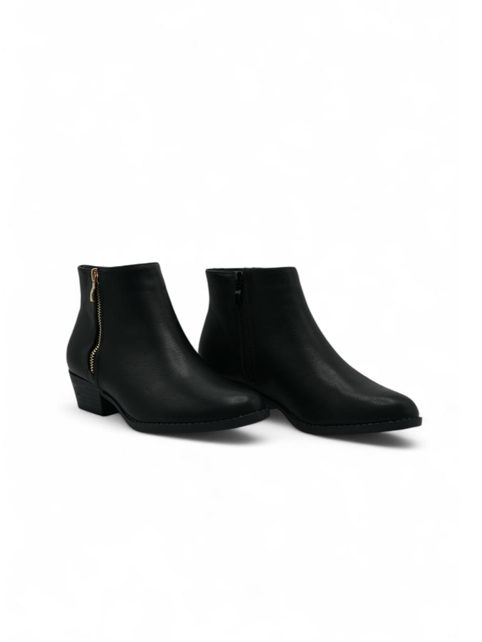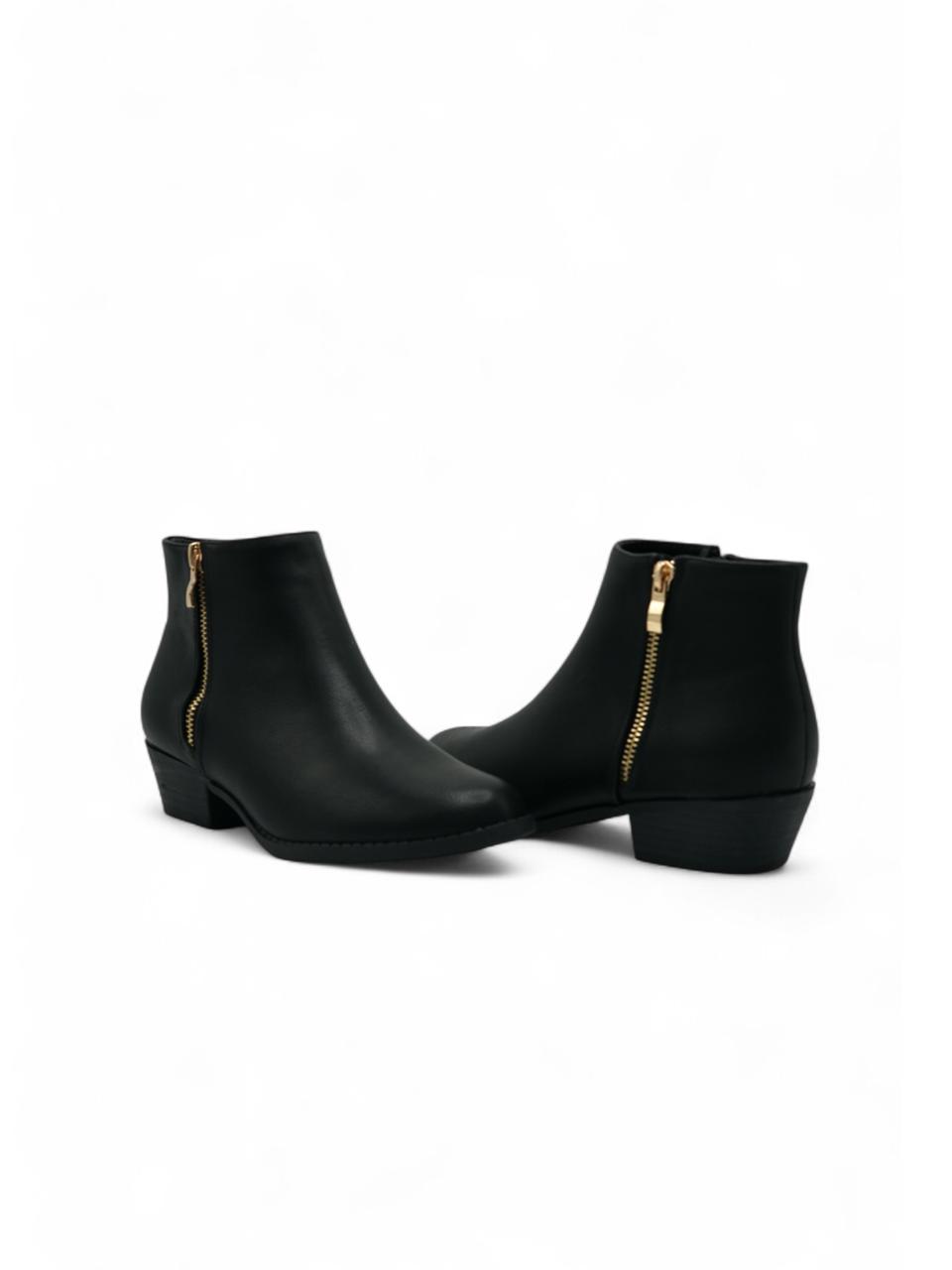Diseño minimalista con cierre lateral dorado funcional. Tacón cuadrado de altura media que brinda soporte. Acabado mate elegante y fácil de combinar. Ideal para días frescos o looks urbanos.