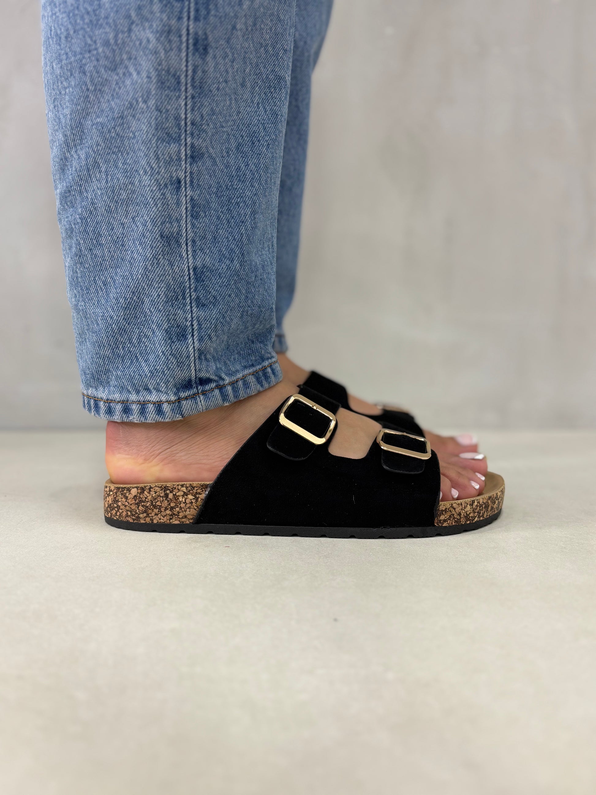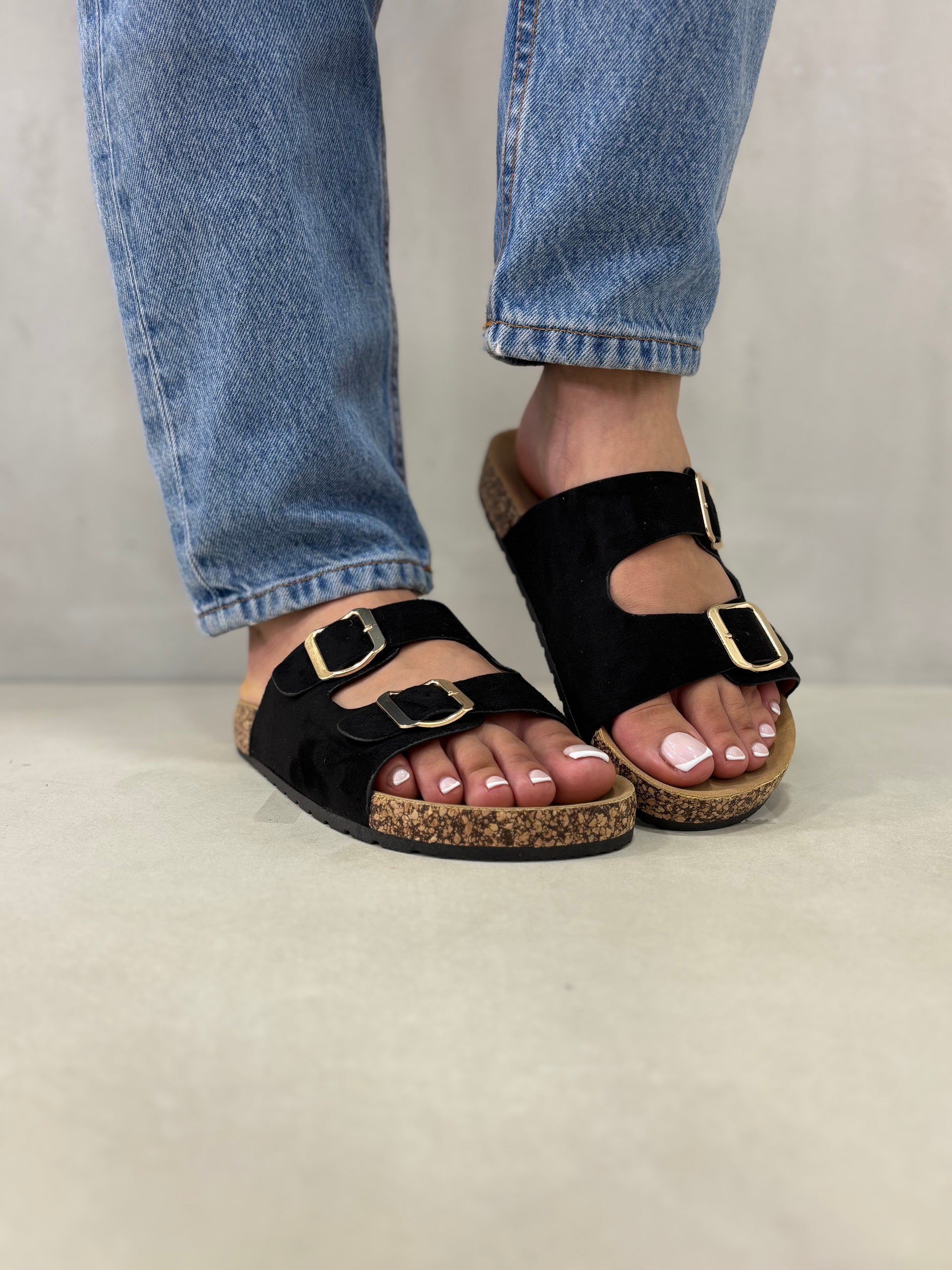 Estas sandalias negras con doble hebilla dorada son un básico versátil para el día a día. Su diseño minimalista combina una estructura ergonómica tipo corcho que brinda soporte y confort en cada paso. Perfectas para crear looks relajados con estilo y elegancia natural.
