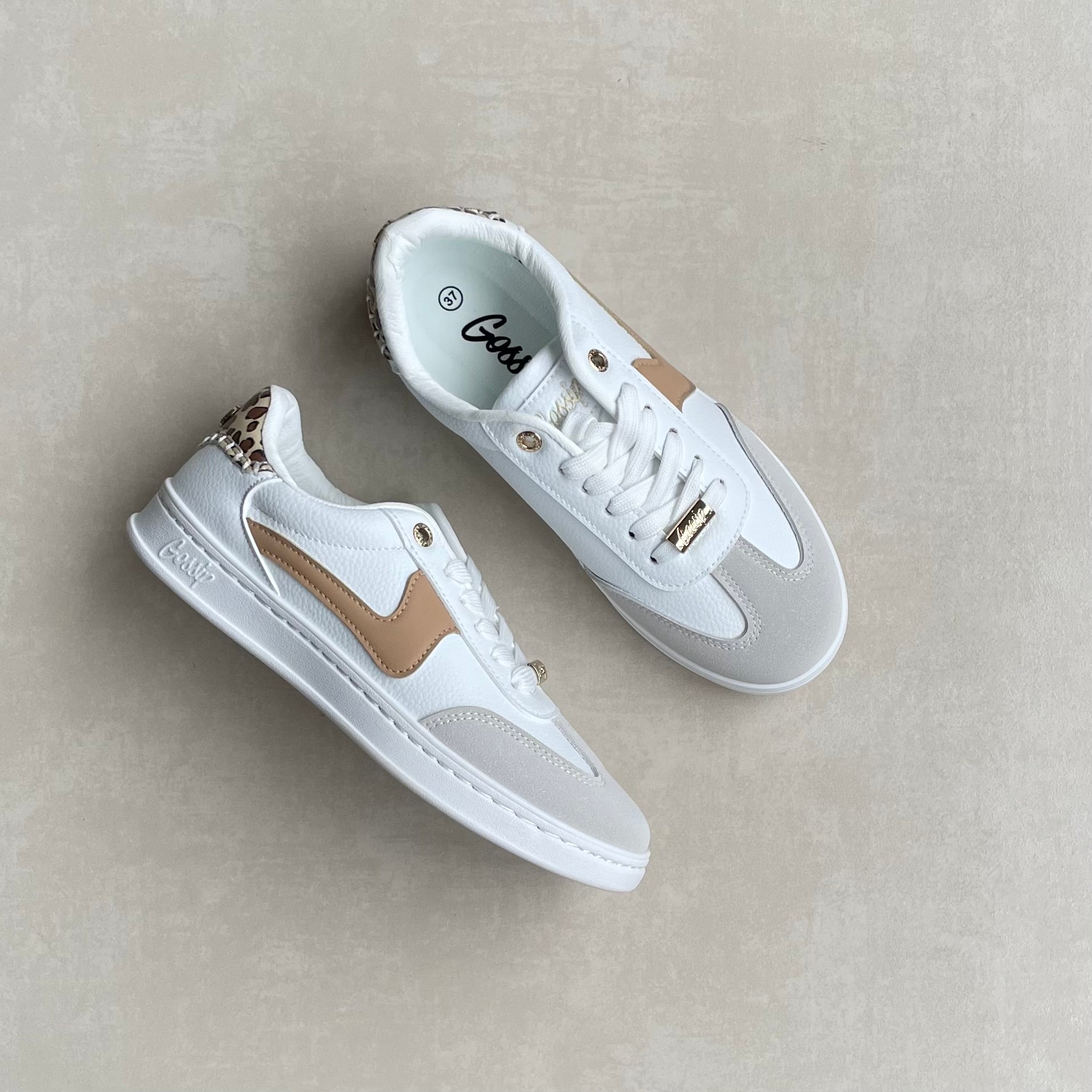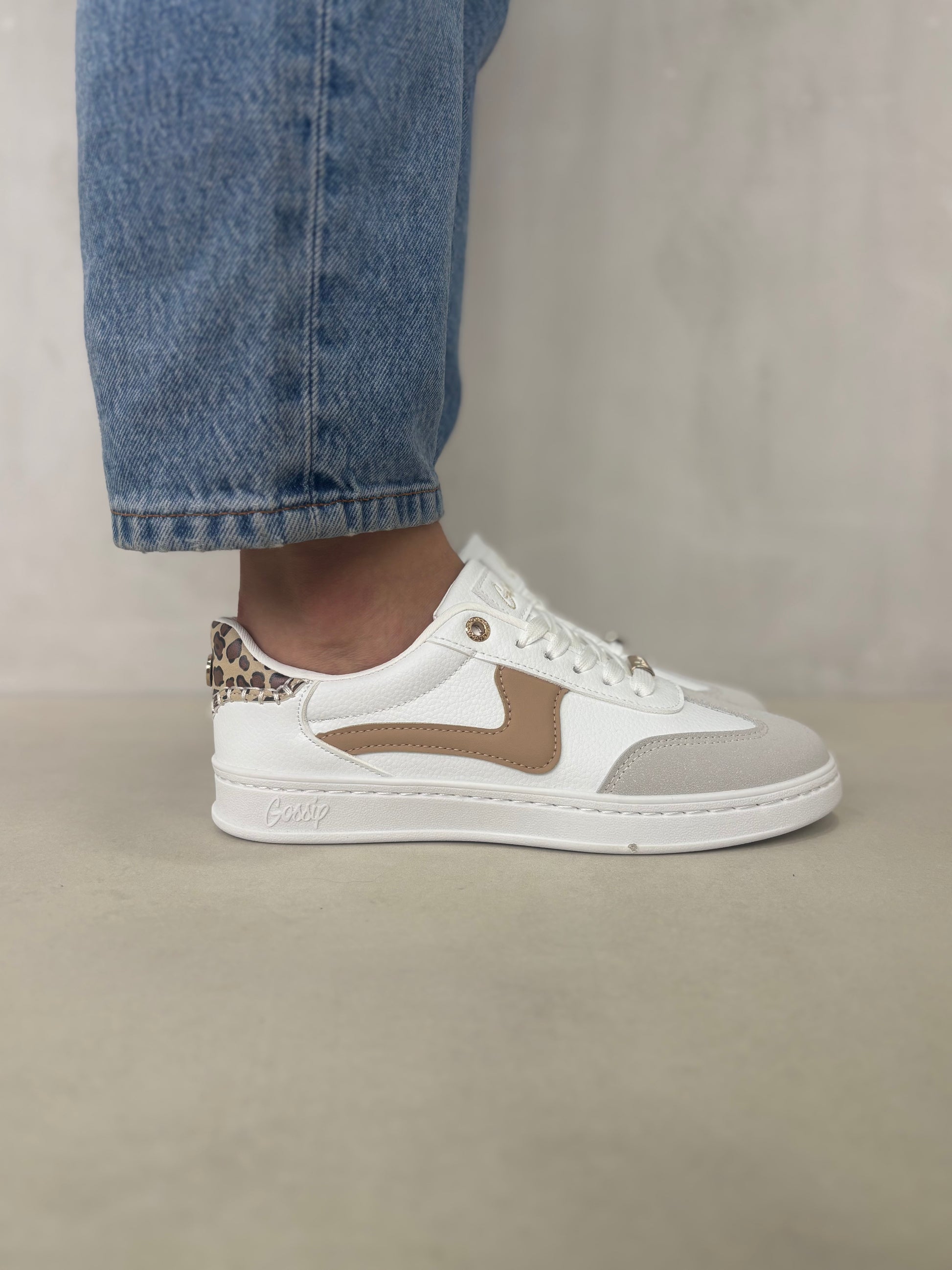 Estas zapatillas blancas con detalle beige y acento animal print destacan por su estilo chic y contemporáneo. Su mezcla de texturas y tonos neutros las convierte en un calzado versátil que eleva cualquier look. La suela blanca y el interior acolchado brindan máxima comodidad, ideal para el día a día o para crear combinaciones urbanas con personalidad.