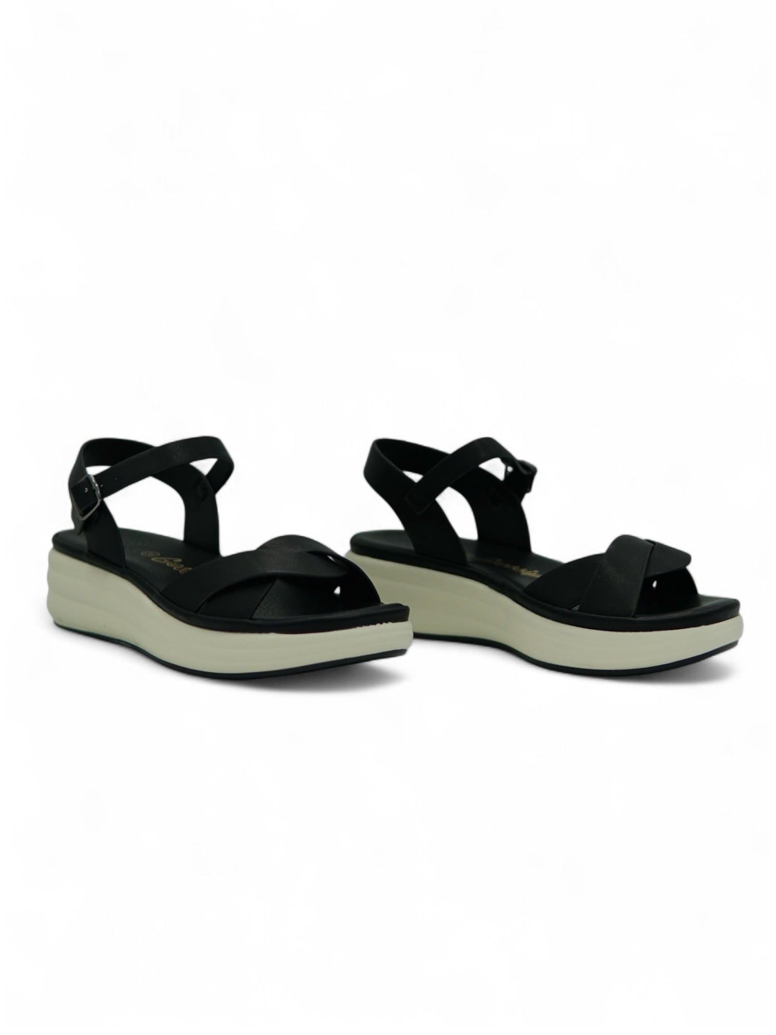 Estas sandalias negras con plataforma bicolor ofrecen un balance perfecto entre estilo y comodidad. Su diseño con tiras cruzadas y hebilla plateada aporta un toque moderno y versátil, ideal para acompañar cualquier look casual o urbano. Su suela ergonómica brinda soporte y confort durante todo el día.