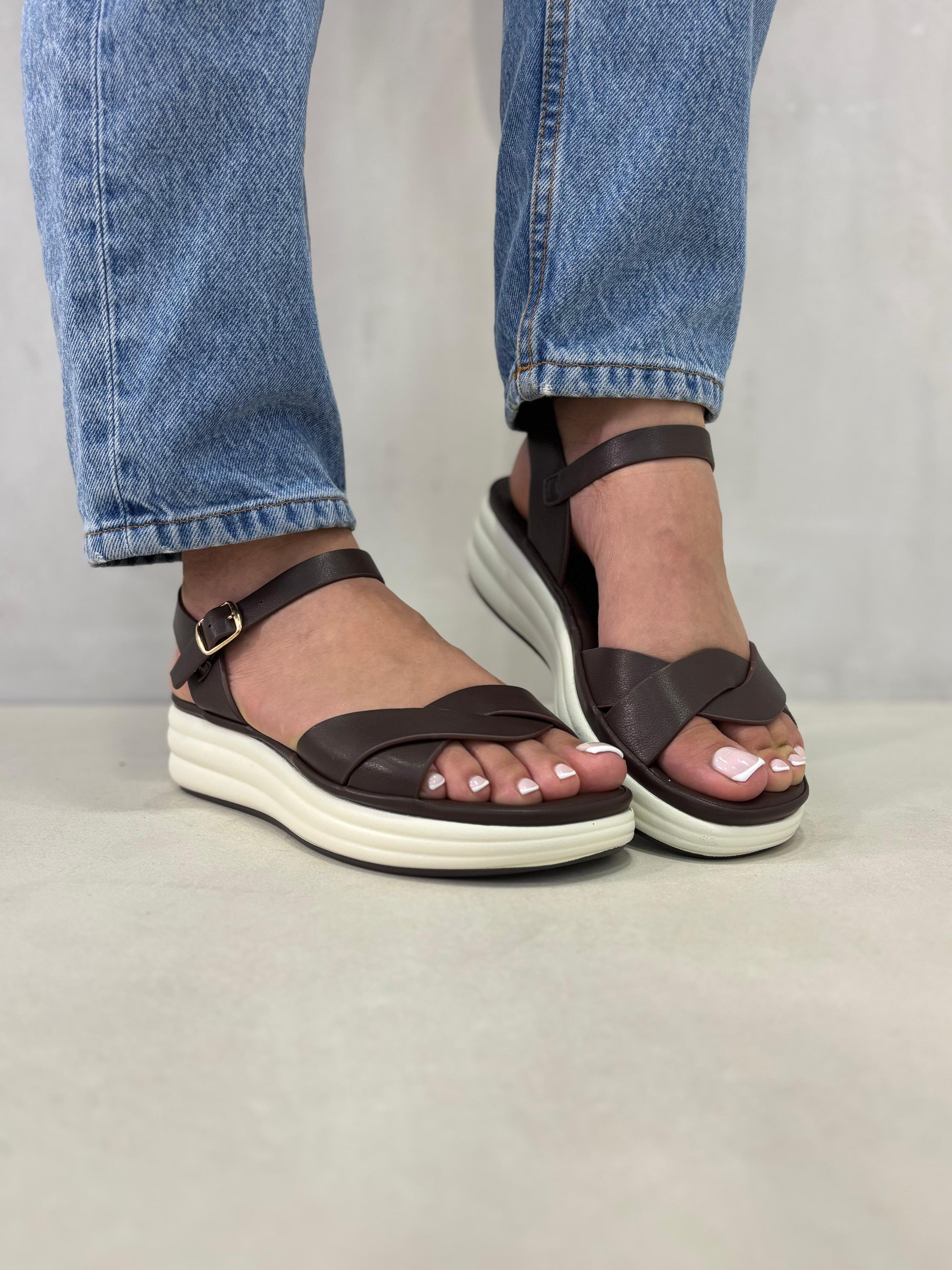 Estas sandalias color café con plataforma bicolor combinan comodidad y estilo contemporáneo. Su diseño con tiras cruzadas y hebilla metálica dorada ofrece un ajuste seguro y un toque elegante. Ideales para el día a día o salidas informales donde quieras mantenerte cómoda sin perder el estilo.