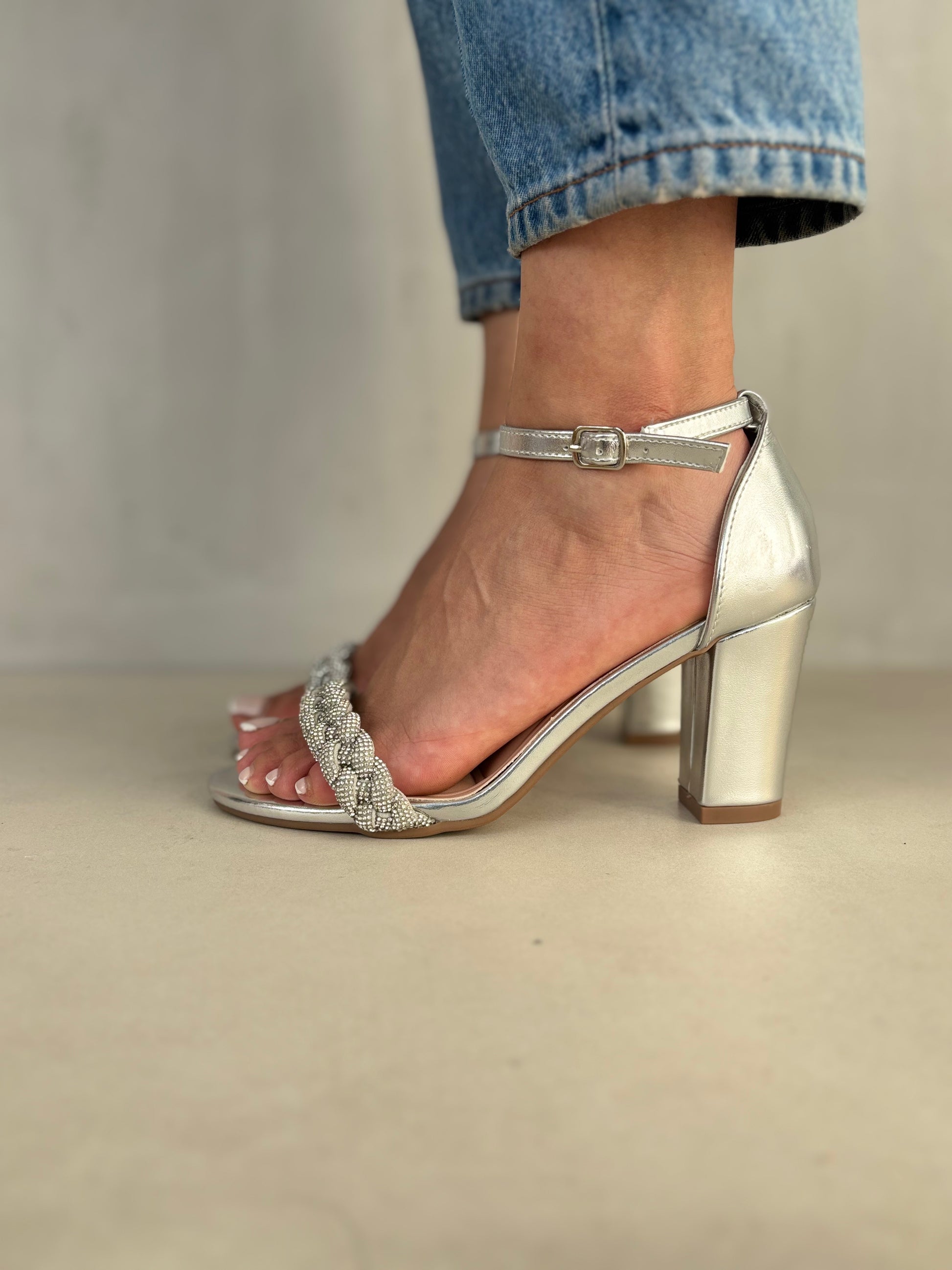 Estas sandalias plateadas con acabado metálico destacan por su diseño glamuroso y sofisticado. Incorporan una tira frontal trenzada con pedrería brillante y una correa ajustable al tobillo que aporta estabilidad. Su tacón cuadrado las hace perfectas para eventos, fiestas o celebraciones donde el estilo es protagonista.