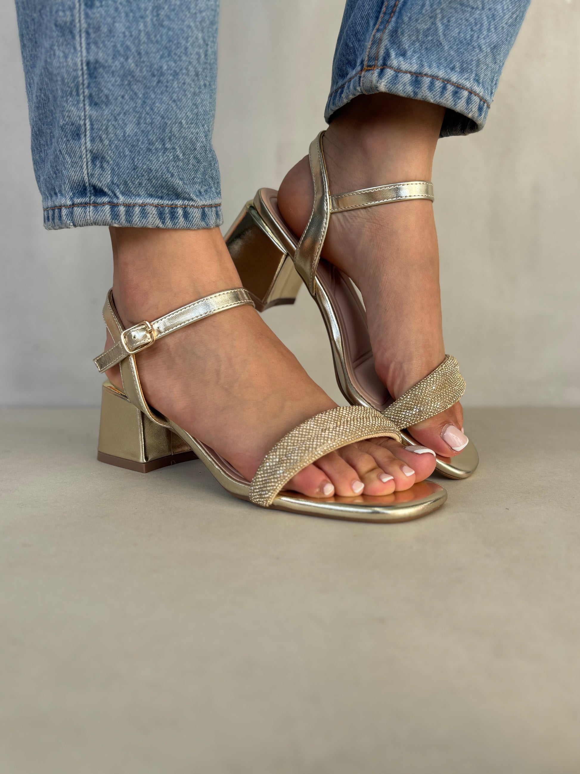Sandalias doradas con brillantes y tacón cuadrado para dama