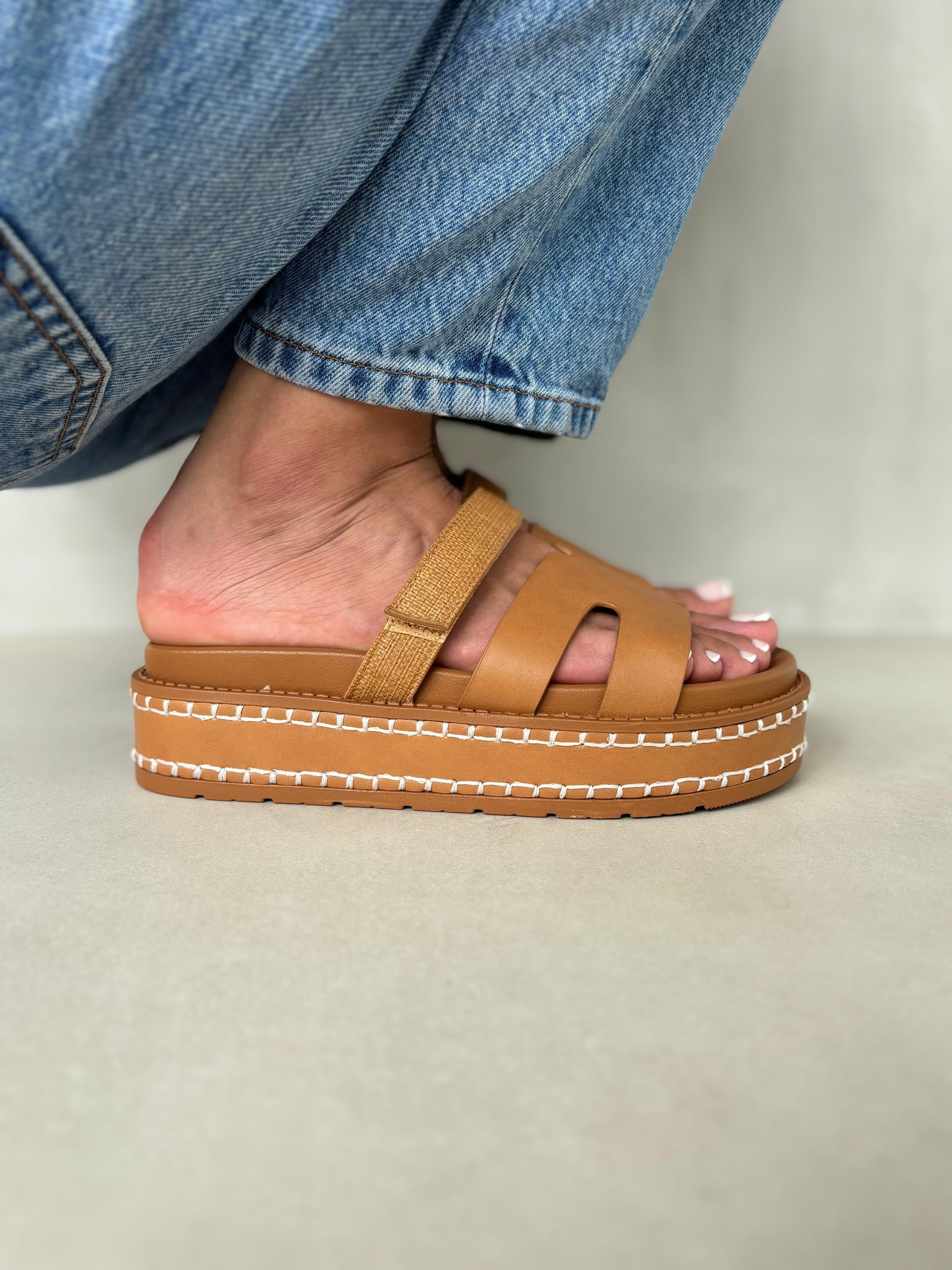 Estas sandalias color camel con plataforma fusionan comodidad y estilo artesanal moderno. Su diseño de tiras anchas con textura tejida aporta un toque natural, mientras la suela elevada con detalle de costura blanca brinda estabilidad y un look veraniego sofisticado. Perfectas para combinar con prendas frescas o atuendos casuales de temporada.