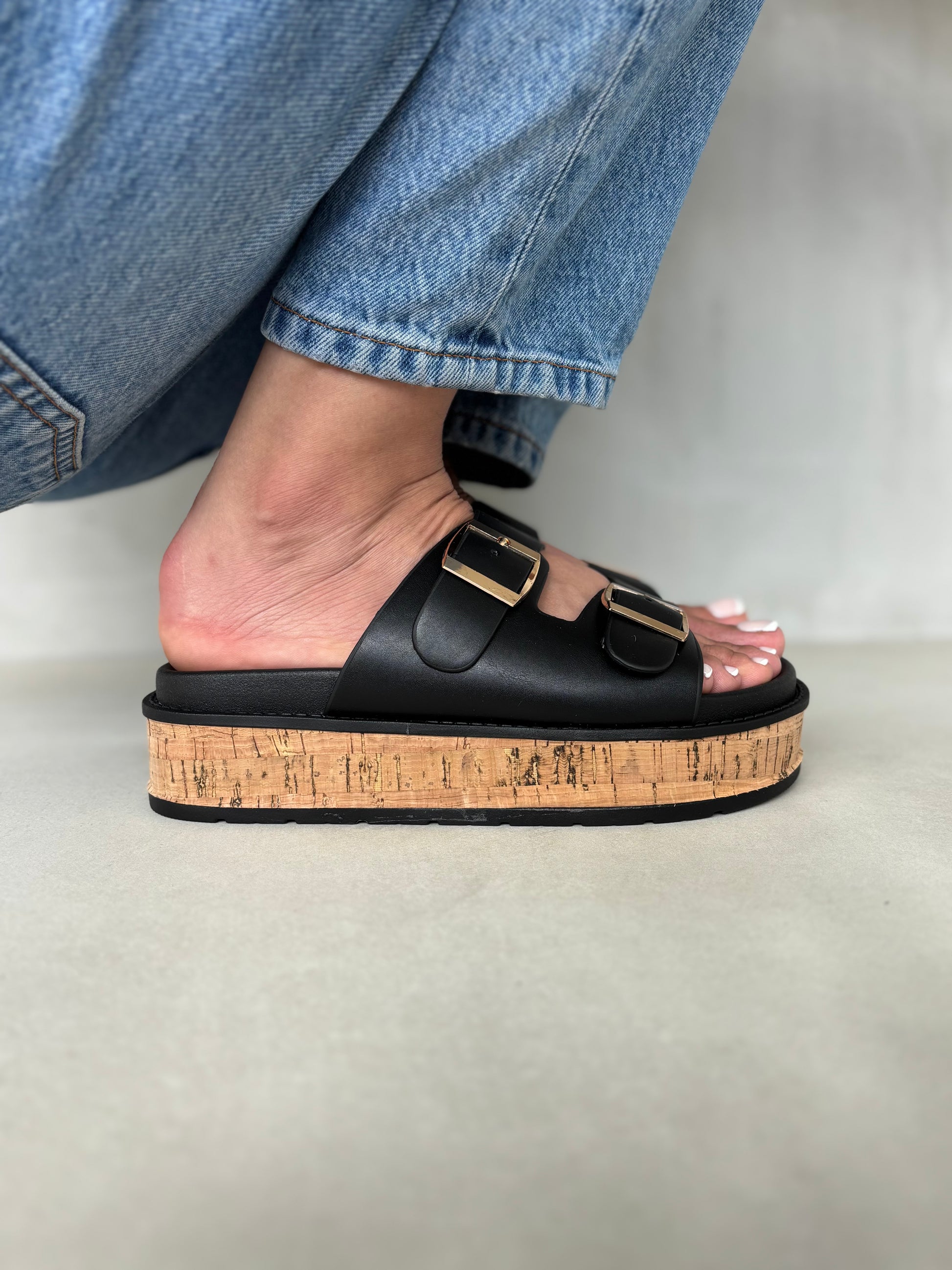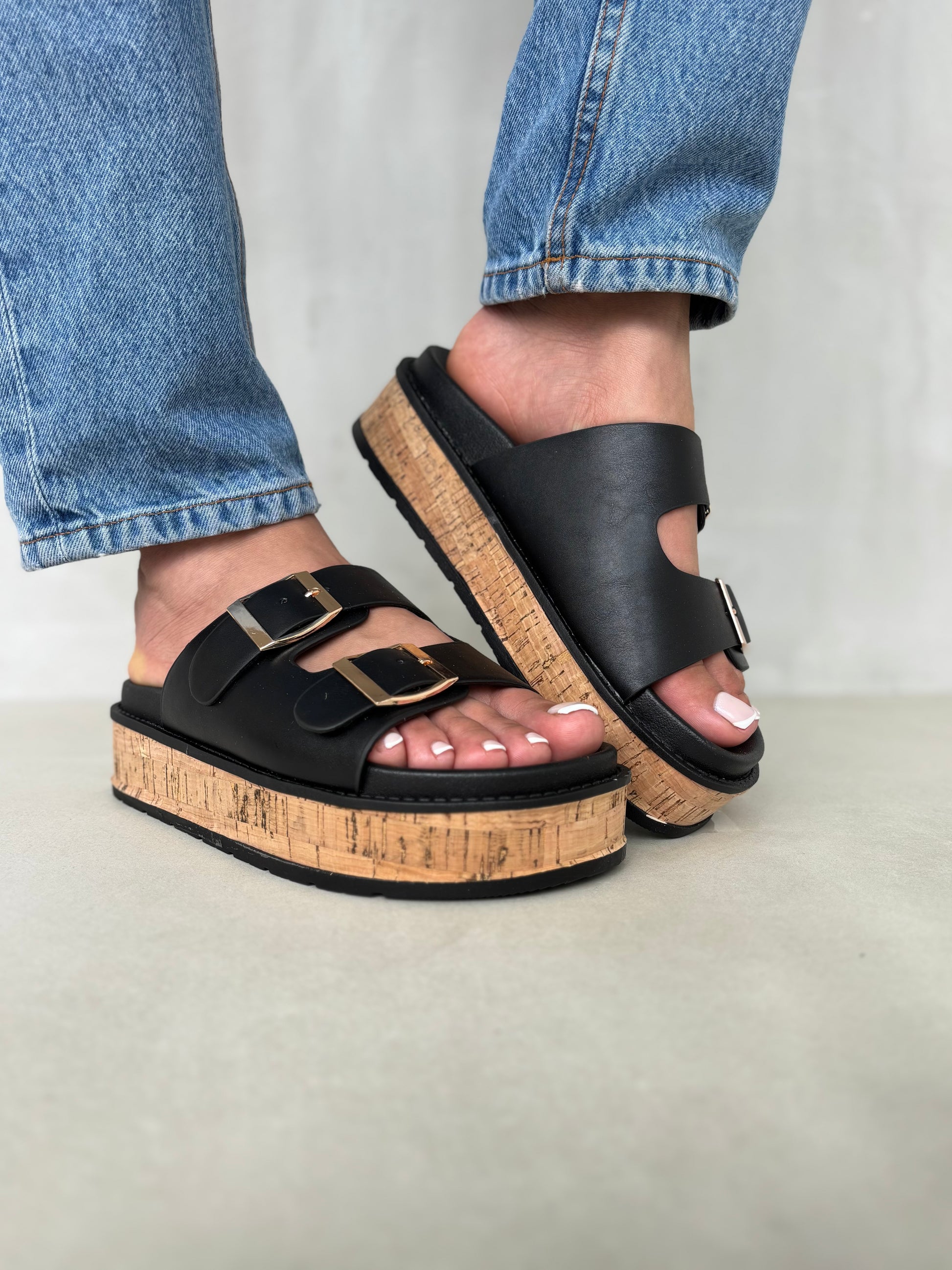 Estas sandalias negras combinan elegancia contemporánea y confort natural. Su doble hebilla dorada contrasta con la plataforma de efecto corcho, creando un look moderno con esencia artesanal. Son ligeras, estables y perfectas para el uso diario, aportando altura sin perder comodidad. Ideales para combinar con jeans, vestidos o faldas veraniegas.