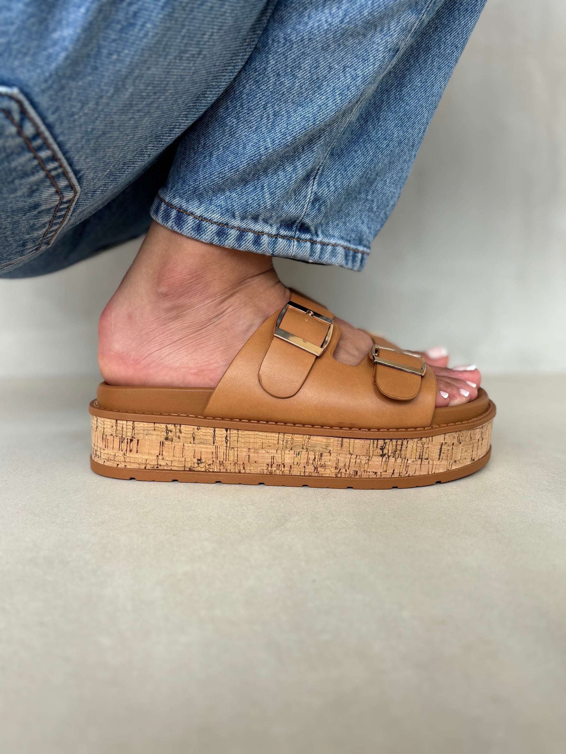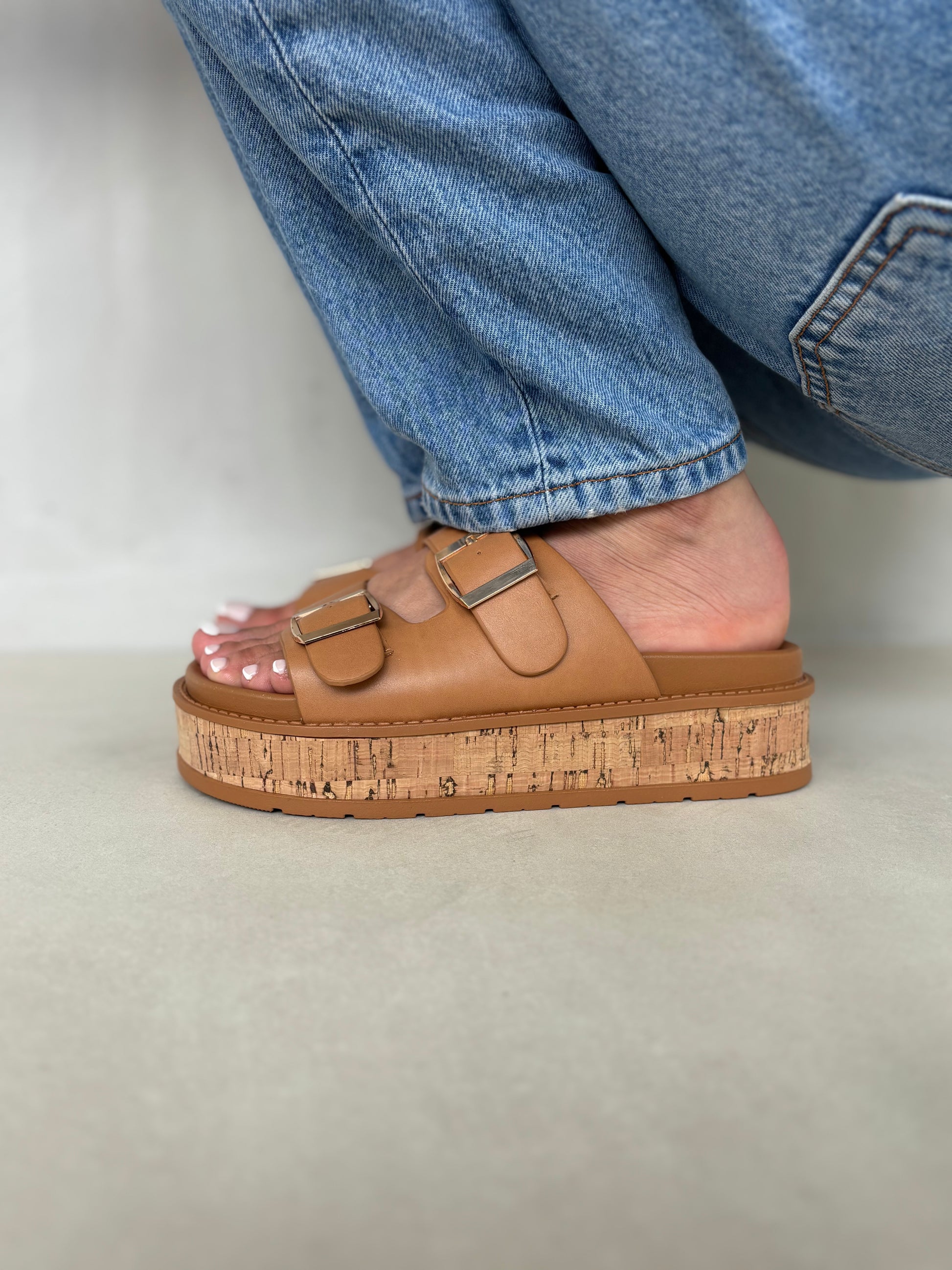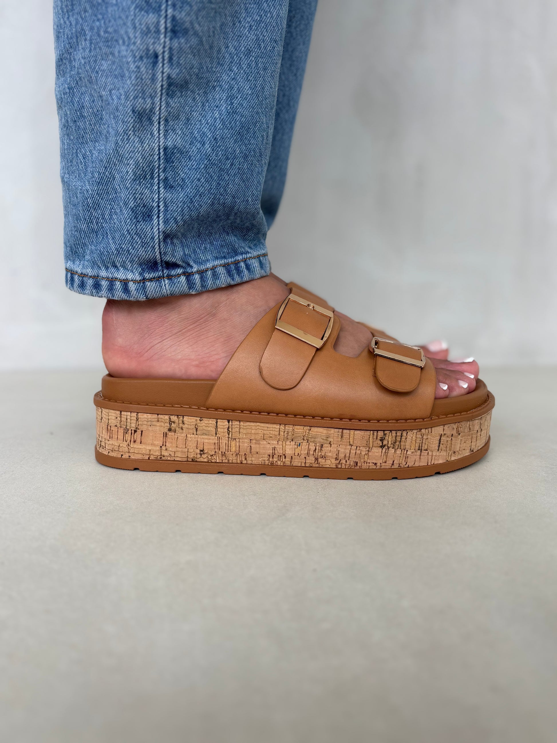Sandalias Camel con Plataforma de Corcho y Hebillas Doradas