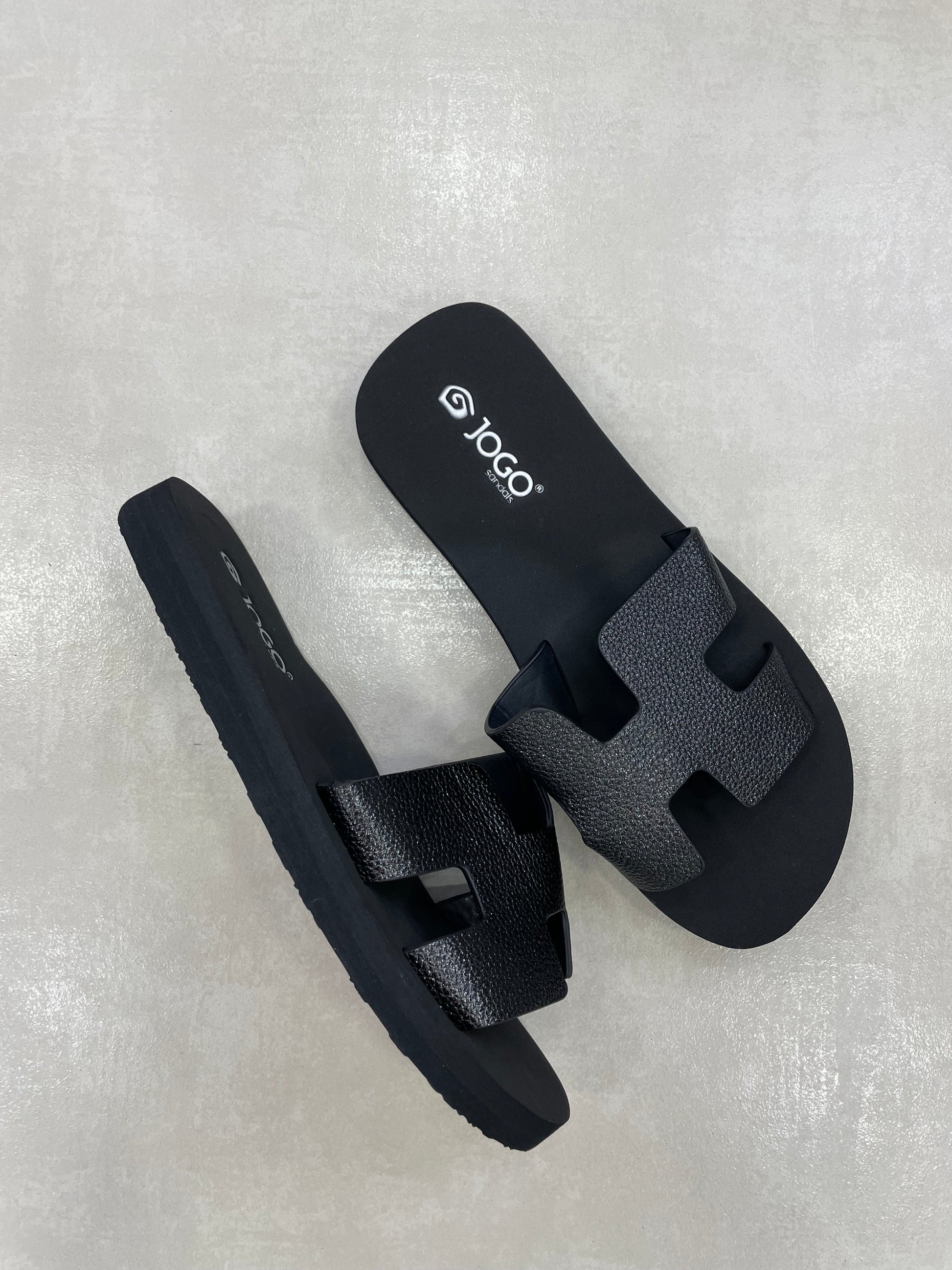 Estas sandalias negras con acabado brillante aportan un toque de elegancia moderna a cualquier look. Su diseño con tiras anchas en forma de “H” brinda un ajuste cómodo y seguro, mientras que la suela liviana y flexible garantiza comodidad para uso diario. Perfectas para combinar con atuendos casuales o de verano.