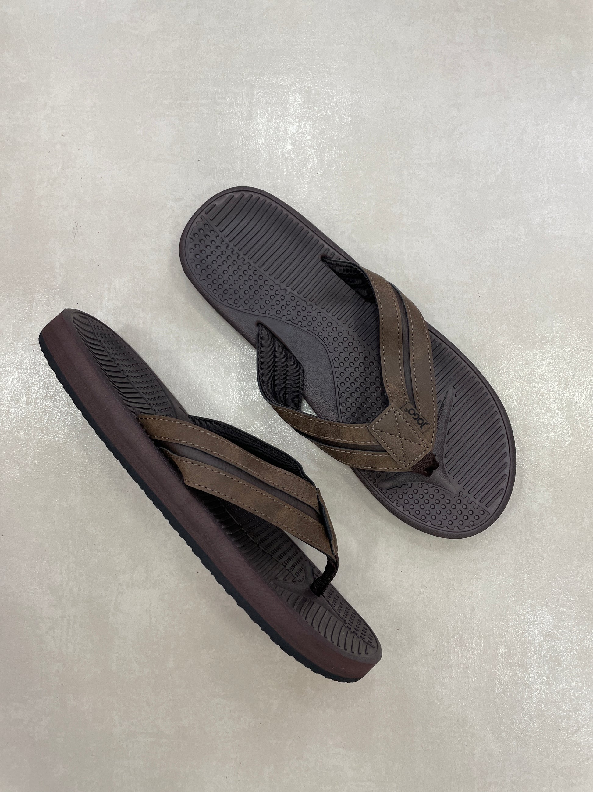 Estas chancletas en tono marrón oscuro están diseñadas para brindar máxima resistencia y confort. Su correa ancha de doble capa ofrece un soporte firme, mientras la plantilla texturizada se adapta al pie para una pisada más estable. Perfectas para días calurosos, descanso o uso diario.