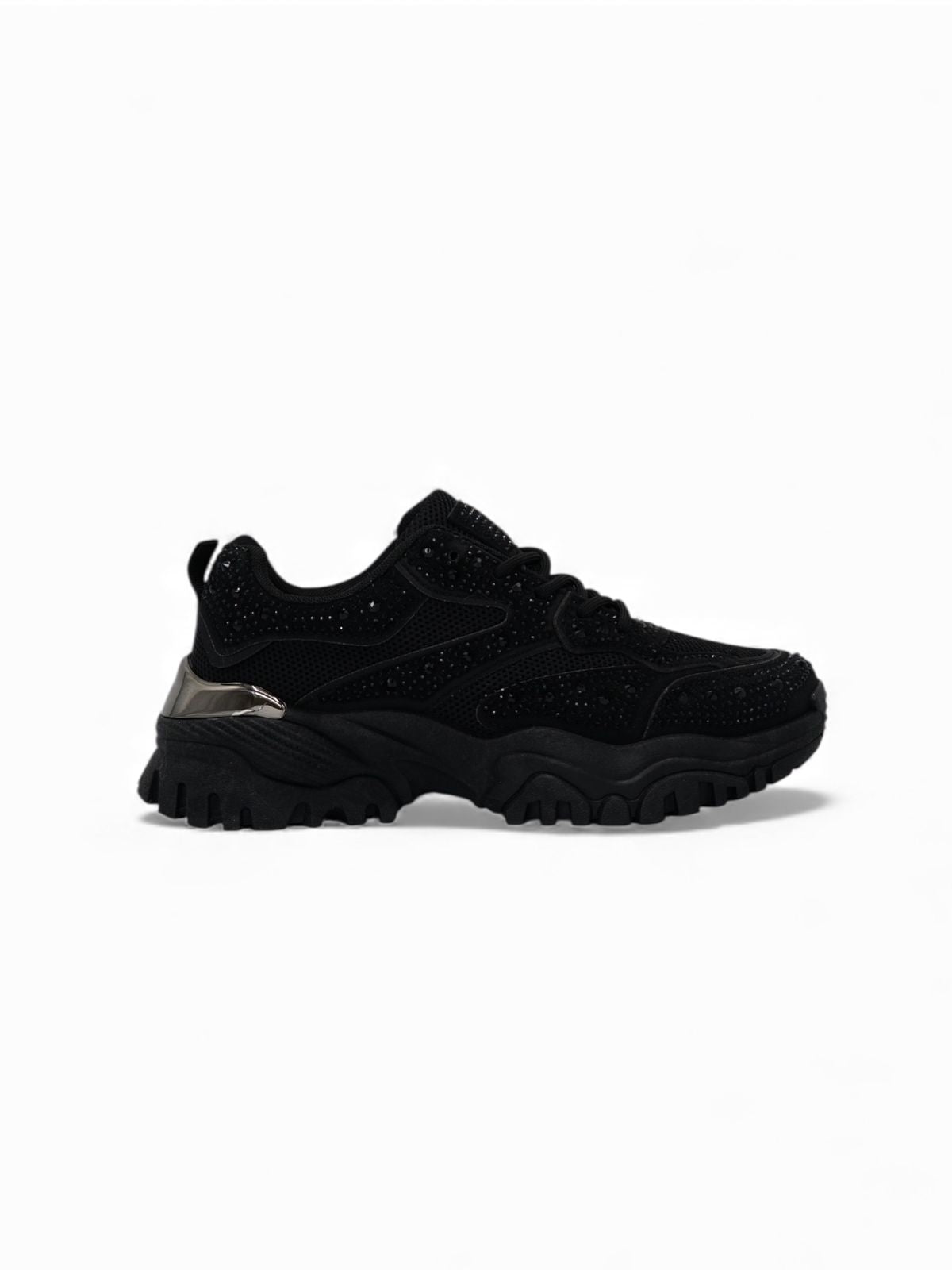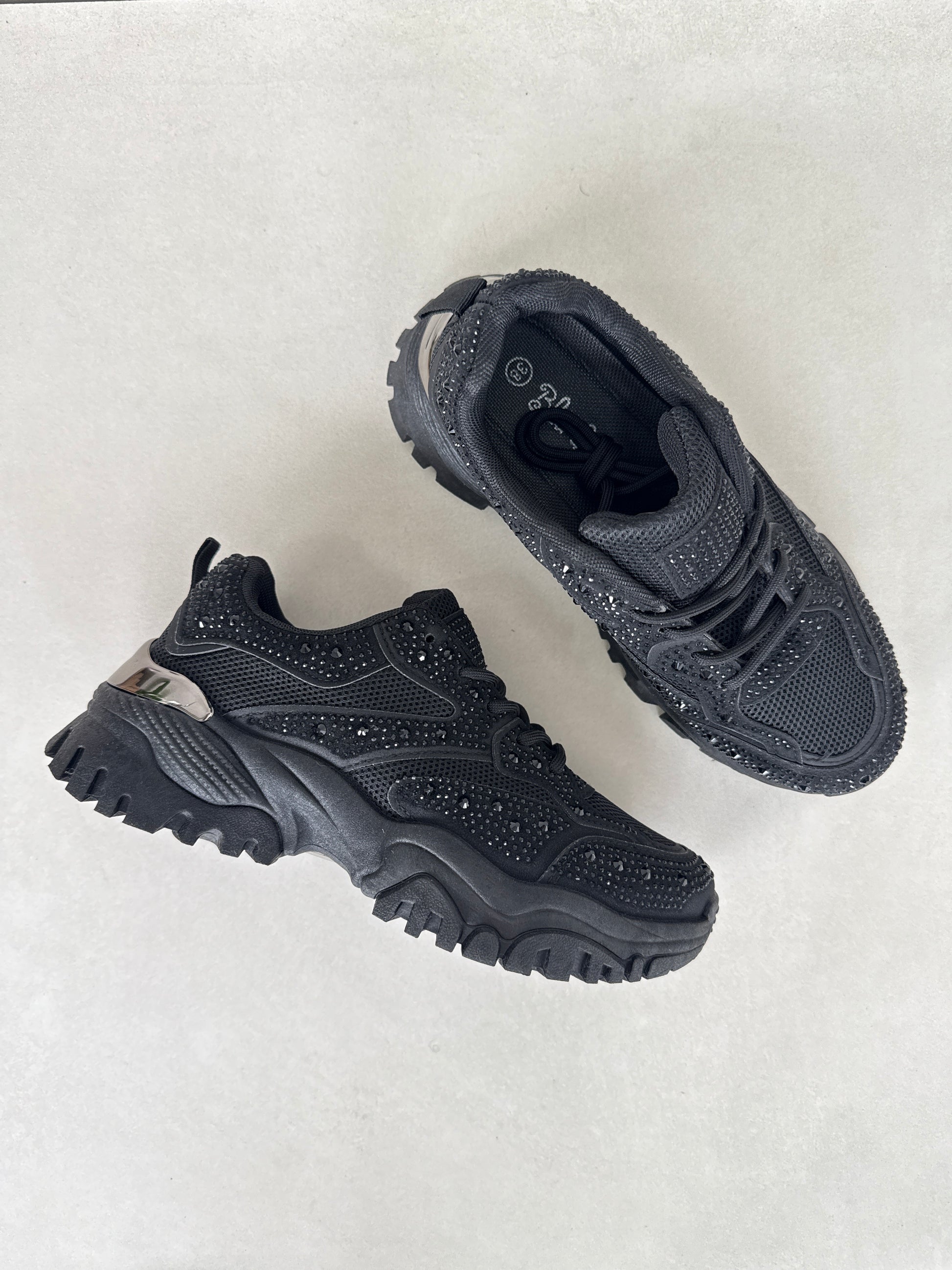 Estas zapatillas negras con brillos integran comodidad y glamour en un solo diseño. Su estructura robusta tipo chunky aporta soporte y altura, mientras los detalles brillantes añaden un toque moderno y atrevido. Ideales para looks urbanos, salidas casuales o outfits con un giro audaz.