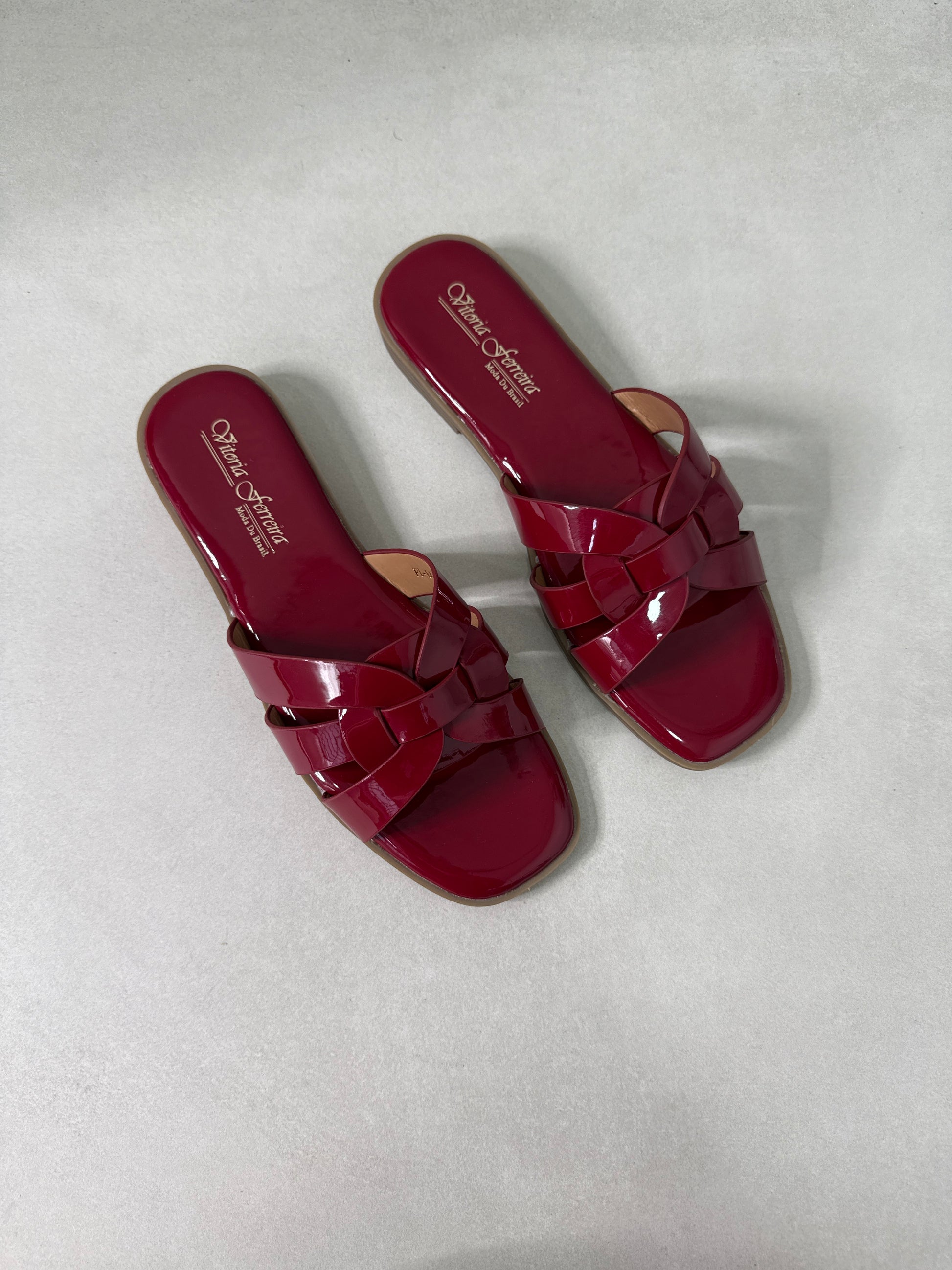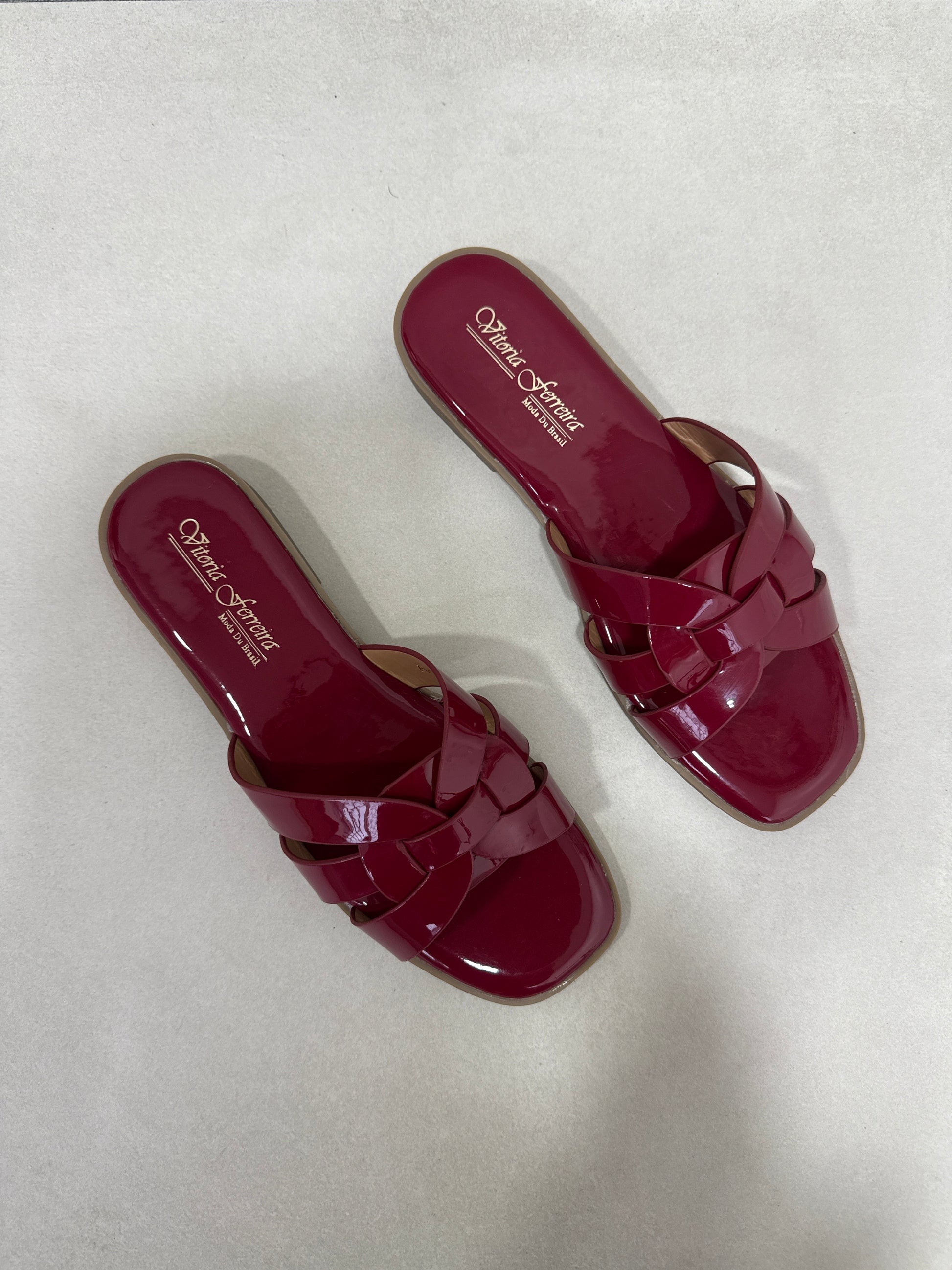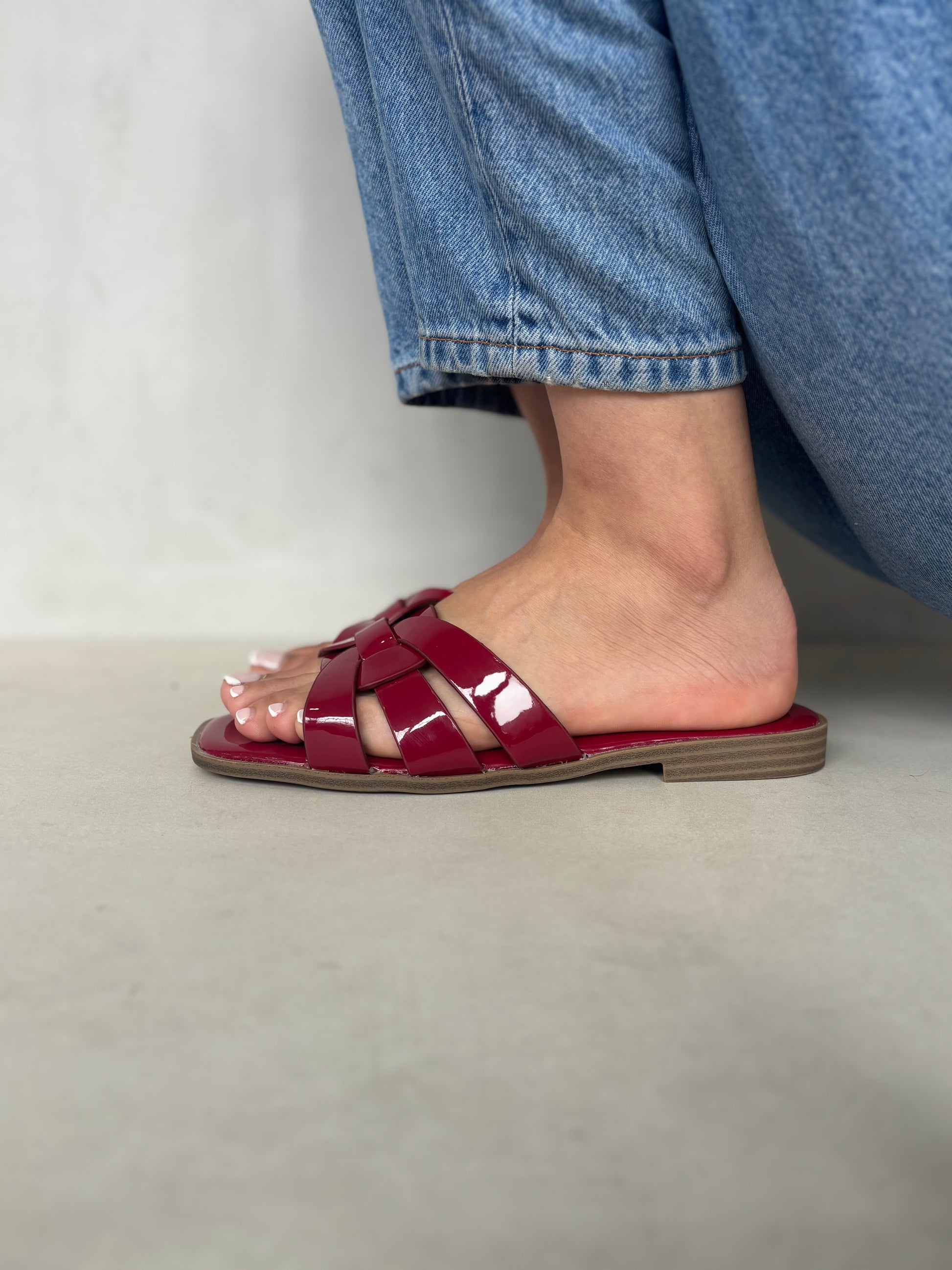 Estas sandalias burdeos destacan por su acabado brillante y su diseño entrelazado que aporta un toque refinado y moderno. Su estructura plana y ligera garantiza comodidad, ideal para el uso diario o para complementar looks elegantes en climas cálidos. El tono burdeos ofrece una estética sofisticada que combina a la perfección con jeans, faldas o vestidos, brindando equilibrio entre moda y confort.
