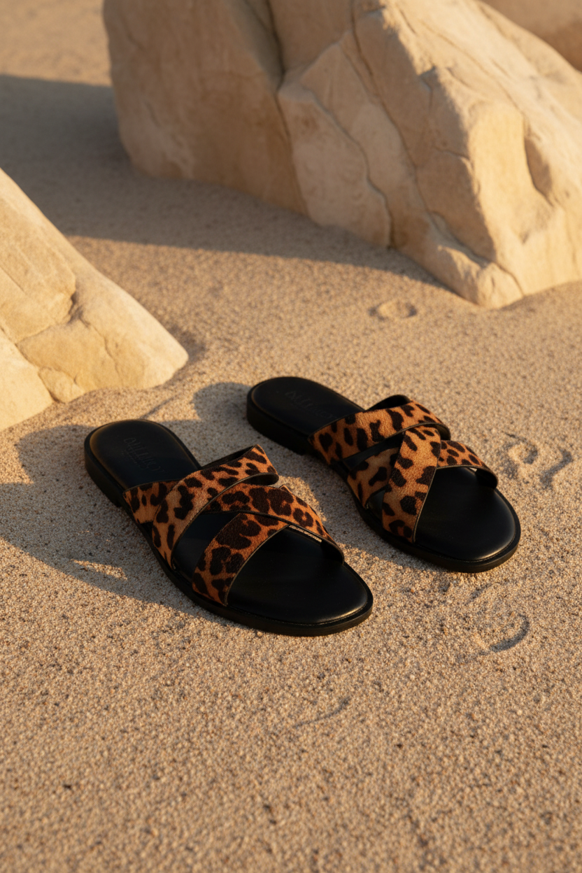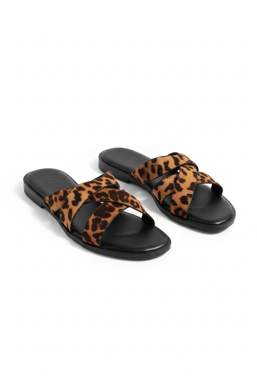 Agregá un toque audaz a tu look con estas sandalias planas de diseño cruzado y estampado de leopardo. Su estructura ligera y suela negra plana ofrecen comodidad para todo el día, mientras que la textura animal print en las tiras aporta un aire salvaje y sofisticado. Son el complemento ideal para resaltar outfits neutros o monocromáticos con un detalle de tendencia.