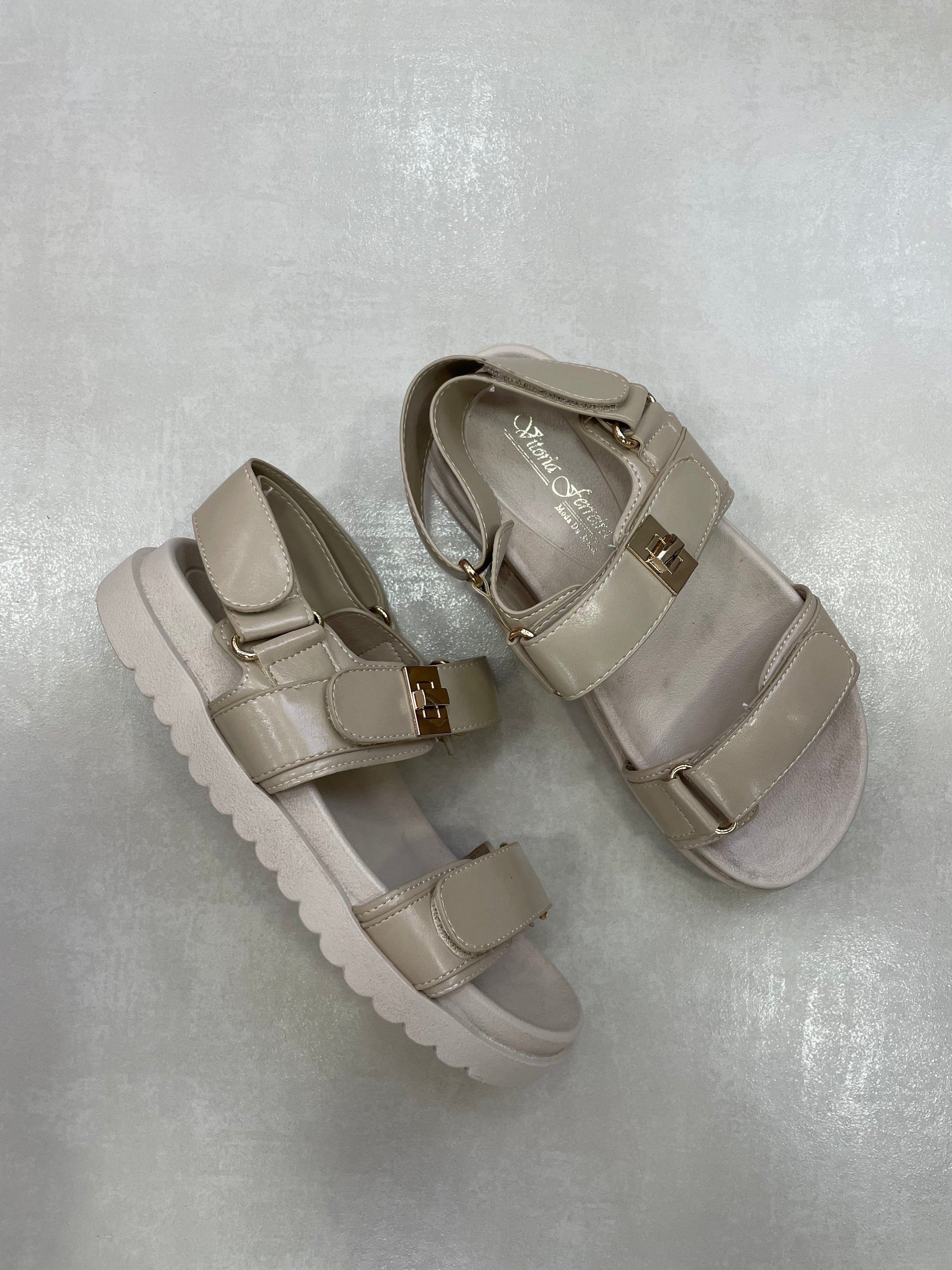Estas sandalias beige están diseñadas para ofrecer ligereza y confort durante todo el día. Su estructura de doble correa ajustable con detalles metálicos dorados combina practicidad y estilo, mientras la plataforma texturizada proporciona estabilidad y un look contemporáneo. Ideales para acompañar atuendos casuales o de verano con un toque refinado.