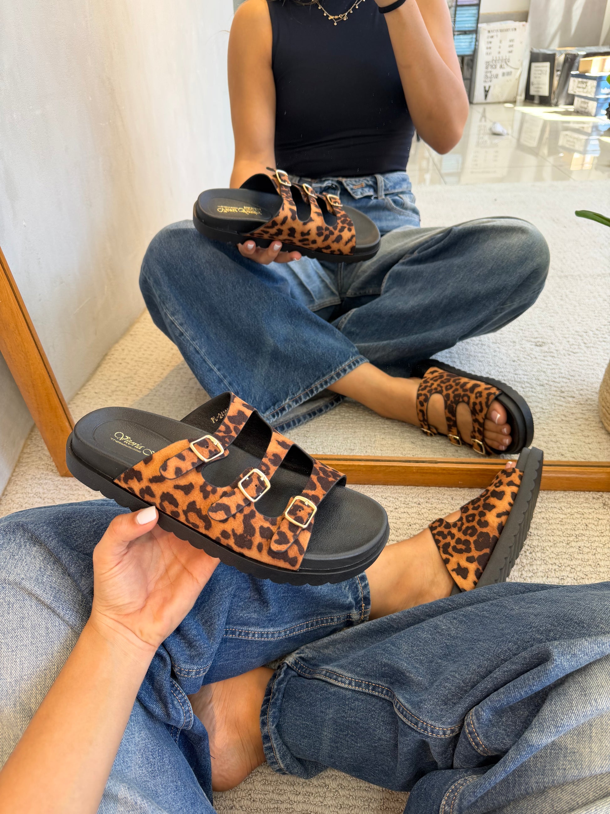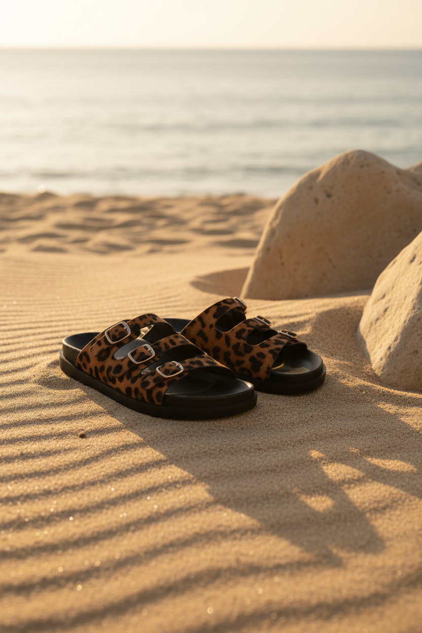 Estas sandalias tipo slide fusionan la tendencia del estampado animal print con un diseño urbano y funcional. Cuentan con tres tiras ajustables mediante hebillas doradas que permiten un calce personalizado y añaden un toque sofisticado. Su suela negra ligera y dentada ofrece comodidad y un look moderno para el uso diario.