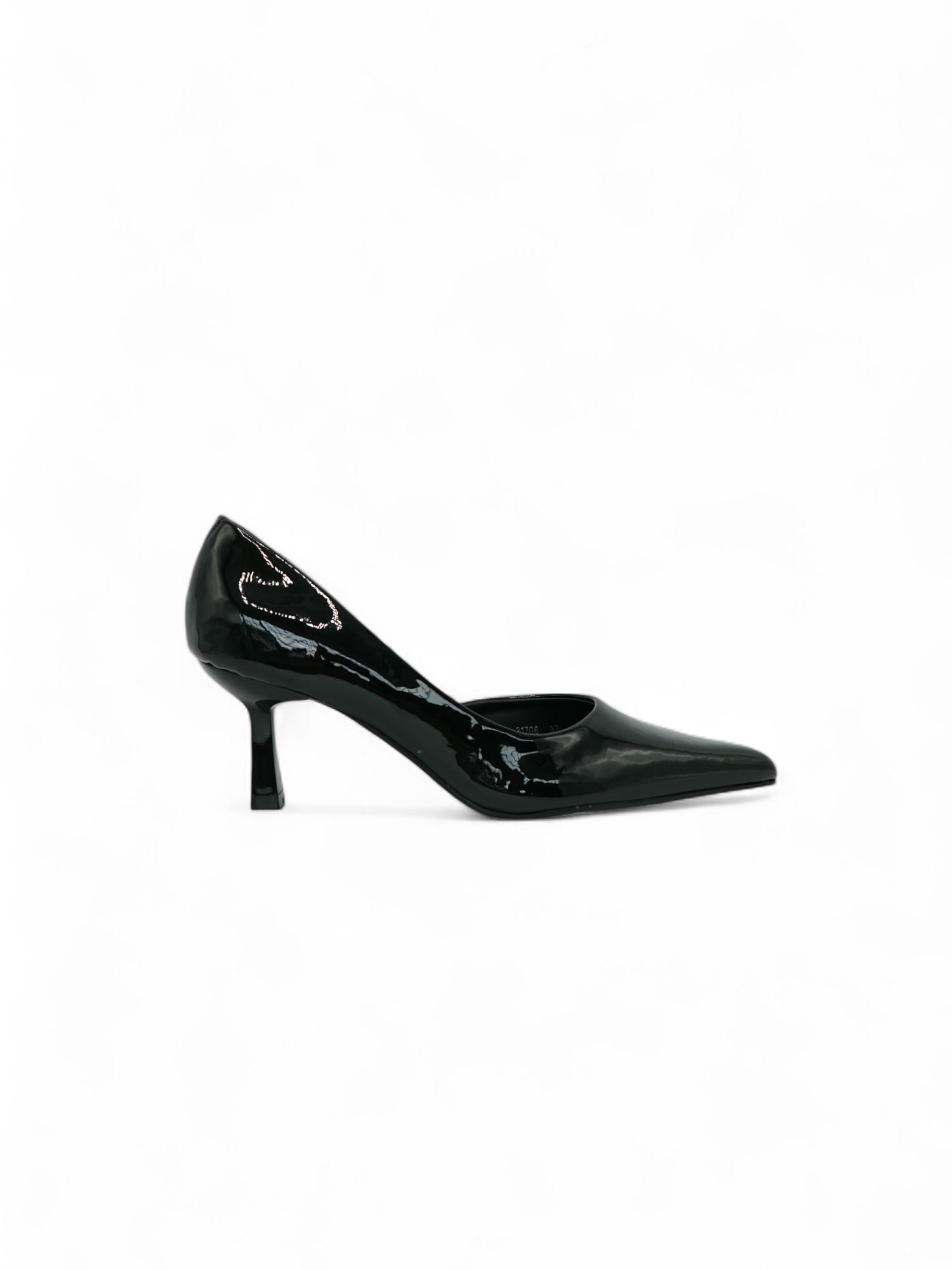 Estos tacones negros de charol con punta fina son el clásico infaltable en todo guardarropa femenino. Su diseño elegante con acabado brillante y tacón delgado crea una silueta estilizada, perfecta para eventos formales, oficina o salidas nocturnas. Combinan elegancia, estabilidad y un toque moderno que resalta cualquier outfit.