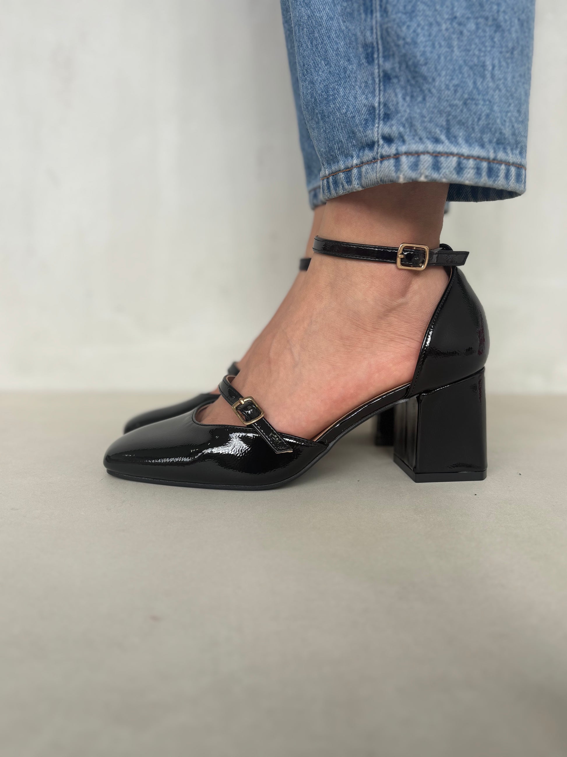 Estos zapatos negros de charol con tacón cuadrado reinterpretan la clásica silueta Mary Jane con un acabado moderno y sofisticado. Su doble correa ajustable realza el empeine y aporta seguridad al caminar, mientras el brillo del material eleva cualquier atuendo con un aire refinado y versátil.