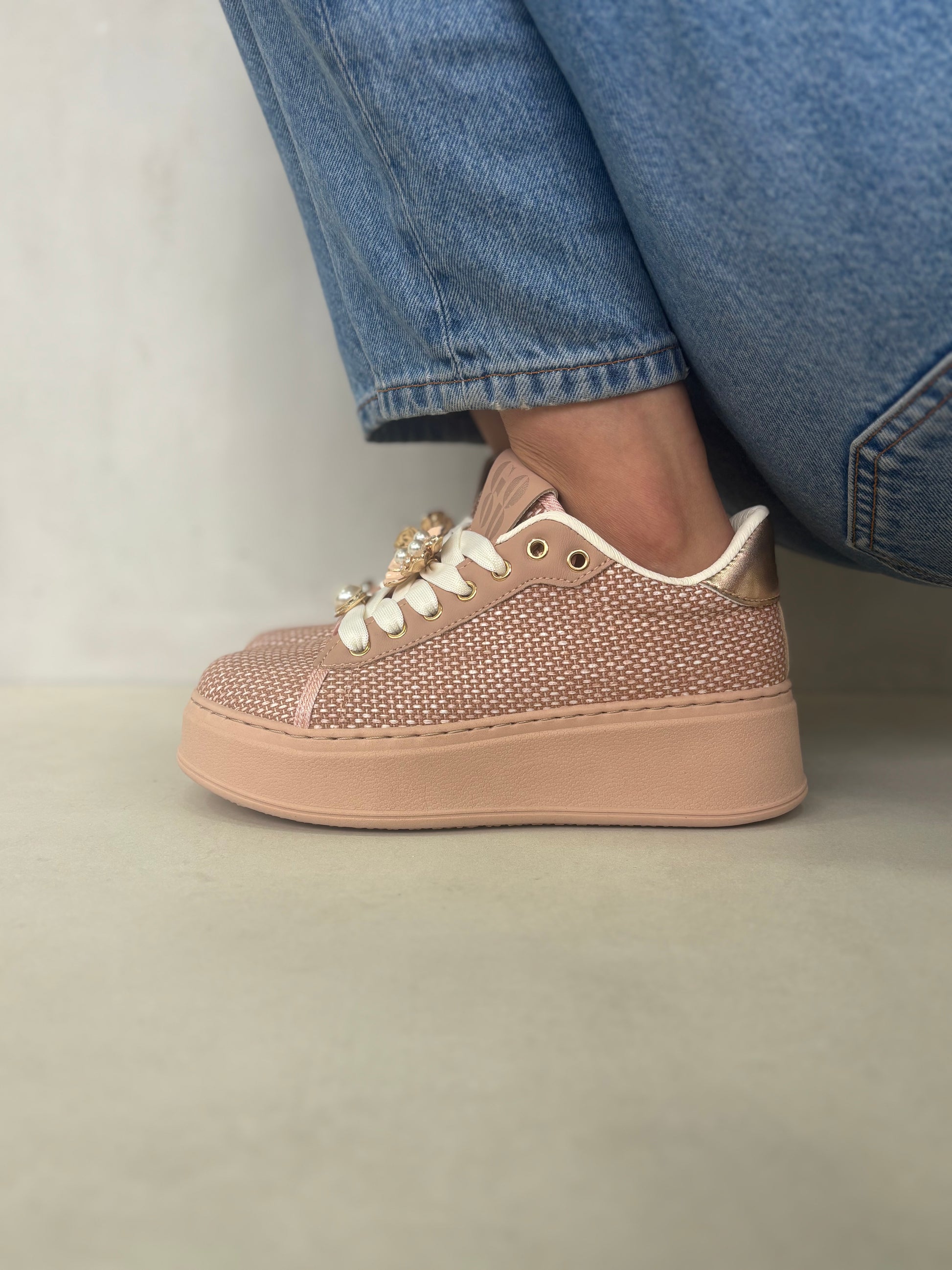 Estas zapatillas rosadas con plataforma elevan tu look con un diseño moderno y elegante. El acabado con textura brillante y los adornos de perlas y dorado en los cordones aportan un toque de distinción. Su interior acolchonado y suela elevada garantizan comodidad y estabilidad en cada paso, ideales para un estilo casual chic.