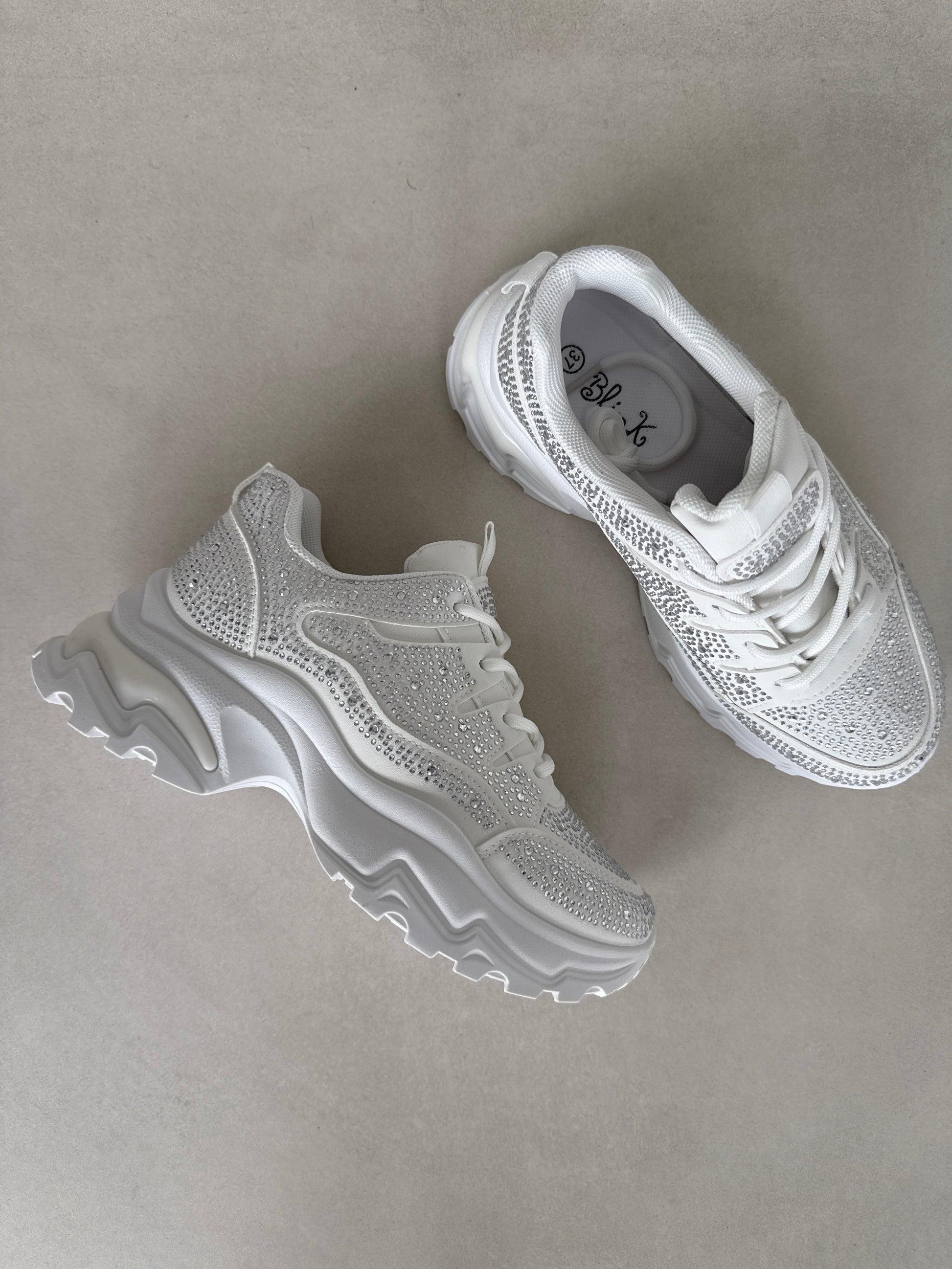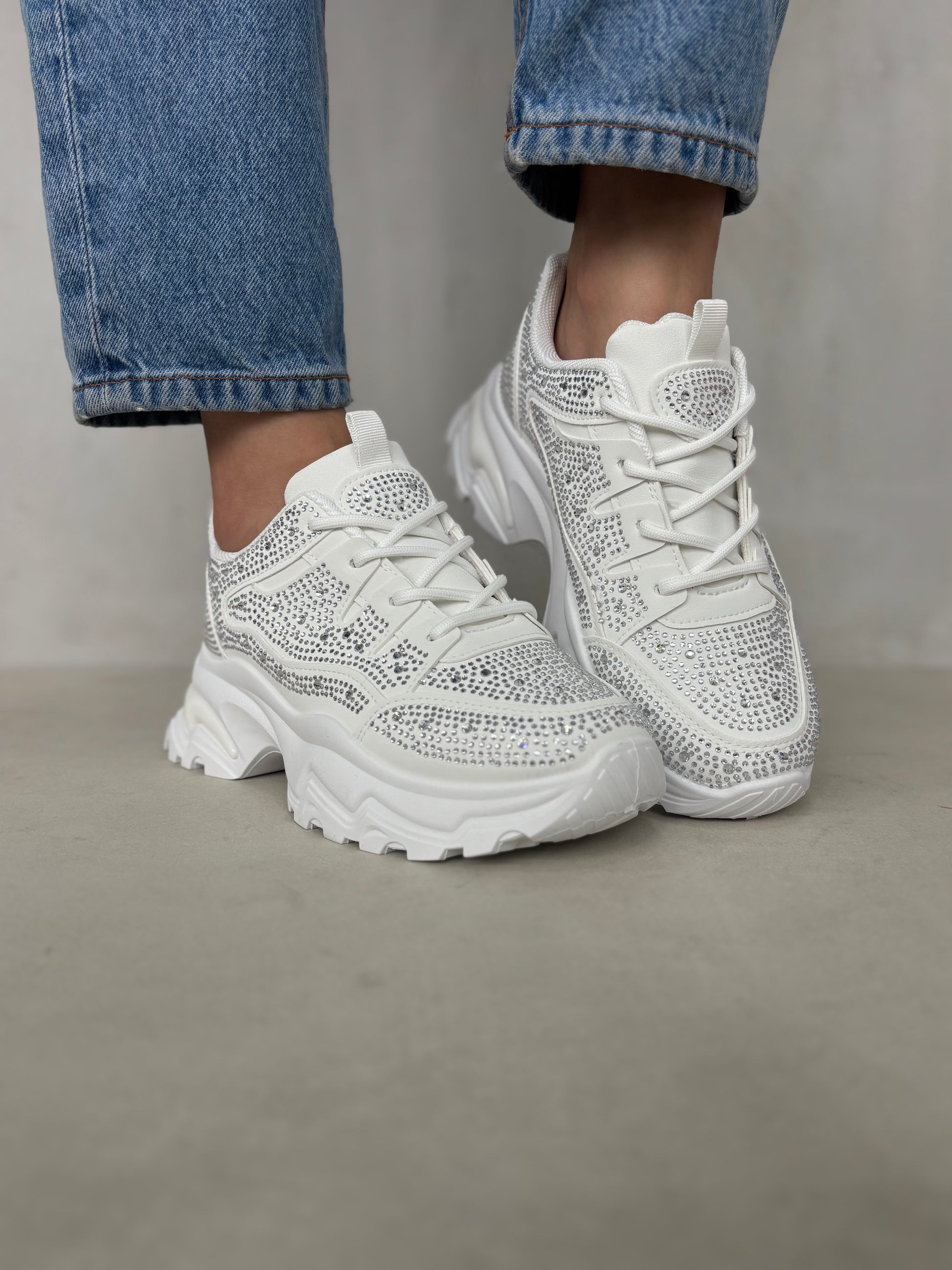 Estas zapatillas blancas combinan diseño moderno y detalles brillantes para un look audaz y femenino. Su estructura robusta tipo chunky aporta altura y estilo, mientras que la plantilla acolchonada ofrece una pisada suave y cómoda. Ideales para elevar cualquier outfit casual o sporty con un toque de glamour.