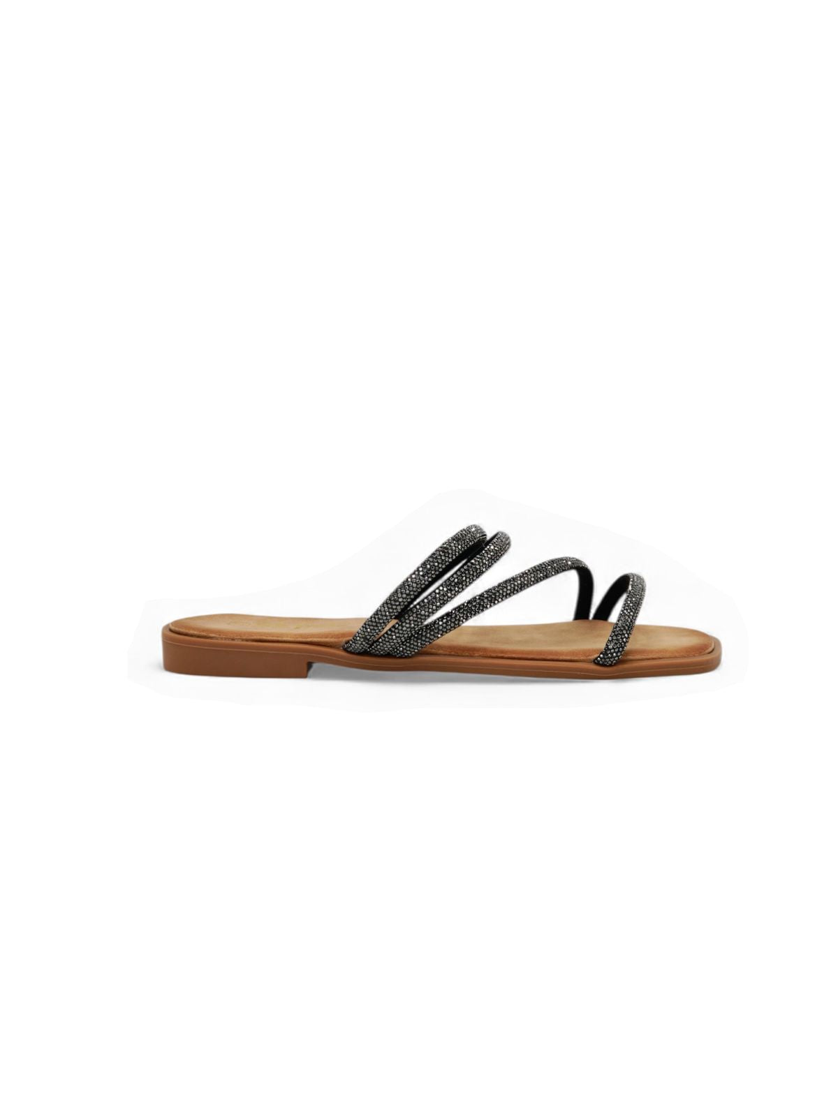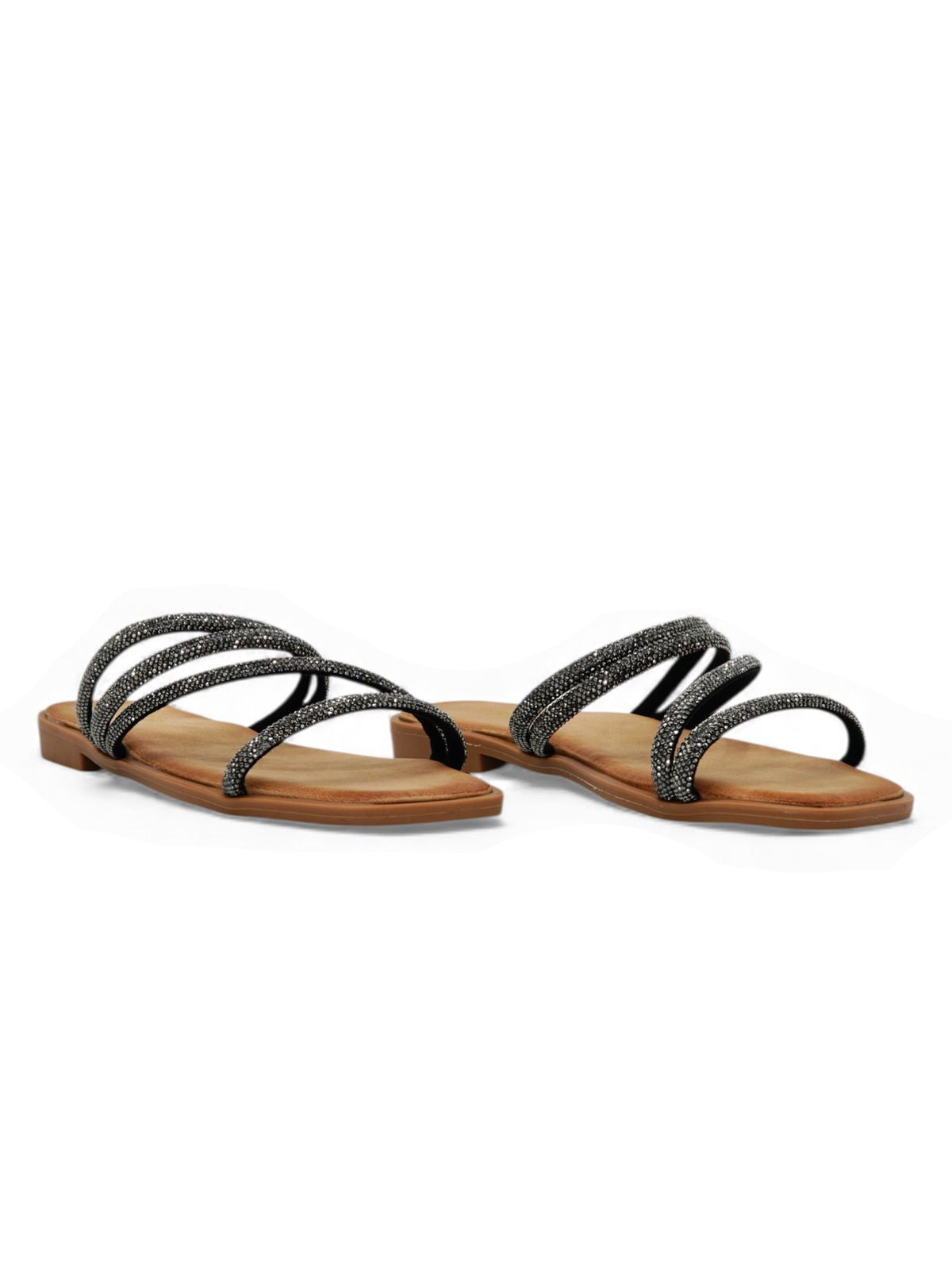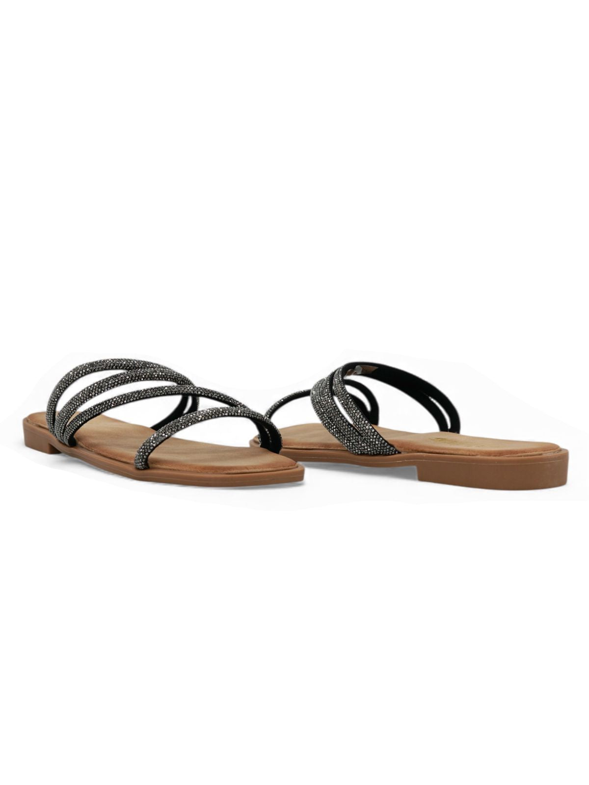 Sandalias Negras con Tiras Brillantes y Punta Cuadrada