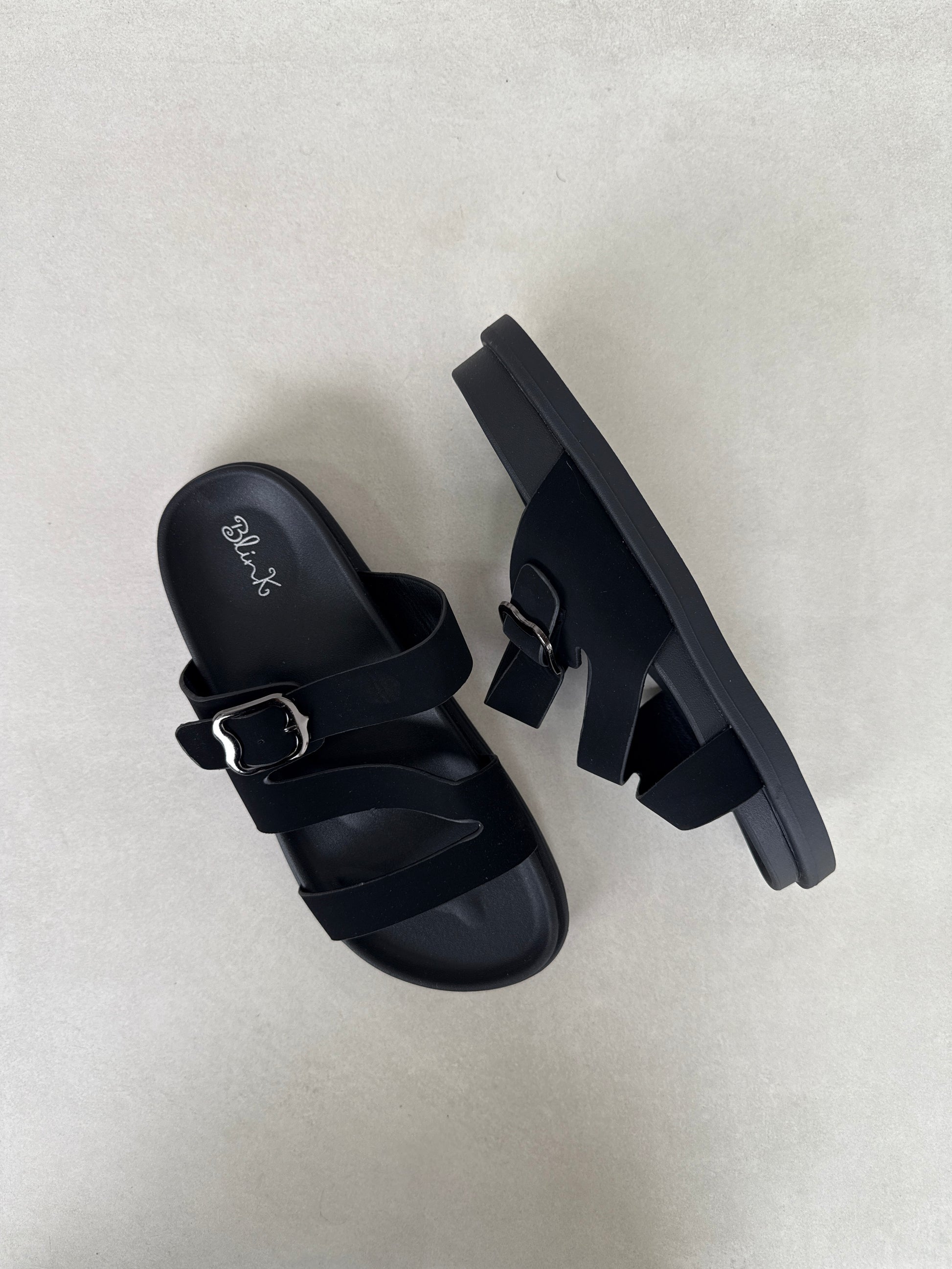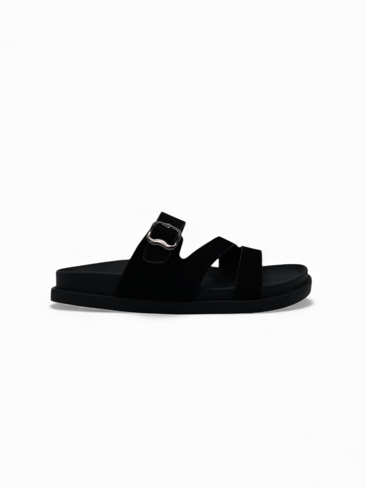 Estas sandalias negras destacan por su diseño de líneas simples y sofisticadas. Las tiras cruzadas con hebilla metálica aportan un toque moderno, mientras que la plantilla acolchonada y la suela liviana garantizan comodidad durante todo el día. Ideales para combinar con atuendos casuales o más elegantes, son un esencial versátil en cualquier guardarropa.